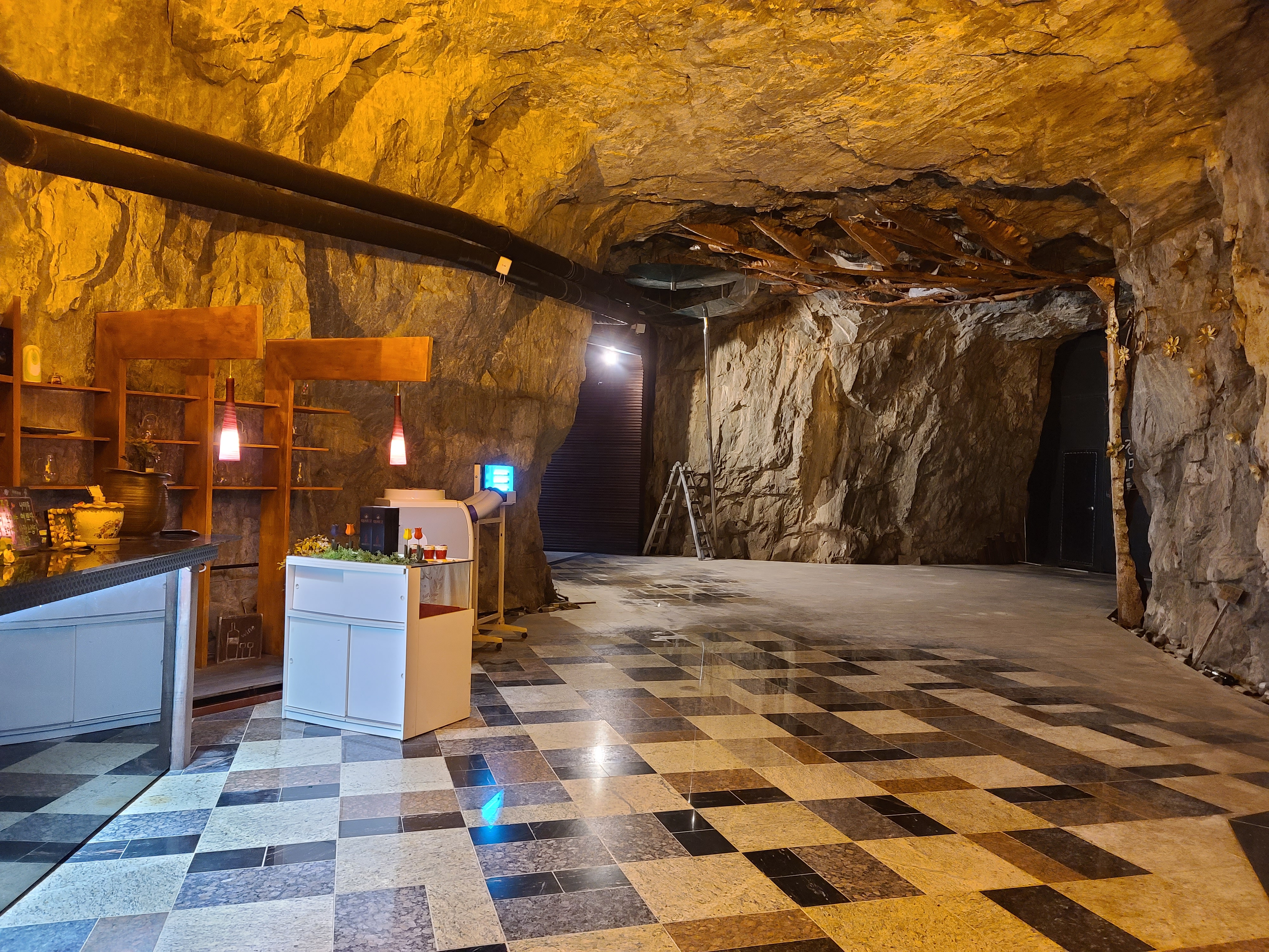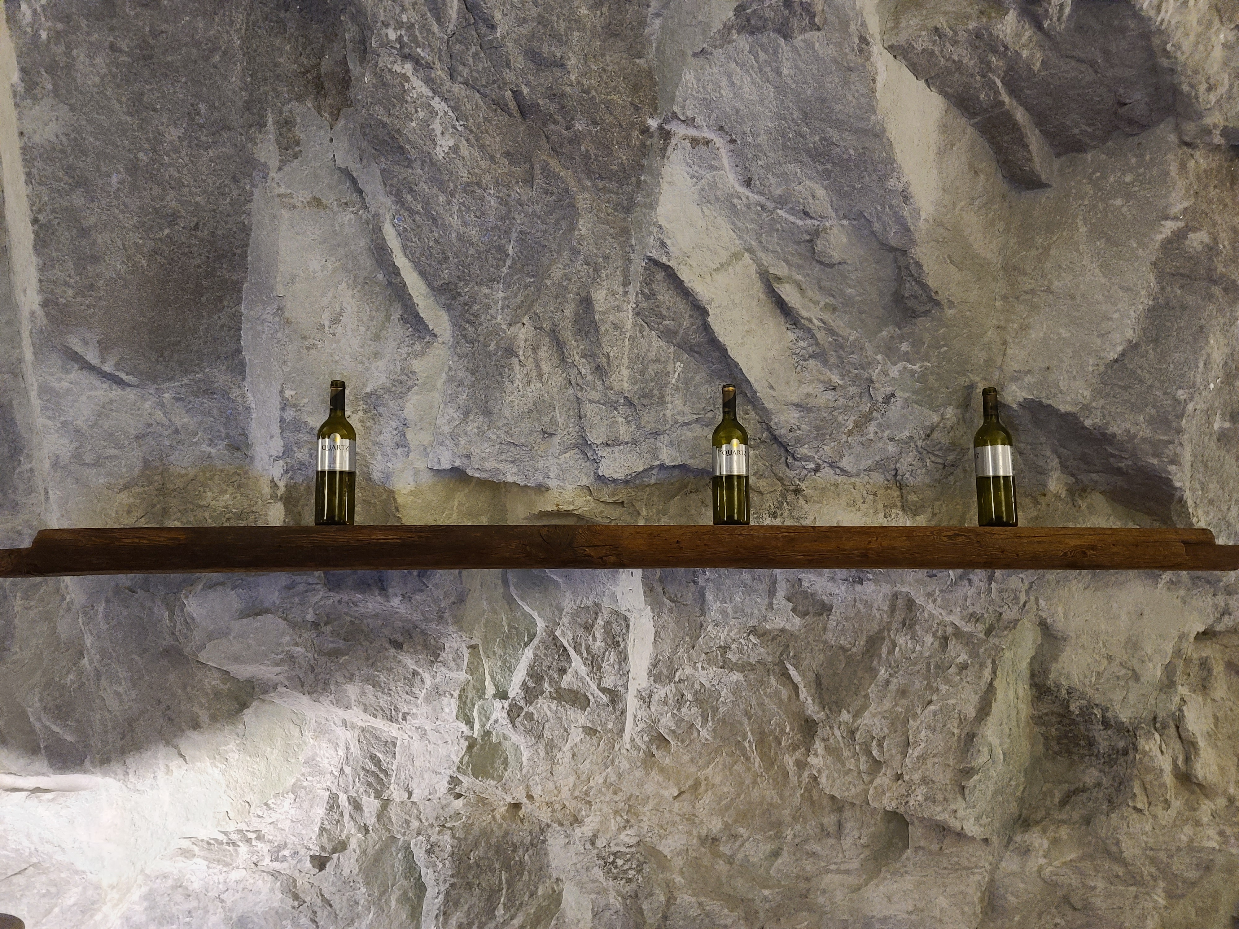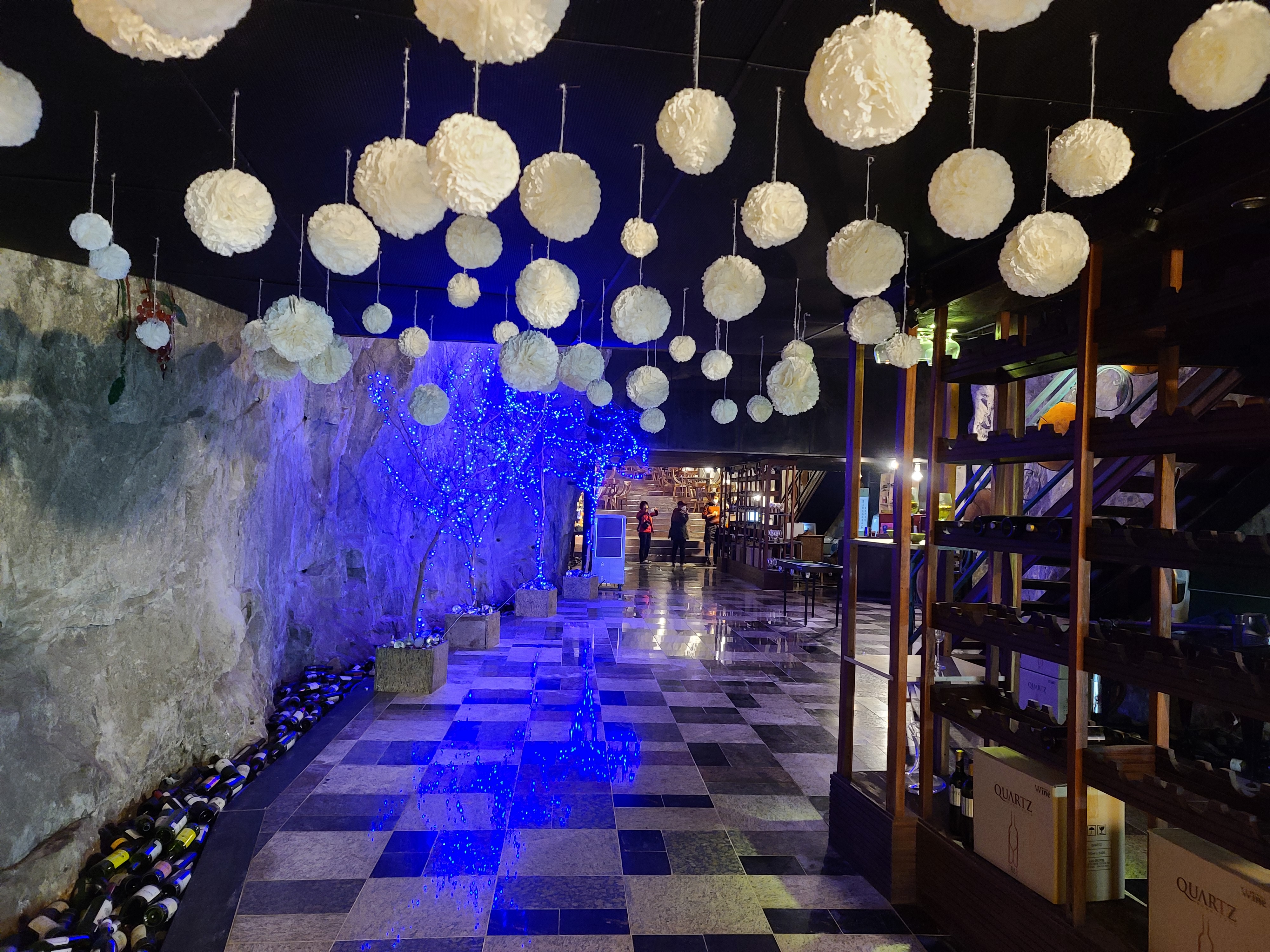 벽면의 와인 진열. 암벽은 동대산에 보았음직한 차돌(석영) 성분으로 보이기도 하고, 단단한 화강암 재질 정도? 저런 곳에서 수정을 캐낸 것인가요?