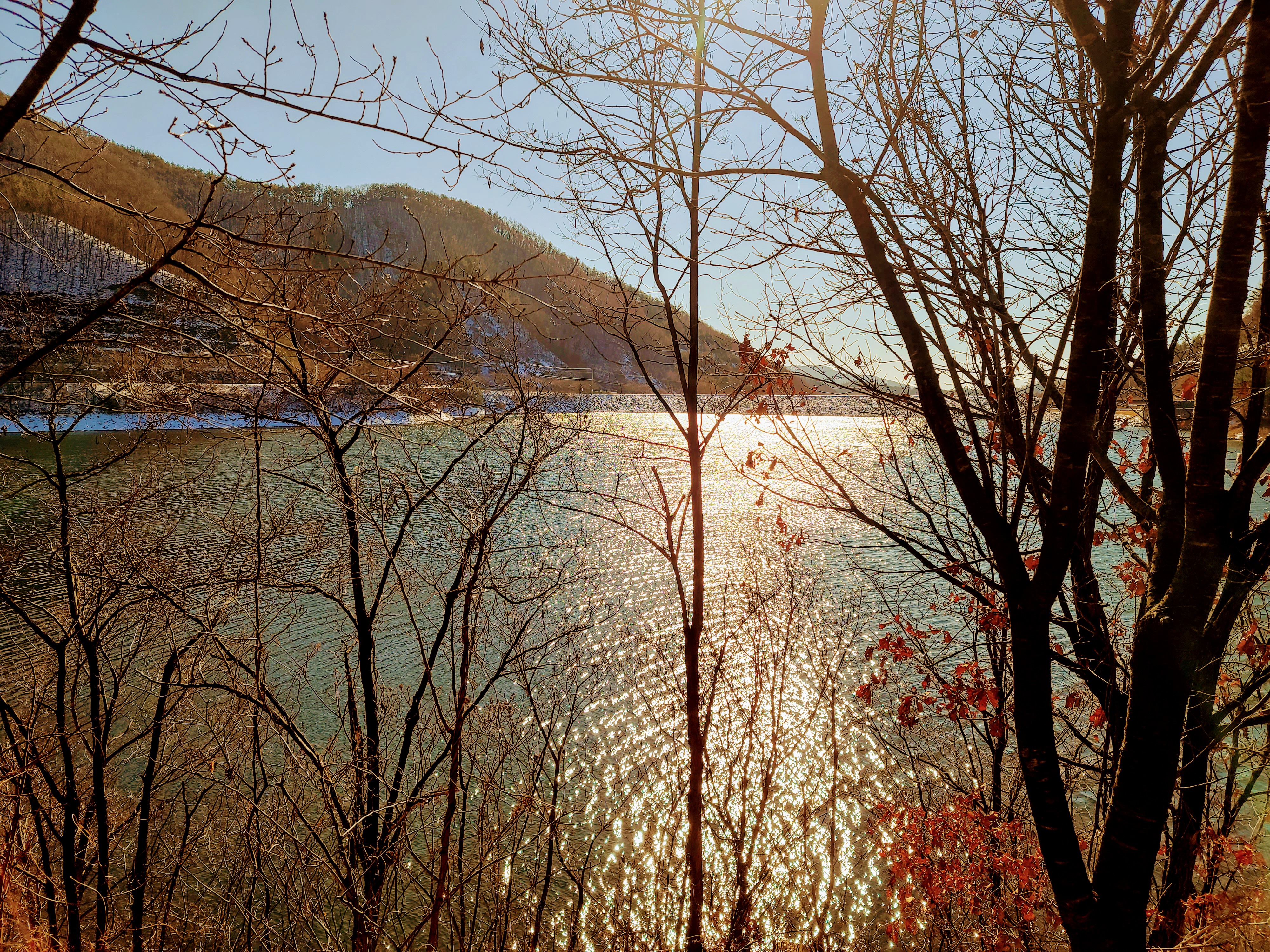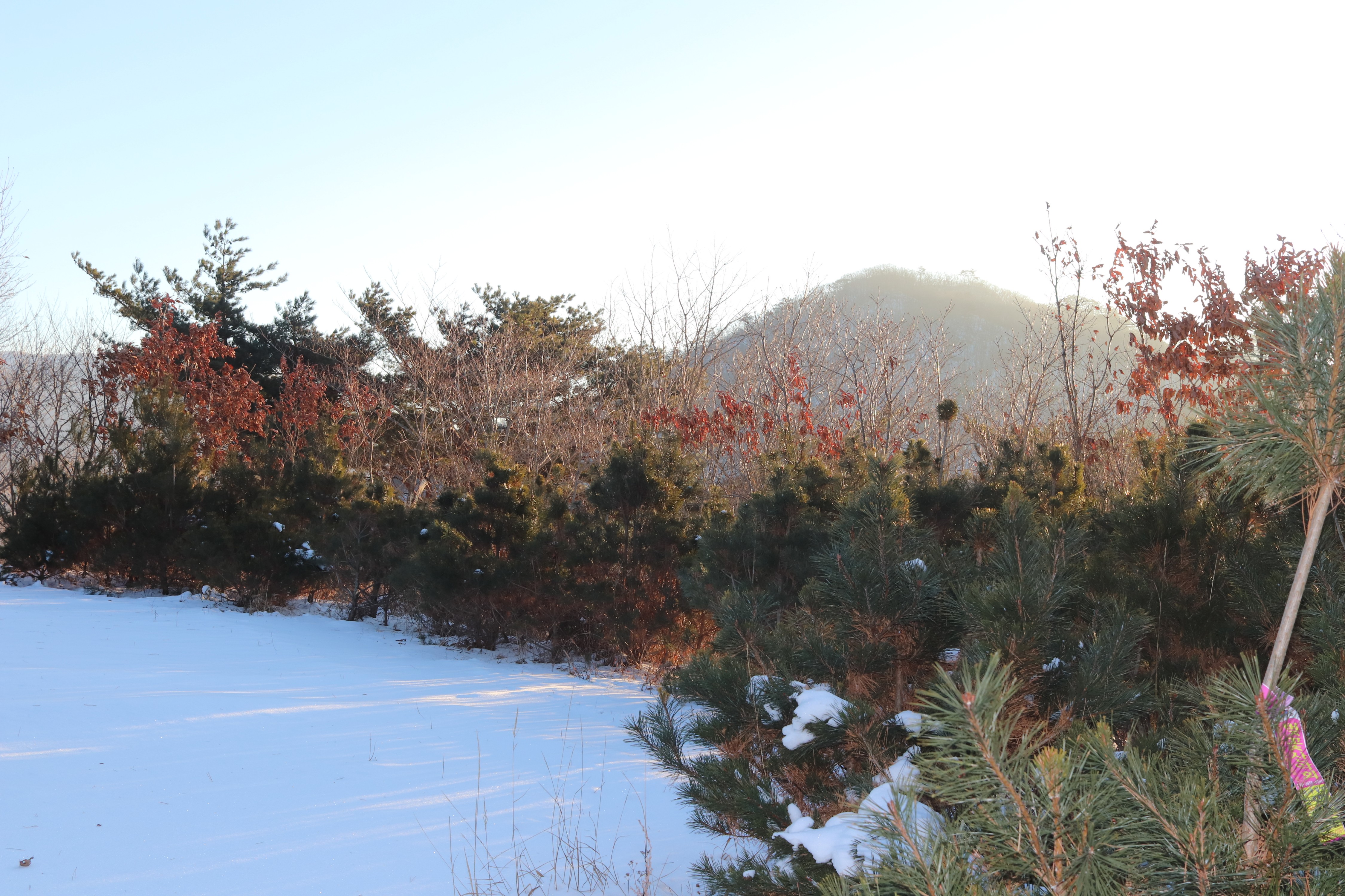 겨울 나목은 붉은색으로 반사되어 숲 속의 어둠을 밀어내고 있습니다.