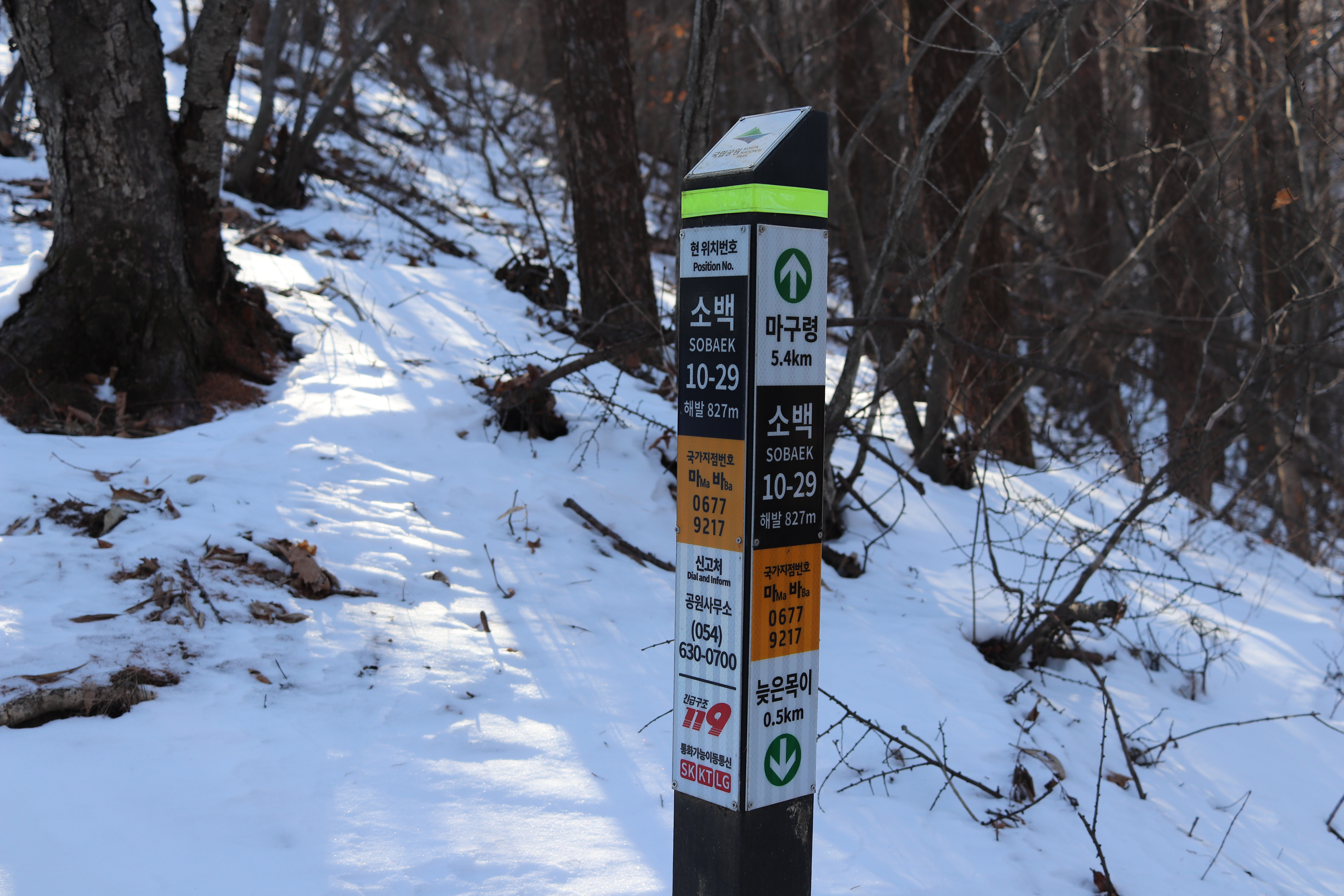 가을철 산불방지 입산통제 기간중 도래기재~늦은목이 탐방 이후 보충 산행으로 다시 찾은 경북 봉화군 물야면 생달마을, 주중의 많은 눈으로 고갯길 차량 운행의 여부가 가능한지 먼저 경북 영주시 부석면 소재 마구령까지 차량으로 올라가 봅니다. 다행히 마구령은 제설작업이 이루어져 통행이 가능하나 고갯길이 손에 땀이 날 정도로 아주 조심스러웠습니다.
