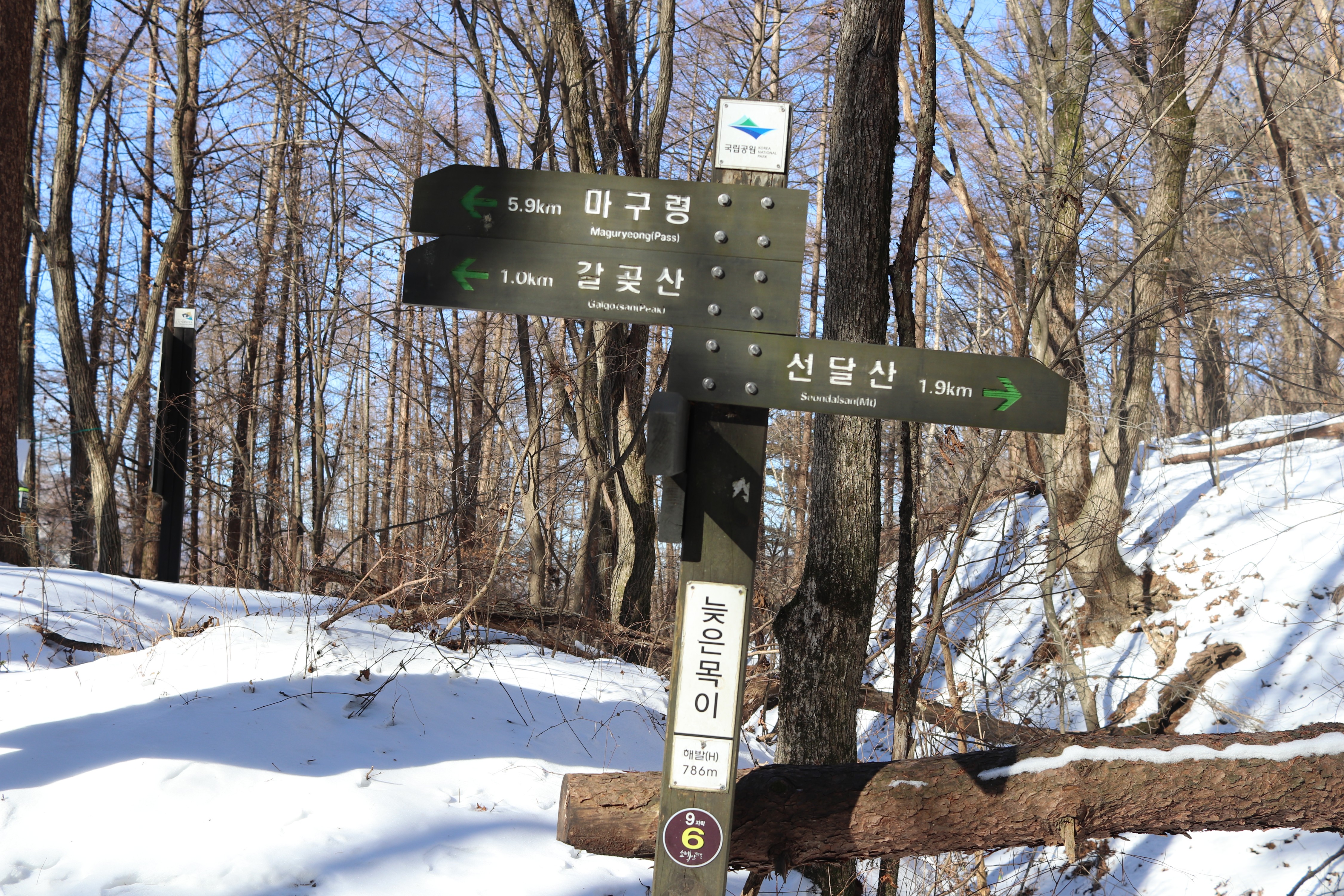 우측으로는 선달산 박달령으로 이어집니다. 좌측 1km 갈곶산으로 향합니다.