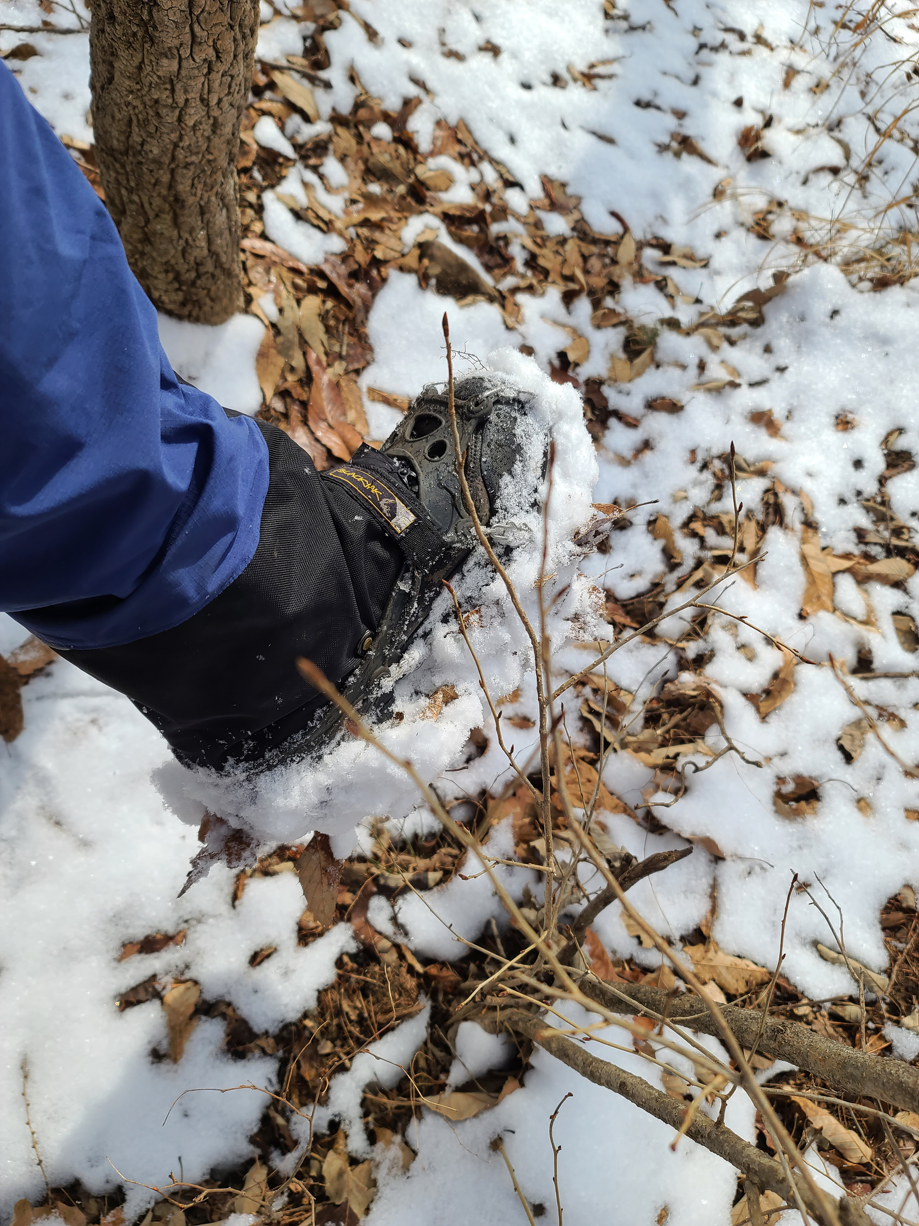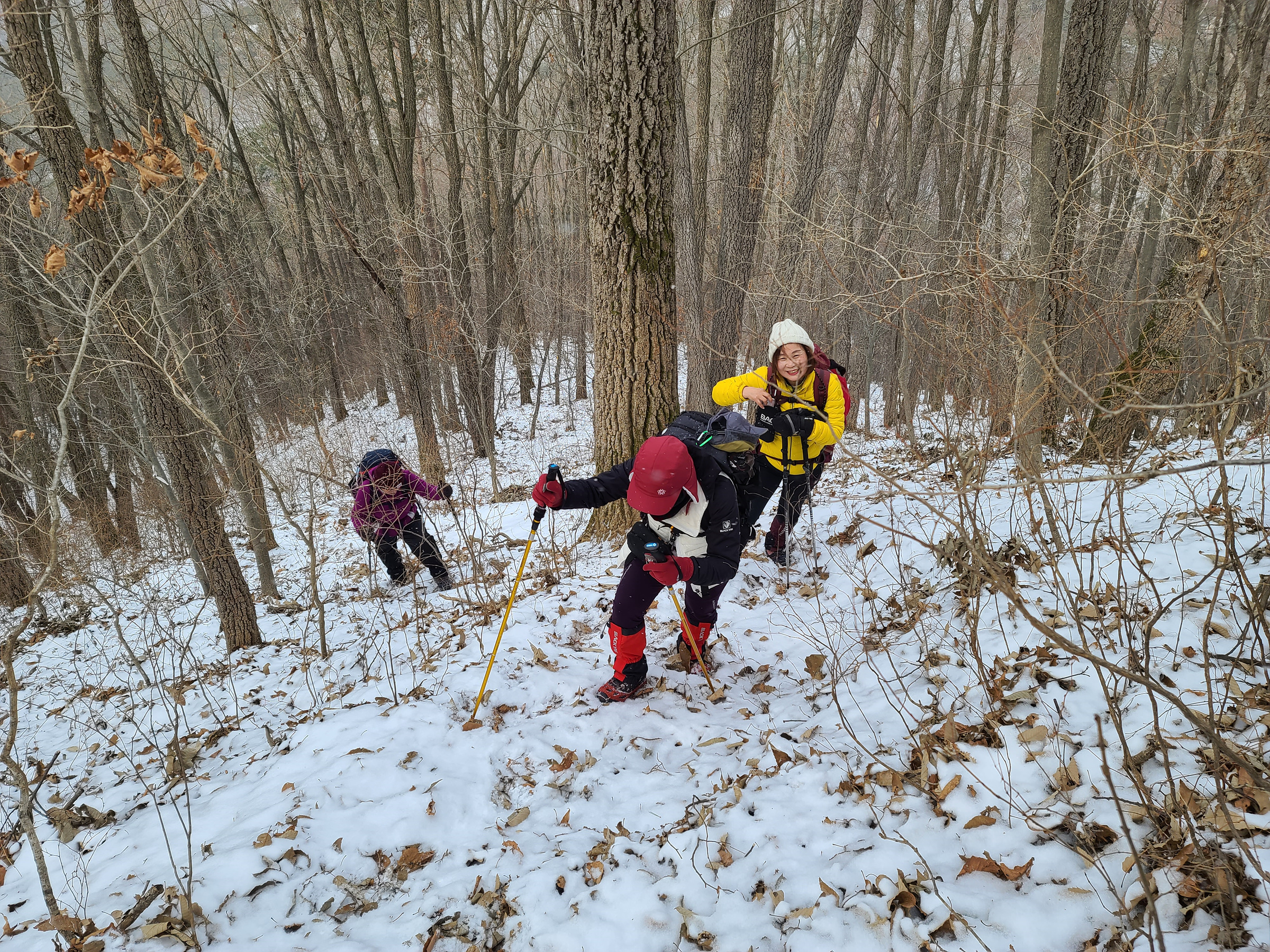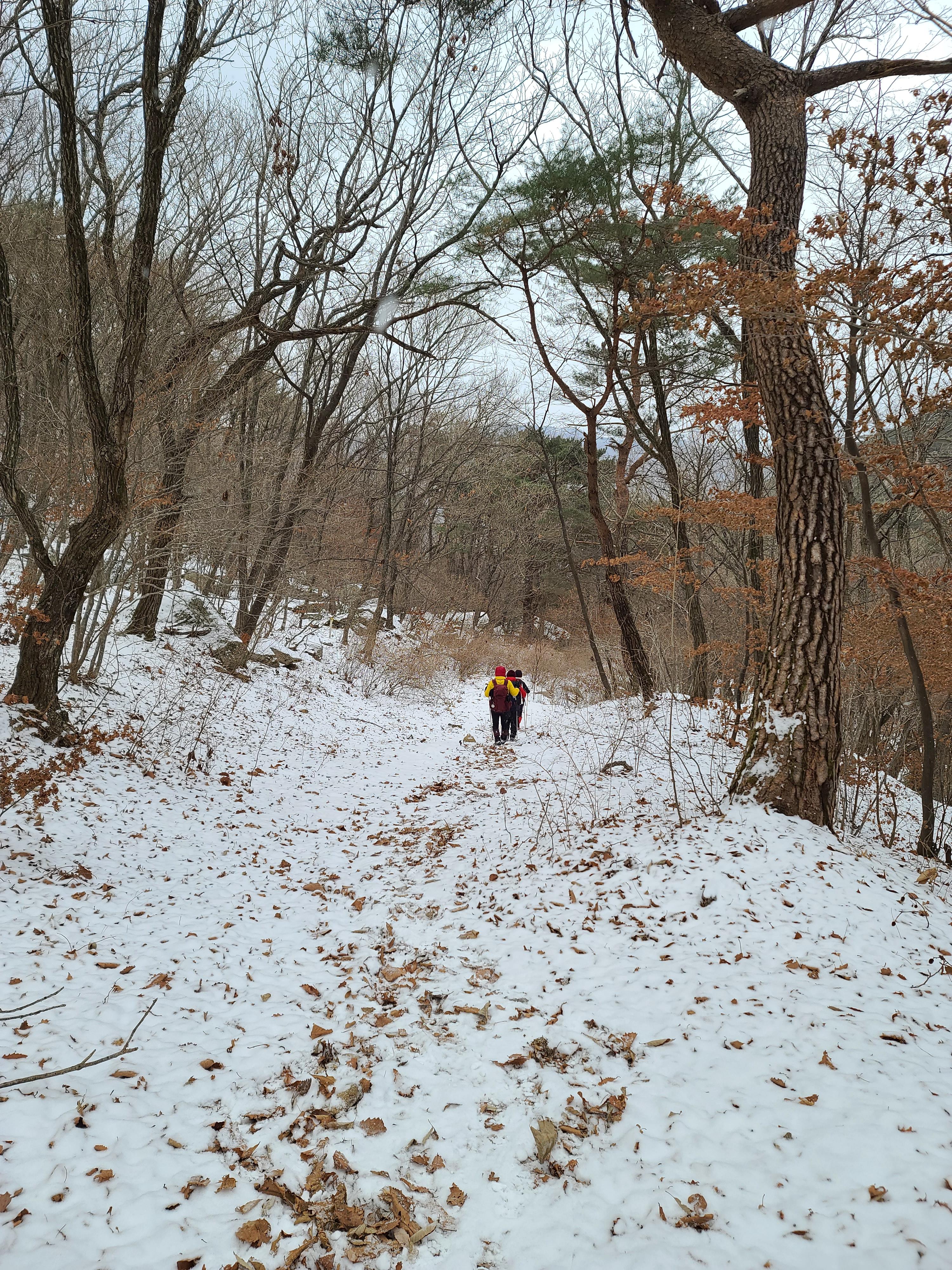 오늘의 복병은 따로 있습니다. 몇 걸음 옮기면 달라붙는 눈과 낙엽으로 털어 내느라 가다 서다를 반복합니다.