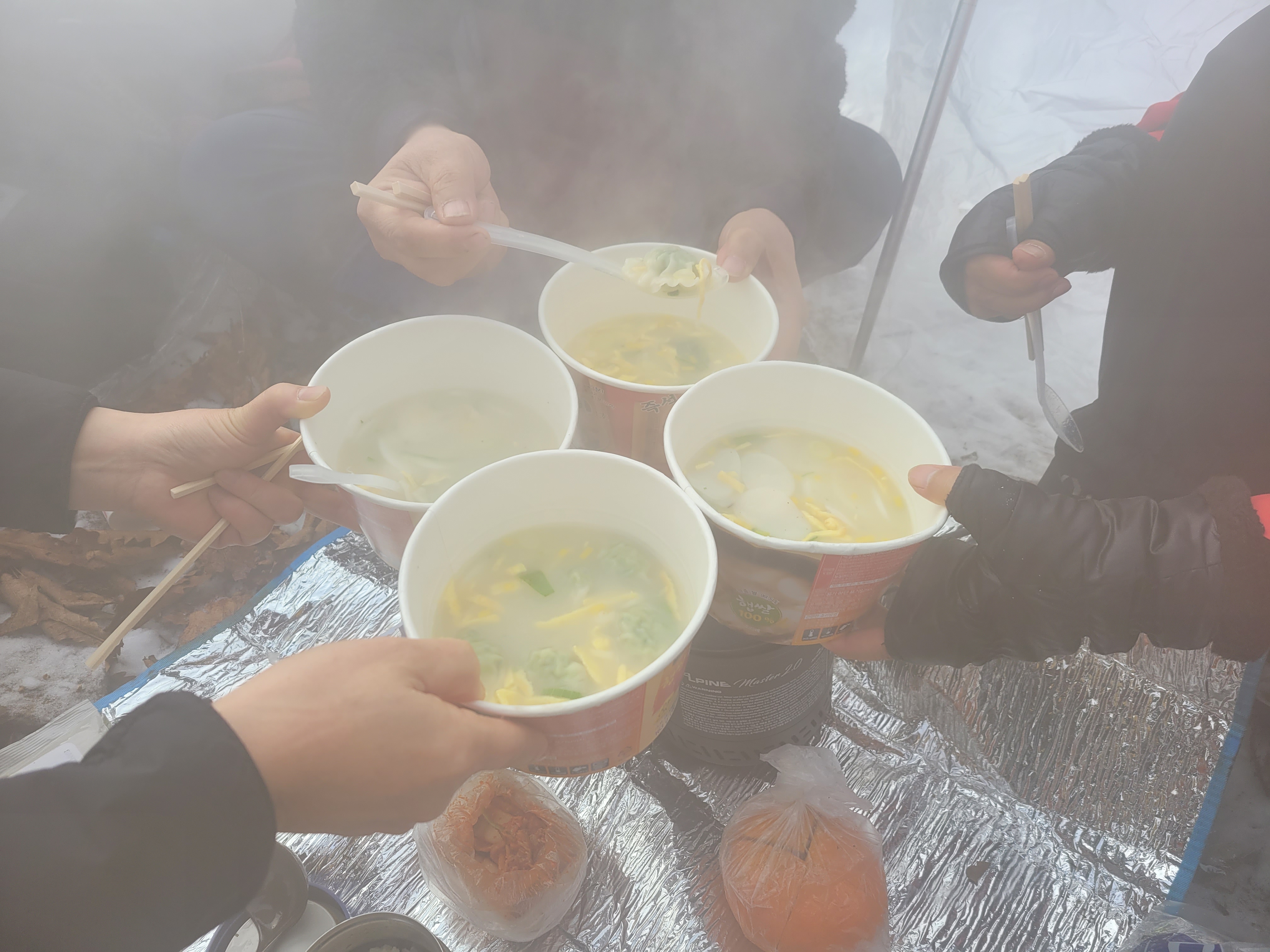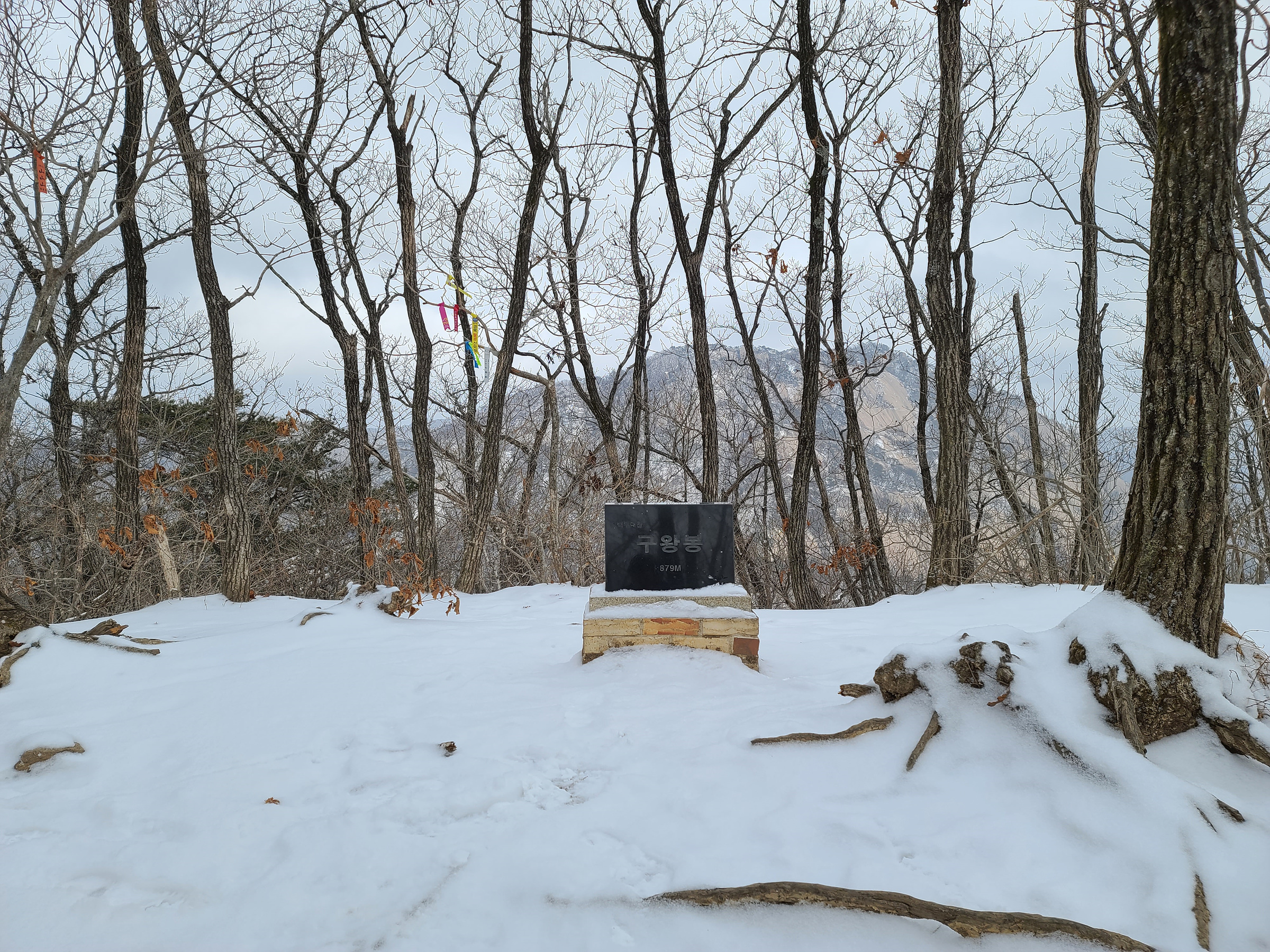 구왕봉 정상에 오릅니다. 정상은 참나무 숲에 가려 조망이 가립니다. 희양산의 조망 포인트는 지름티재로 하산에 있습니다. 비닐을 뒤집어쓰고 새해 산상 오찬을 떡국으로 합니다. happy new year
