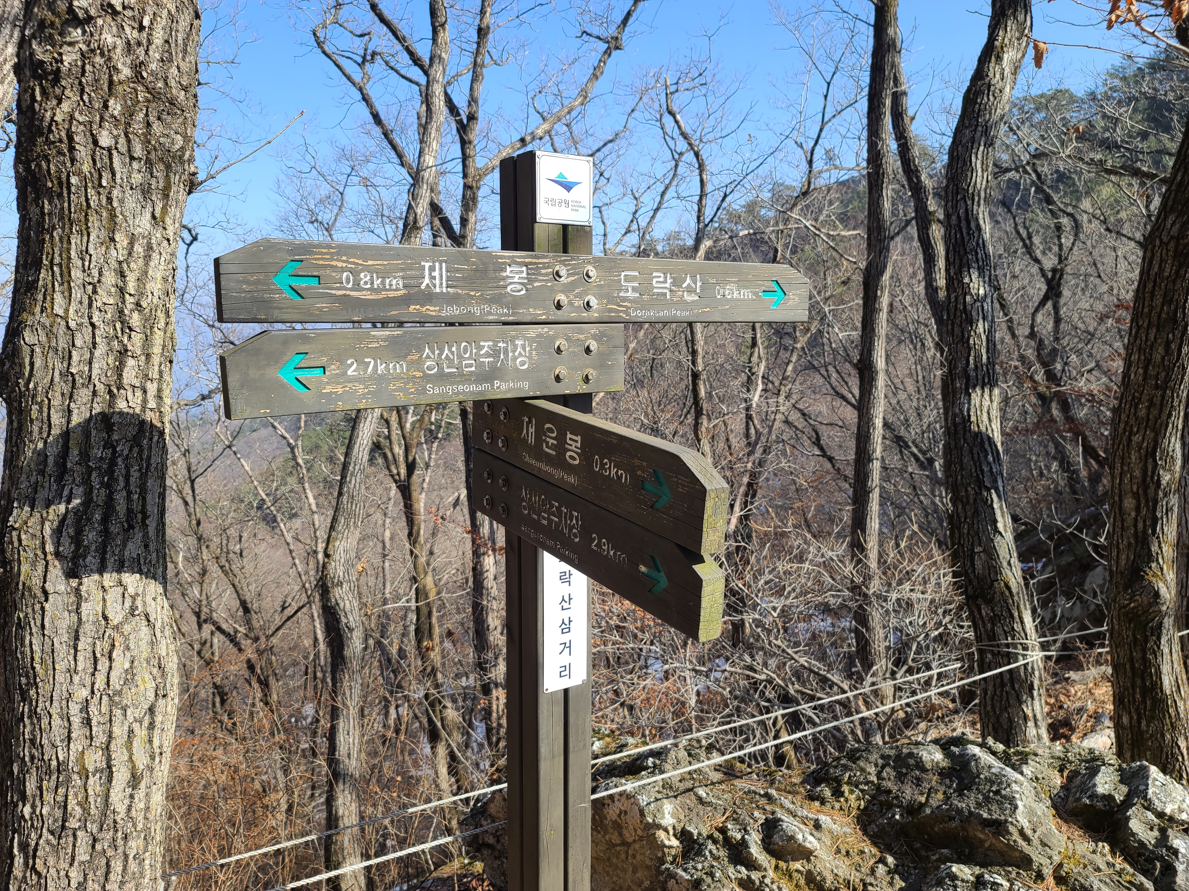도락산 삼거리 정상까지 0.6 km. 정상을 다녀온 후 여기서 채운봉으로 하산합니다.