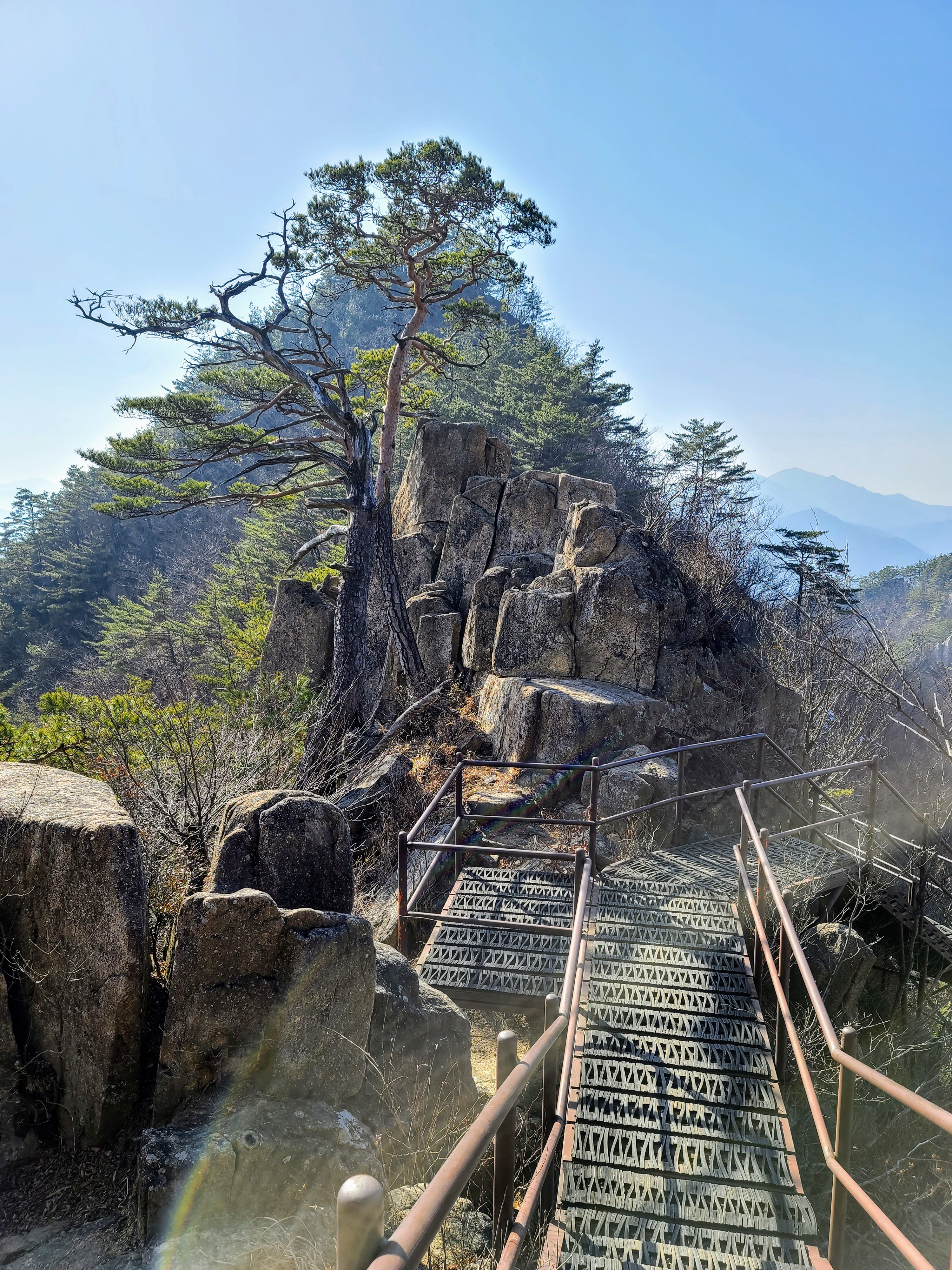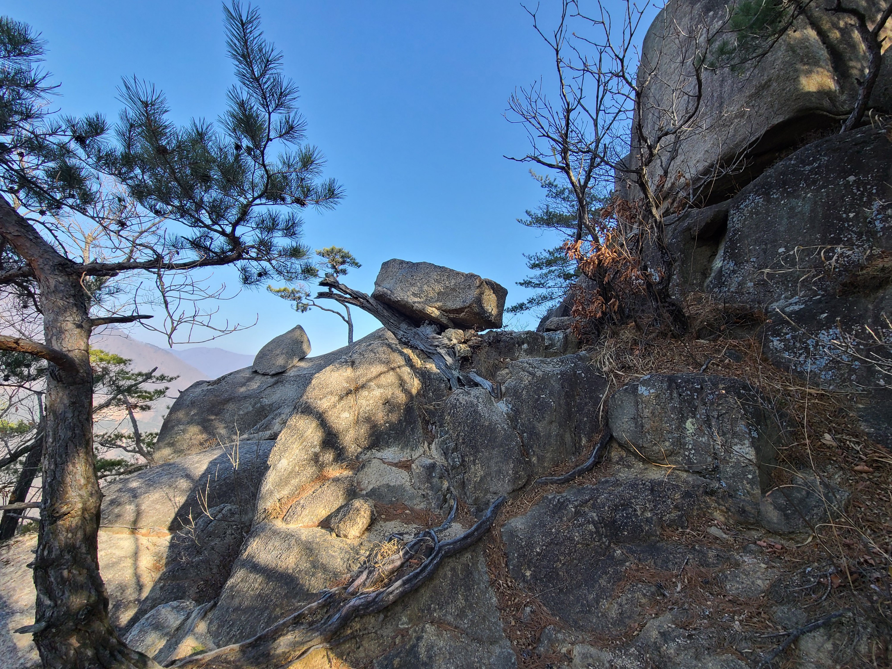 한동안 힘겹게 올라 능선에 올라서면 바위와 소나무의 조화로움에 흠뻑 빠지며 카메라 셔터를 누르기 시작하지요.