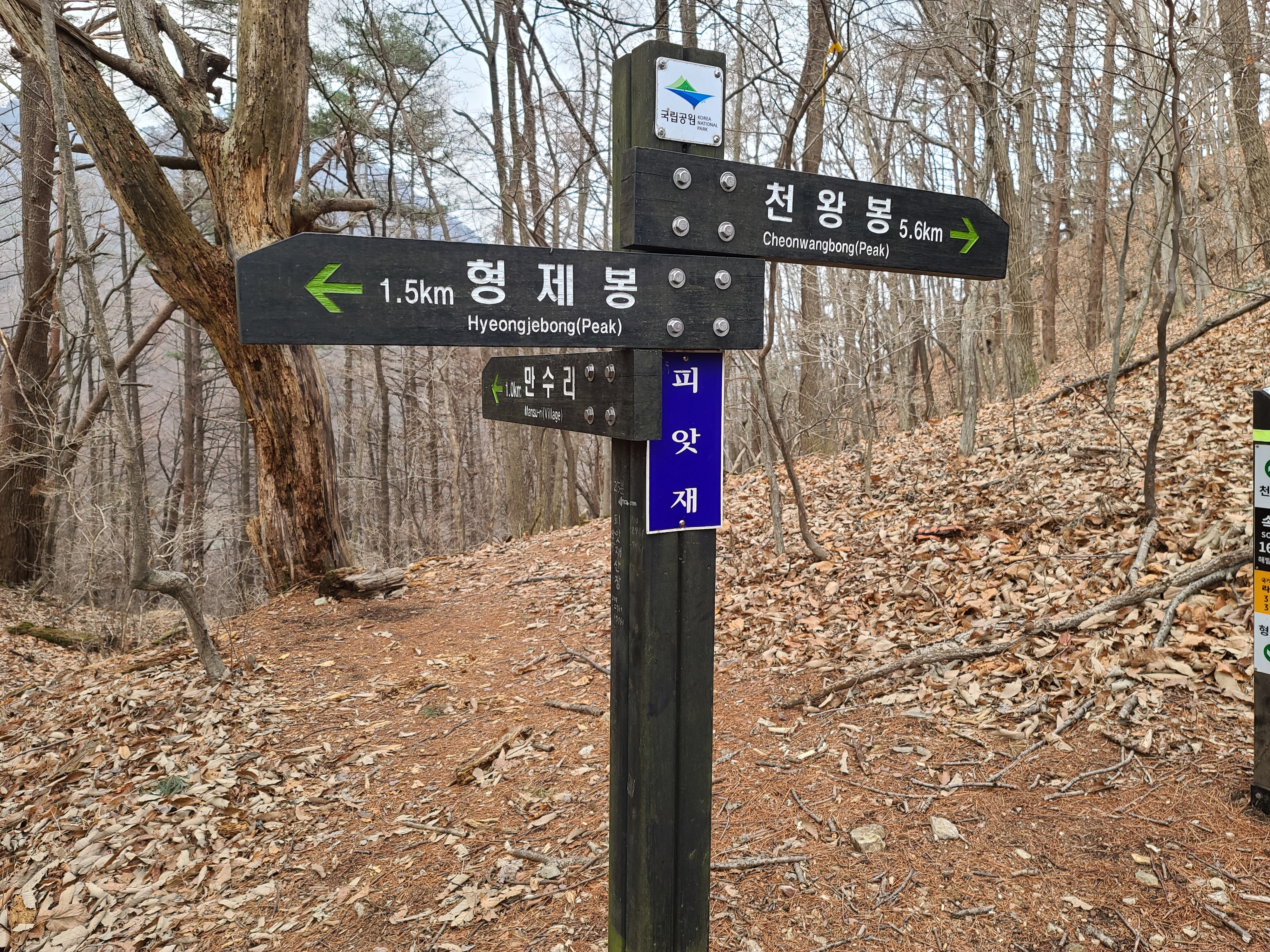 만수리에서 꾸준한 발걸음으로 1km를 지나면 멀리 형제봉 방향과 천왕봉 방향으로 갈라지는 재를 만나는데 이곳이 20구간 갈령부터 시작되는 백두대간 접속지점인 22구간 피앗재입니다. 인증 장소라 땀을 식히고 갑니다.