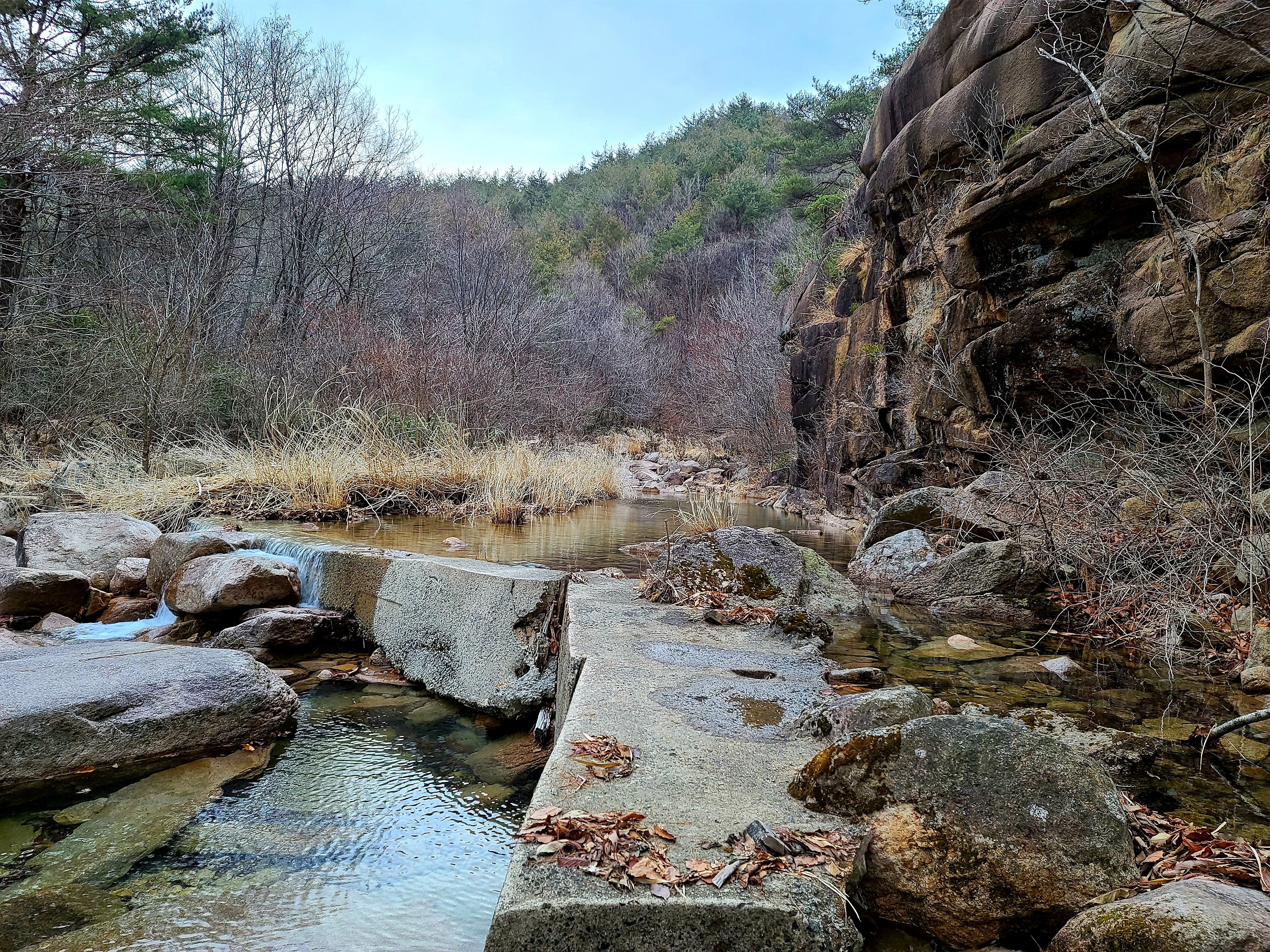 만수계곡은 속리산 천황봉에서 발원한 삼가천에서 삼가저수지에 이르는 4㎞의 계곡입니다. 여름철 물놀이 휴양지로도 유명한 만수계곡의 입구에 들어서니 "세속의 발걸음이 멈추는 만수계곡"이라는 빗돌이 마을 입구에 서있습니다. 과연 세속의 발걸음을 멈출만한 곳인가. 잠시 궁금해지는 순간 실망하는 이유는 겨울 건천의 모습이었습니다. 한 여름에 와야 그 이유를 알 수 있을지 생각하며 발걸음을 재촉하니 피앗재 산장이 와 닿습니다. 인적이 없어 지나치지만 대간 산객에겐 꿀 같은 휴식처로 알려진 피앗재 산장입니다.