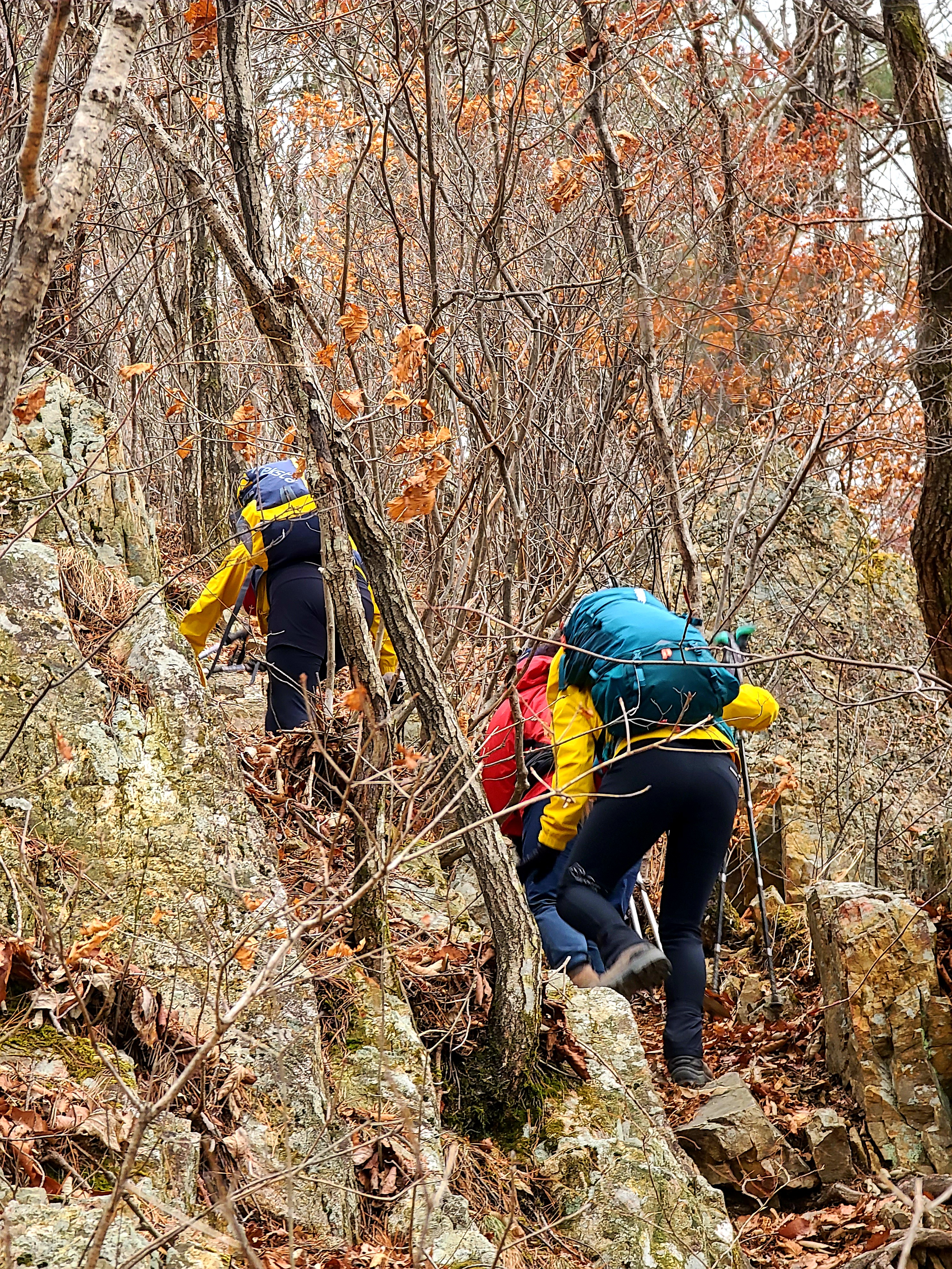 마지막 300 미터 지점은 깔딱입니다. 질척이는 흙을 피해 나무 가지를 의지하며 오릅니다