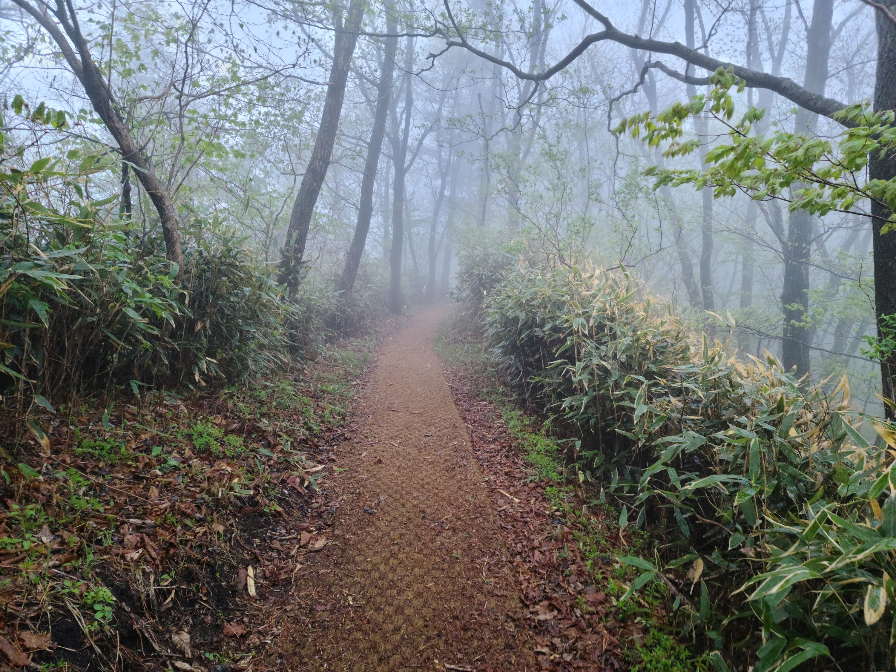 야자수 매트의 등산길이 포근하긴 한데... 새벽안개와 가끔씩 부슬거리는 비는 신비감? 몽환 감?..........