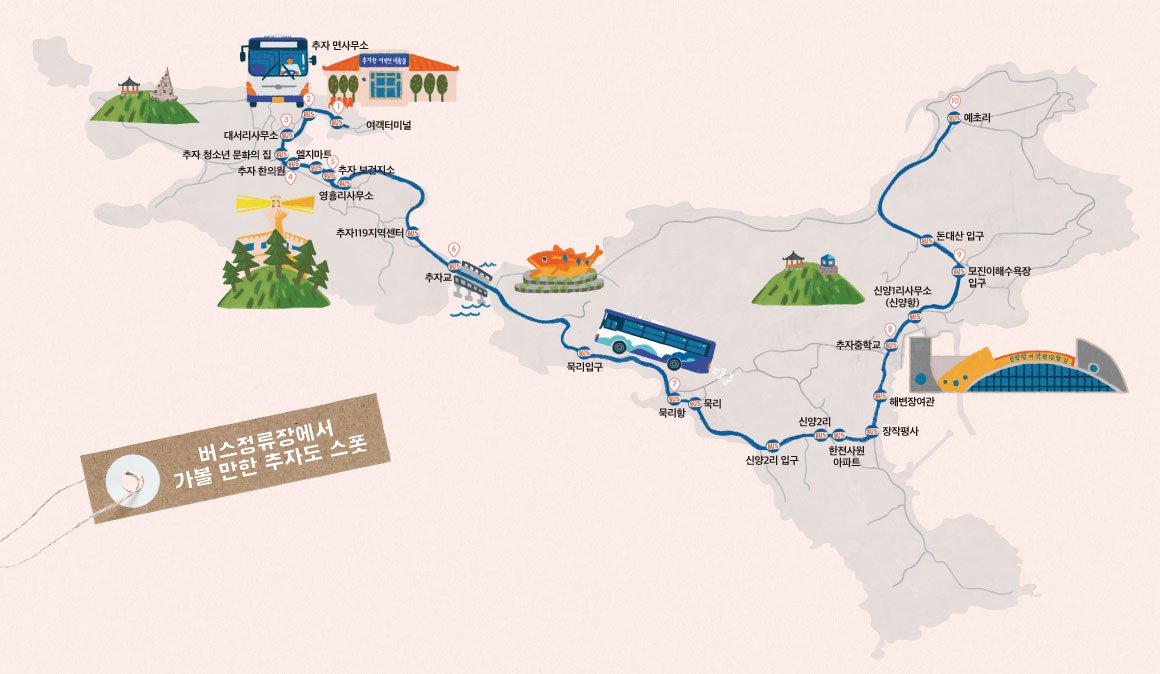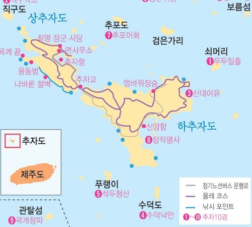 버스정류장에서 가볼 만한 추자도 스폿 「낚시꾼들의 성지이자 올레꾼들의 필수 코스인 추자도는 사실 낚시와 올레길만으로 설명되지 않는 다채로운 매력을 가지고 있다. 추자군도부터 마을 전경, 바다와 몽돌해안까지 추자도의 곳곳을 담는 포토존. 색다른 제주를 프레임에 담아보고 싶은 여행자에게 떠오르는 인생 샷 성지 추자도에서의 포토존 투어를 추천한다.