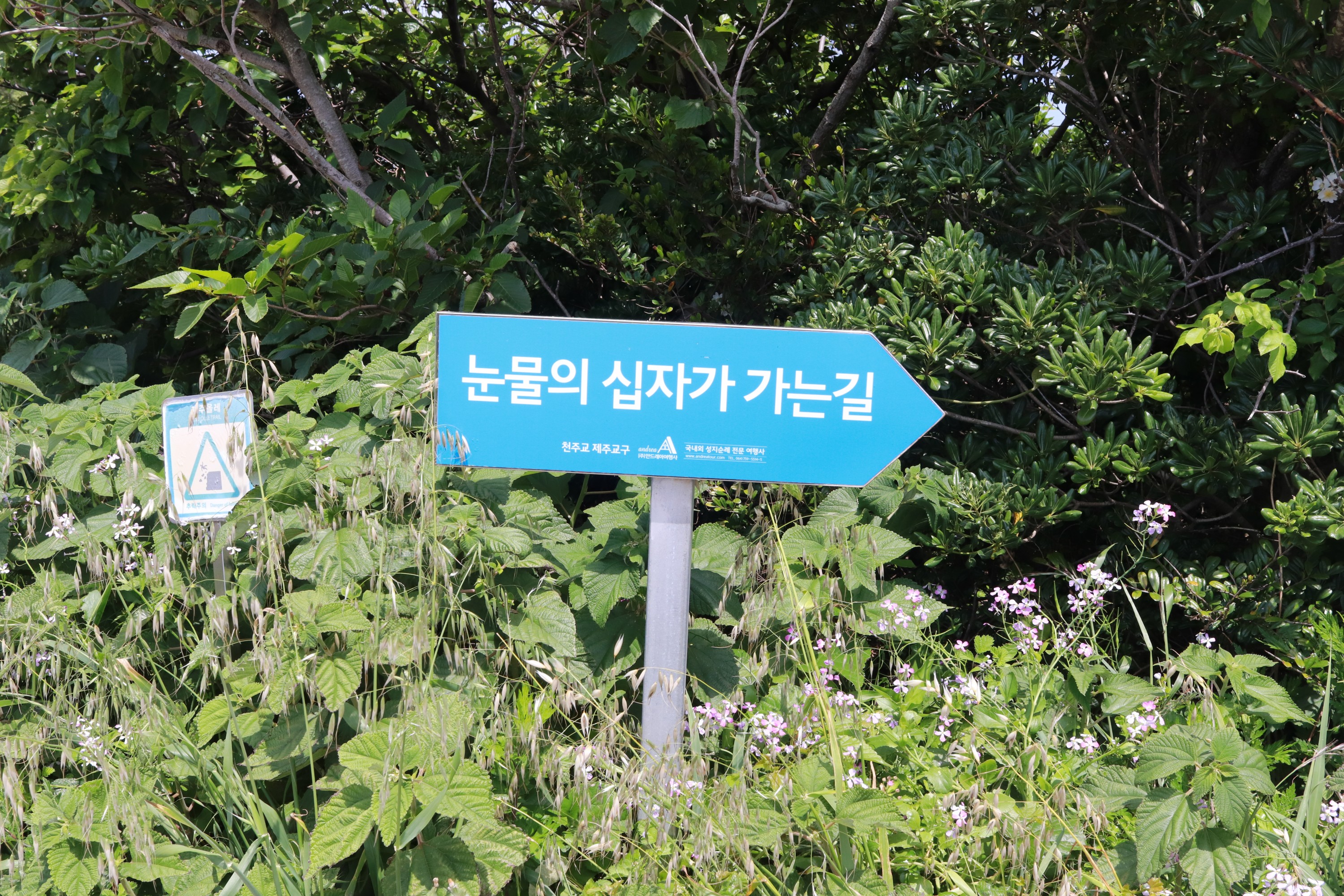 추석산 소원길 갈림길을 지나며 눈물의 십자가를 따라 이동하고