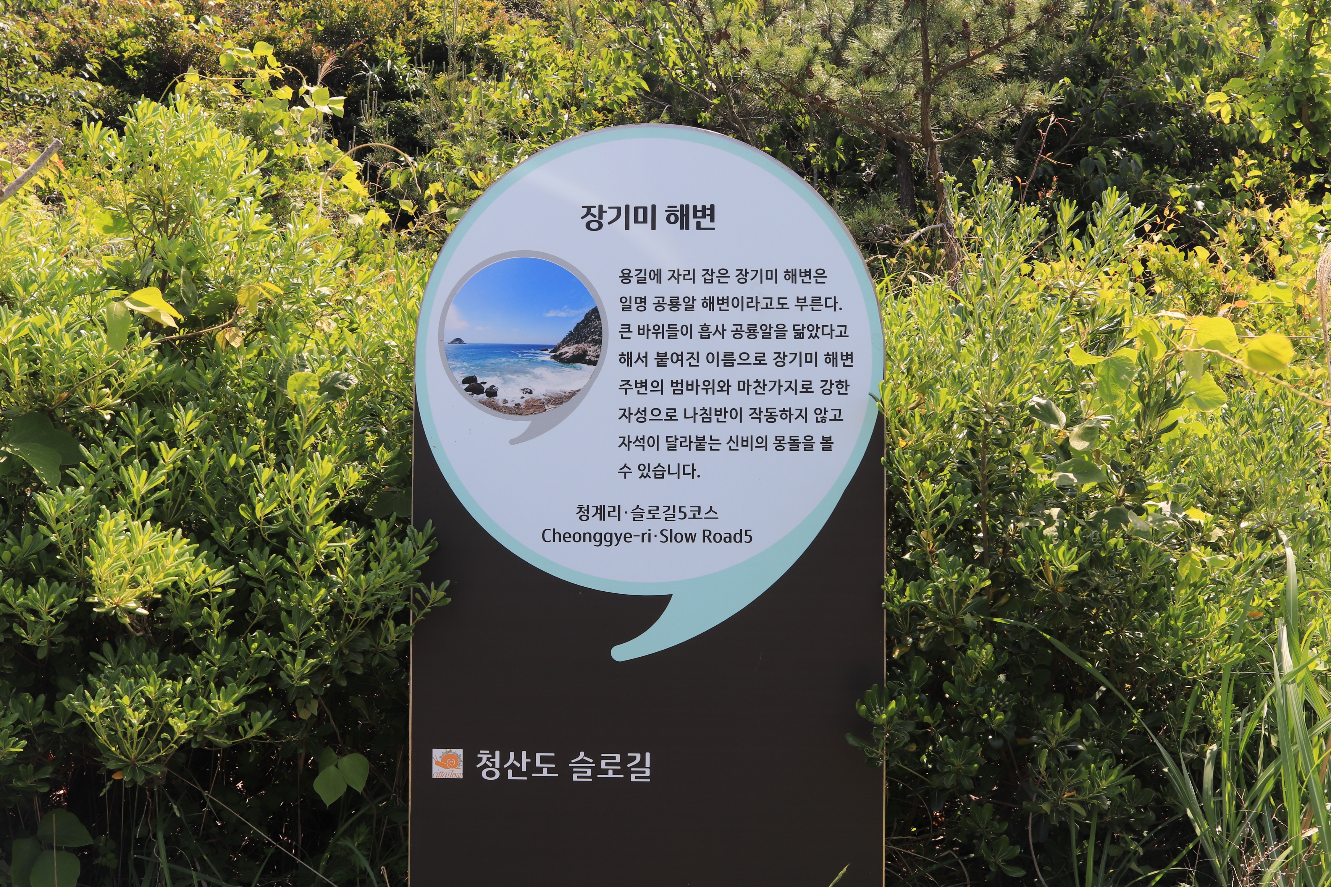 청계리 → 범바위 입구 삼거리 → 장기 미 해변 → 칼바위 전망대 → 범바위 → 말탄바위 → 권덕리마을회관 순으로 이동합니다.