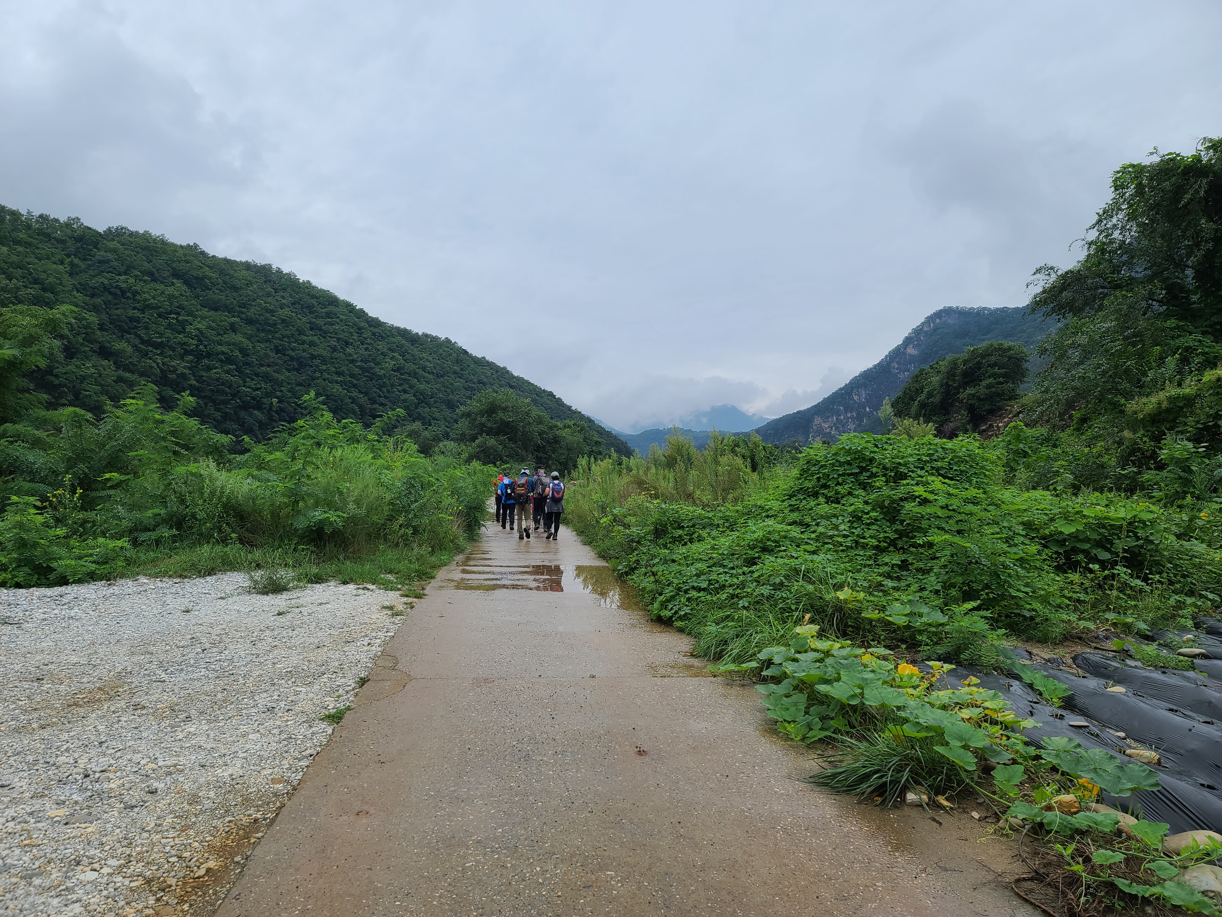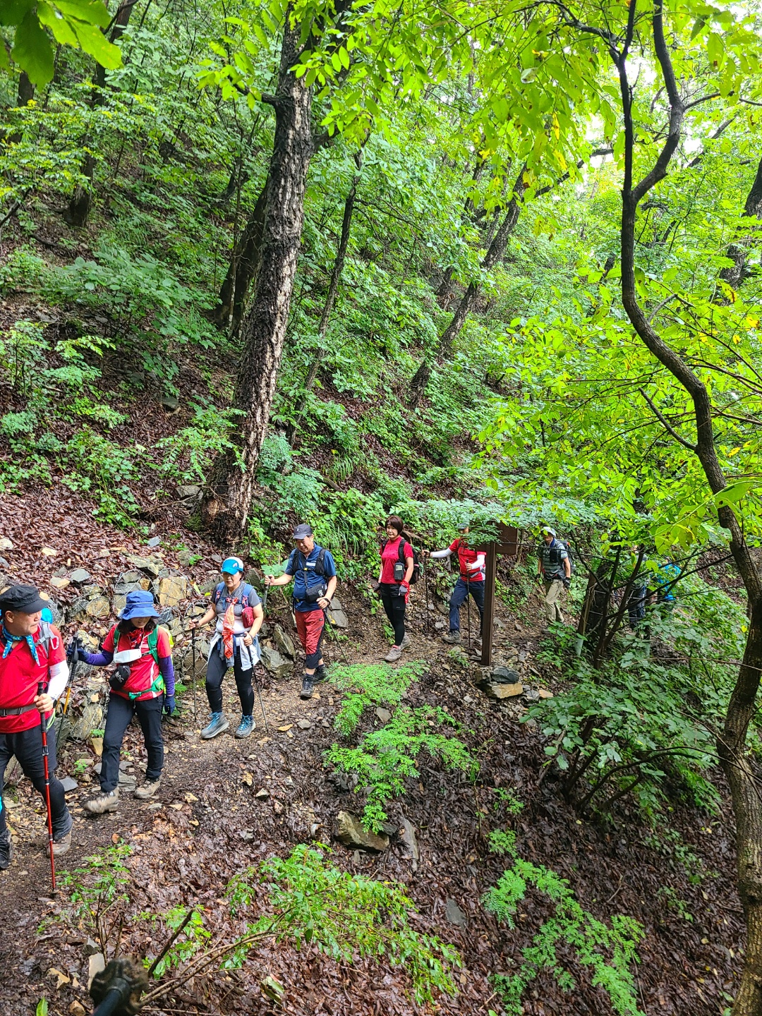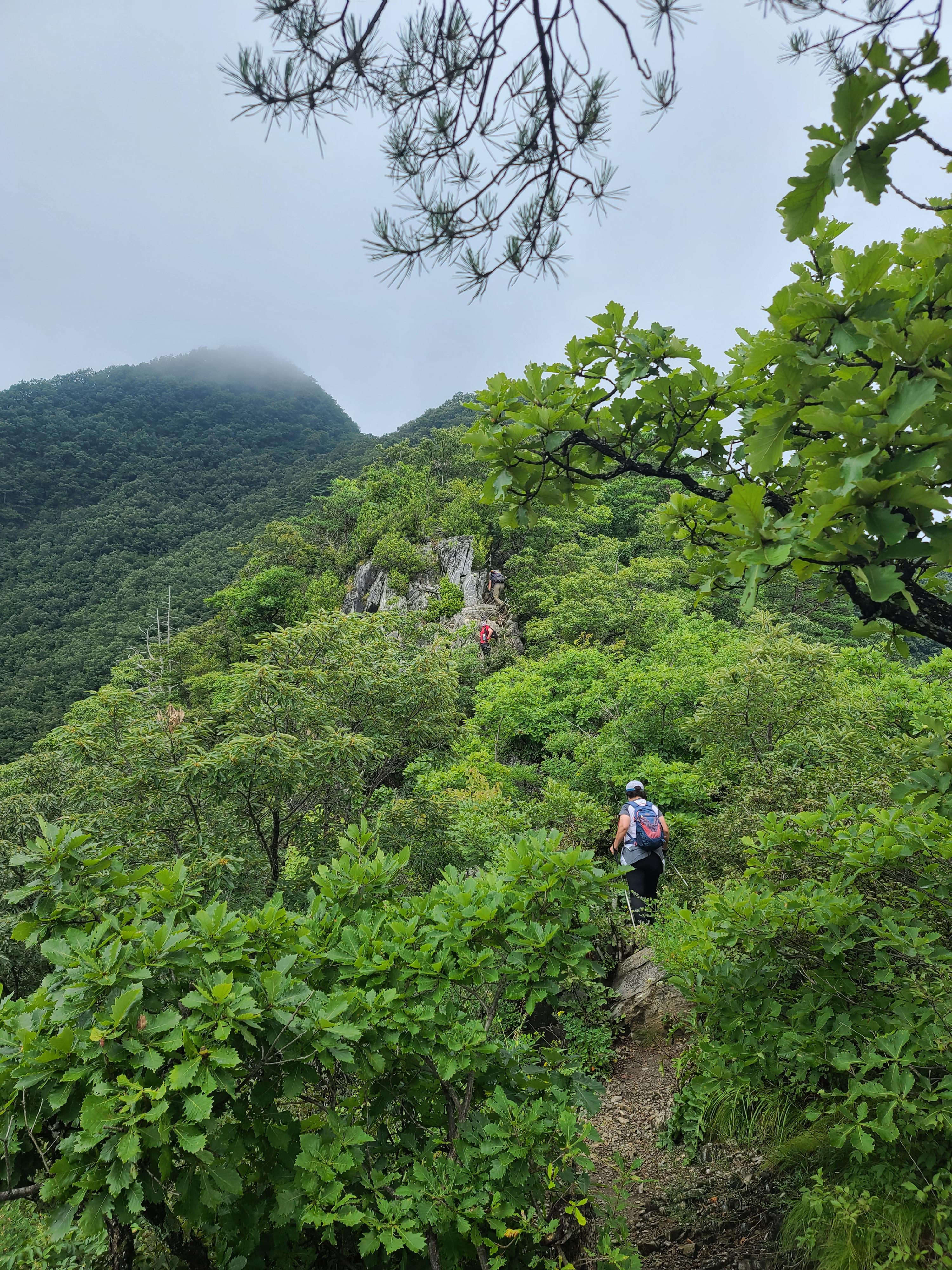 편안한 진입로와 사면으로 이어지는 육산의 등산길이 포근하다. 물론 여기까지이지만... 짙은 초록이 마지막 가는 여름을 자랑하고 밤새 내린 비에 잎새는 영롱함을 더한다. 어쩌다 나뭇가지를 스치면 빗방울이 후두득 떨어져 온통 옷을 적신다. 시원하다! 코끝에 숲 냄새가 고스란히 밀려 들어와 폐에 와닿는 것 같다. 내가 살아 있음을 느끼게 해 준다.