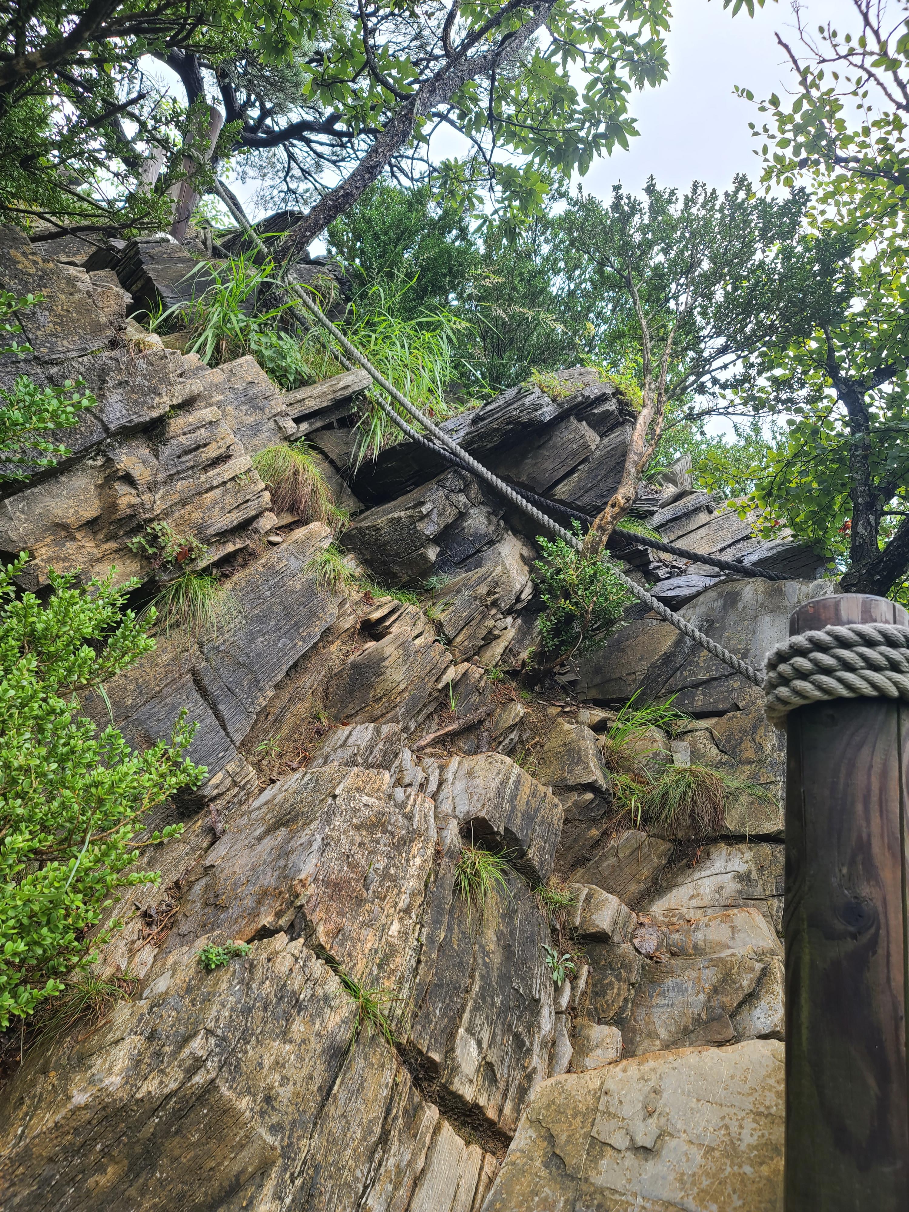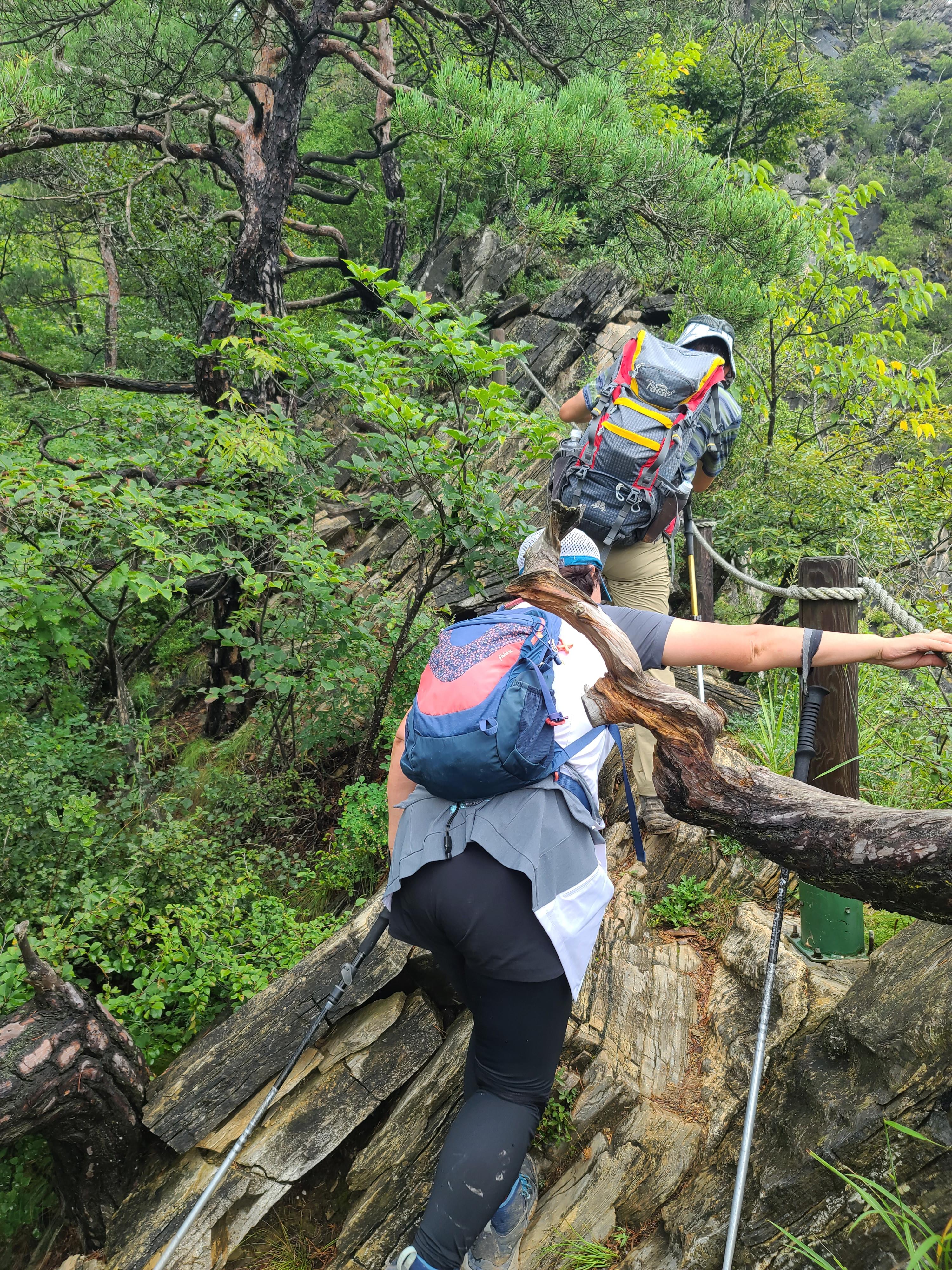 로프에 의지한 채 미끄러운 바위틈을 딛고 정상을 향한다.