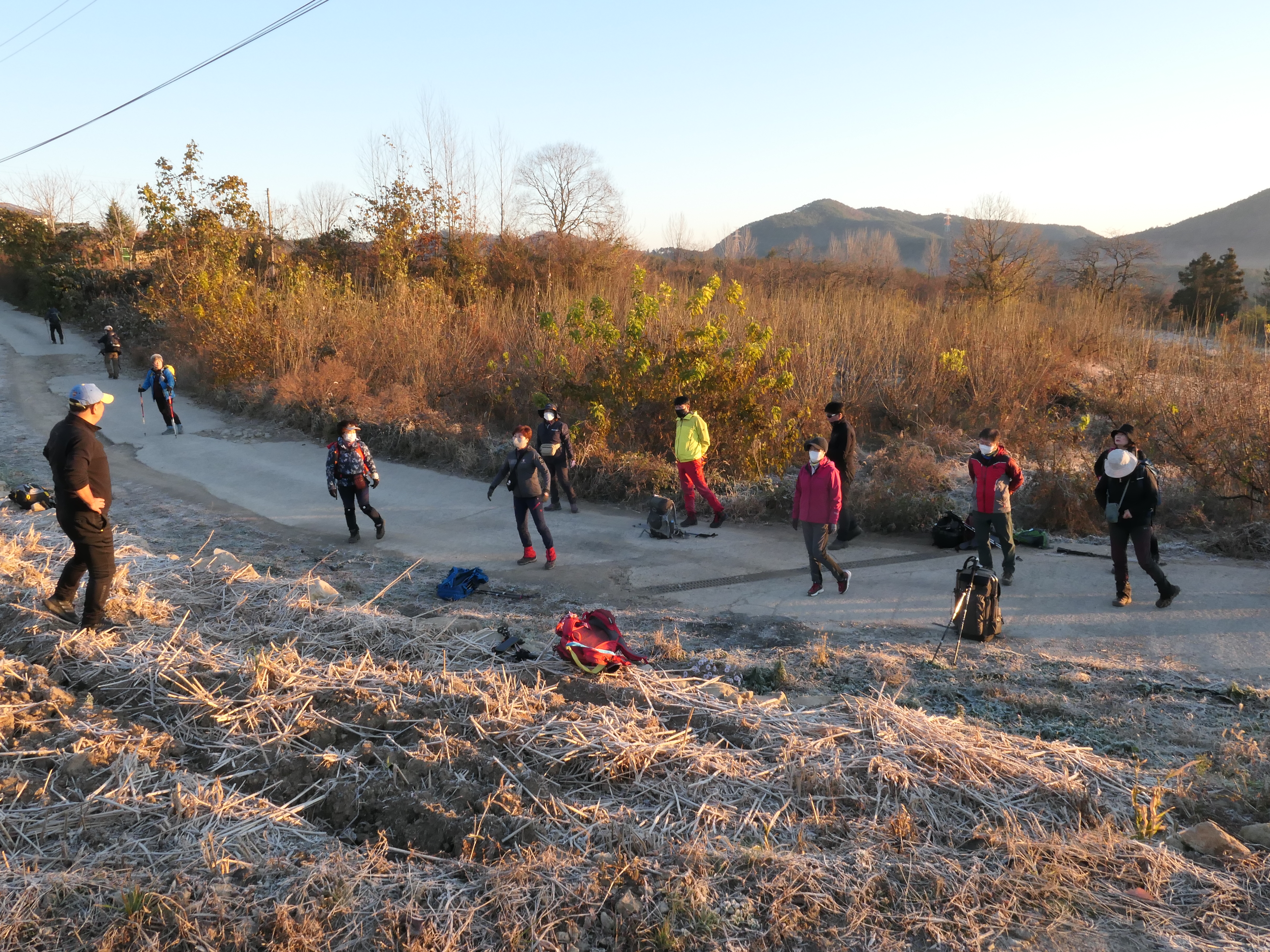 전남 화순의 서리 맞은 들녘에서 산행전 가볍게 워밍업을 한다. 화순은 면적의 70%가 평지라 무등산은 화순의 지붕과 같은 곳이라 한다.