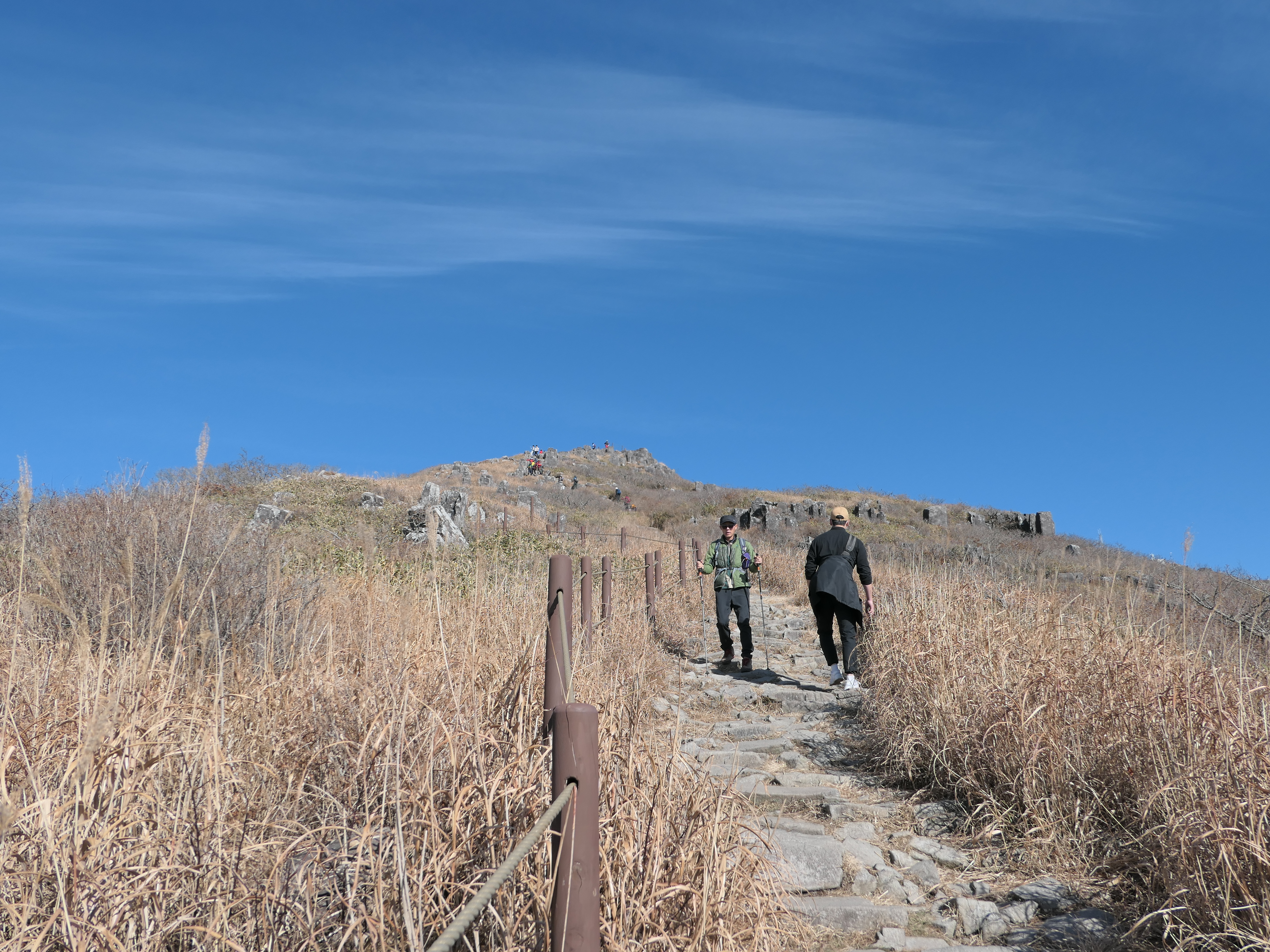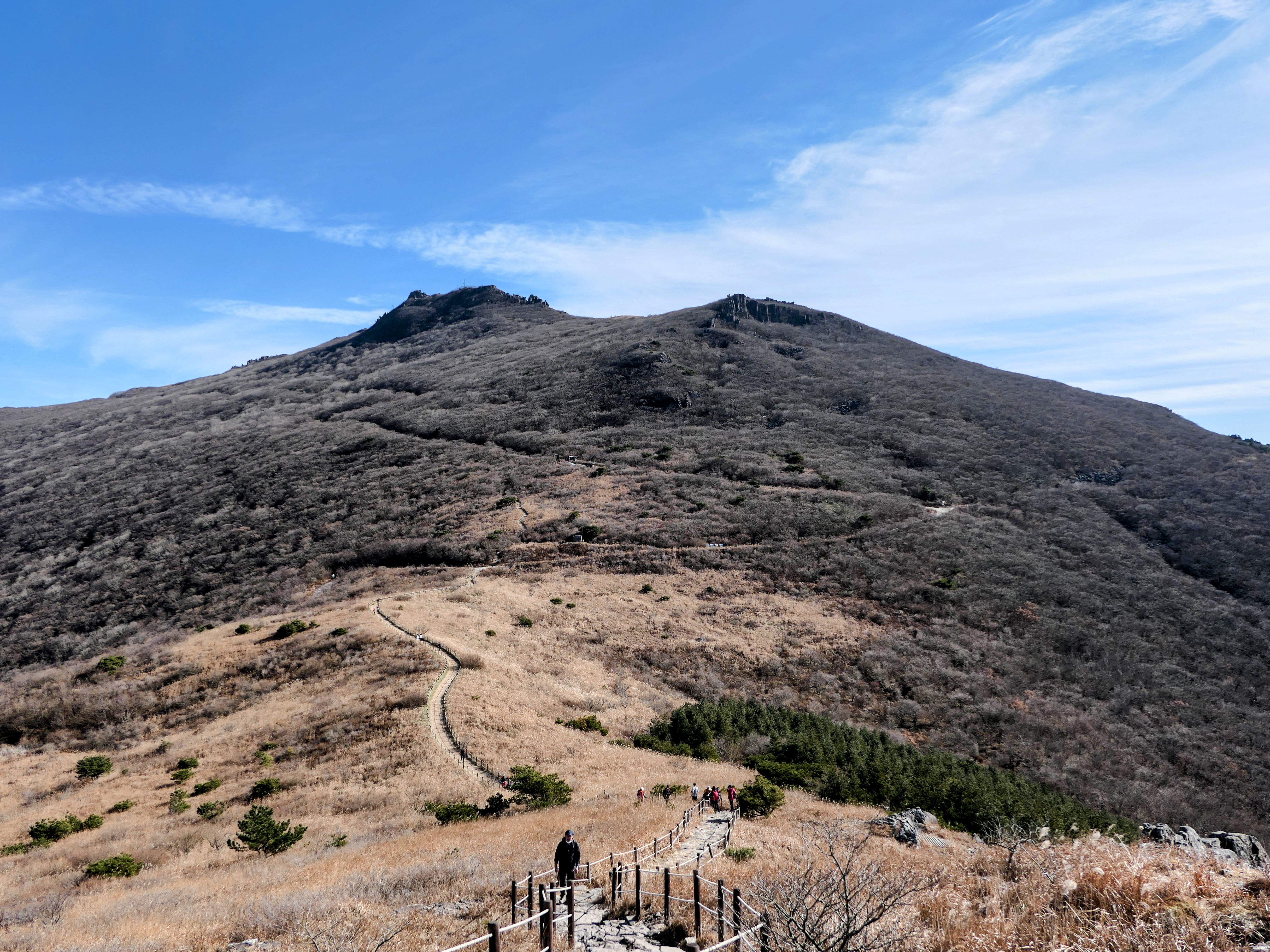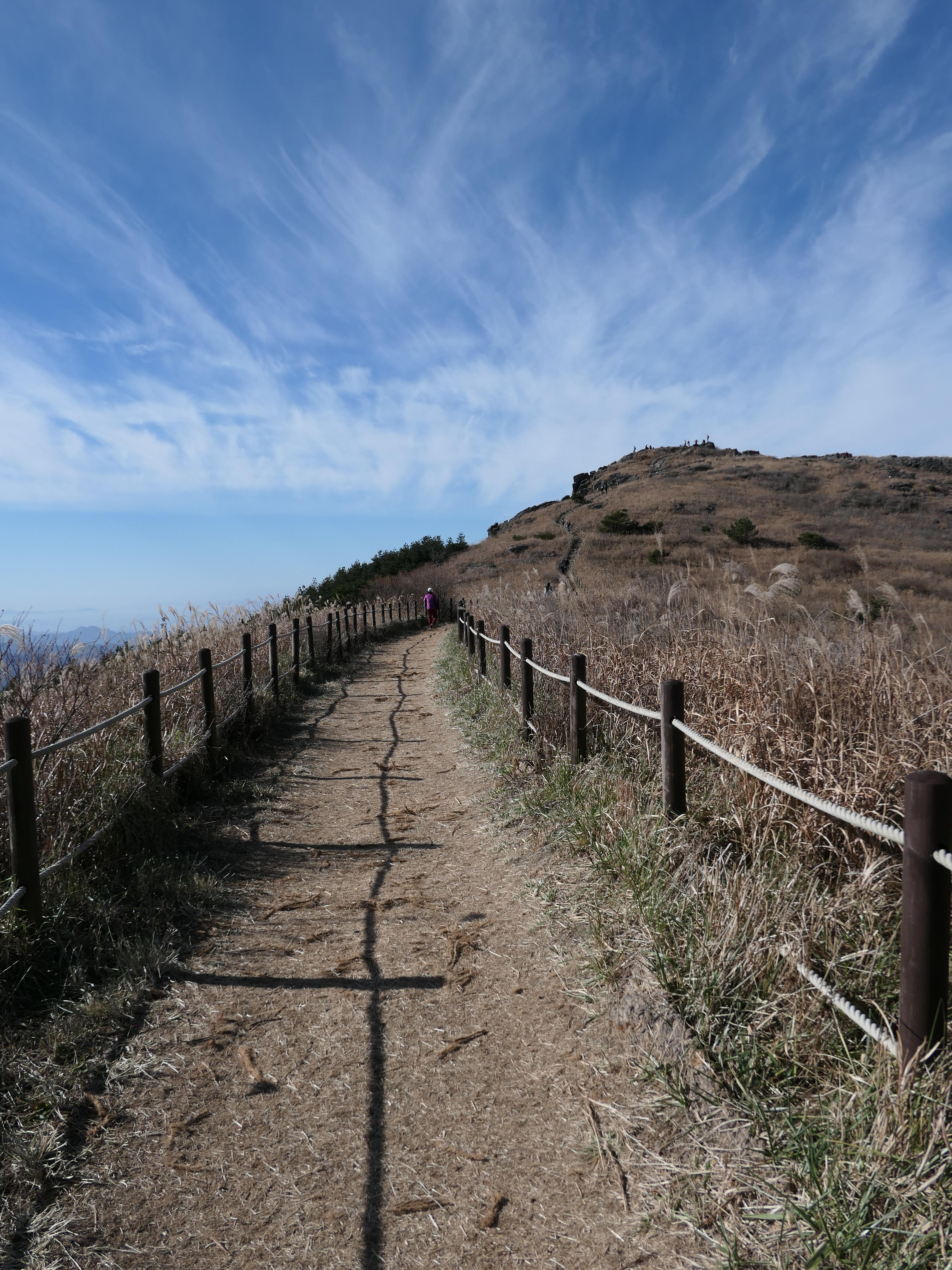 중봉이 보인다. 걷기 좋은 갈대숲길에 야자수 매트가 깔려있다.