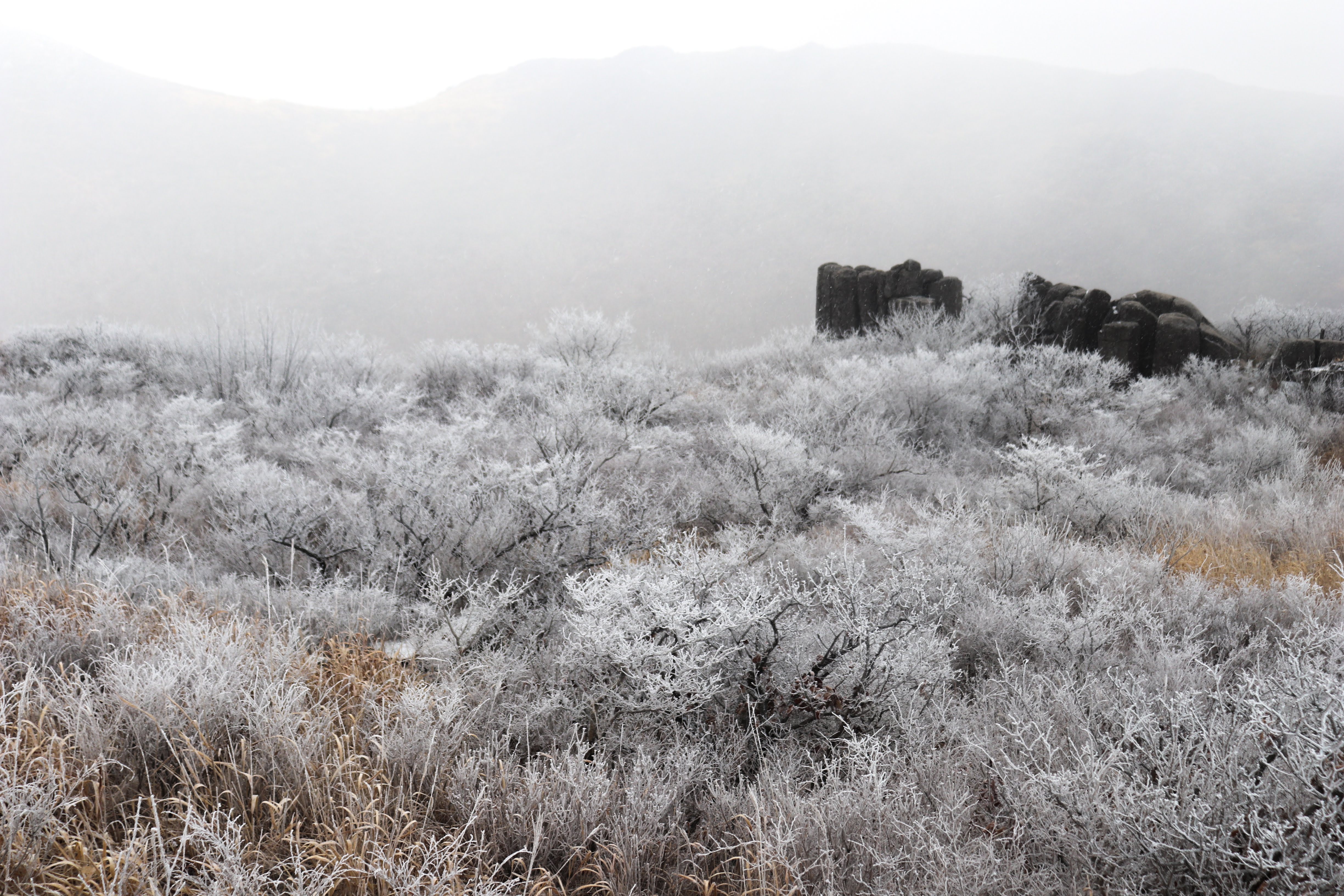 겨울 무등산의 상고대는 고위평탄면 억새군락이 온통 흰색으로 바뀌고 주상절리에 상고대가 필때 비경을 선보인다.