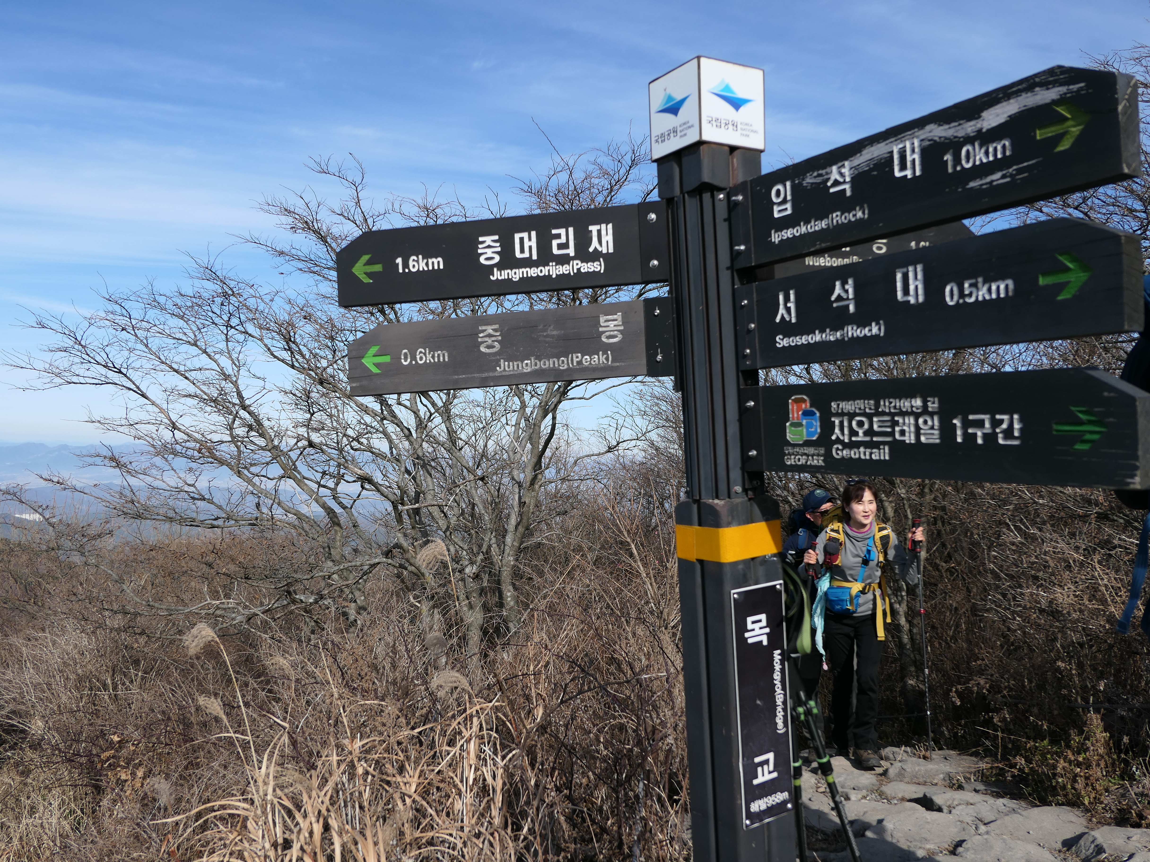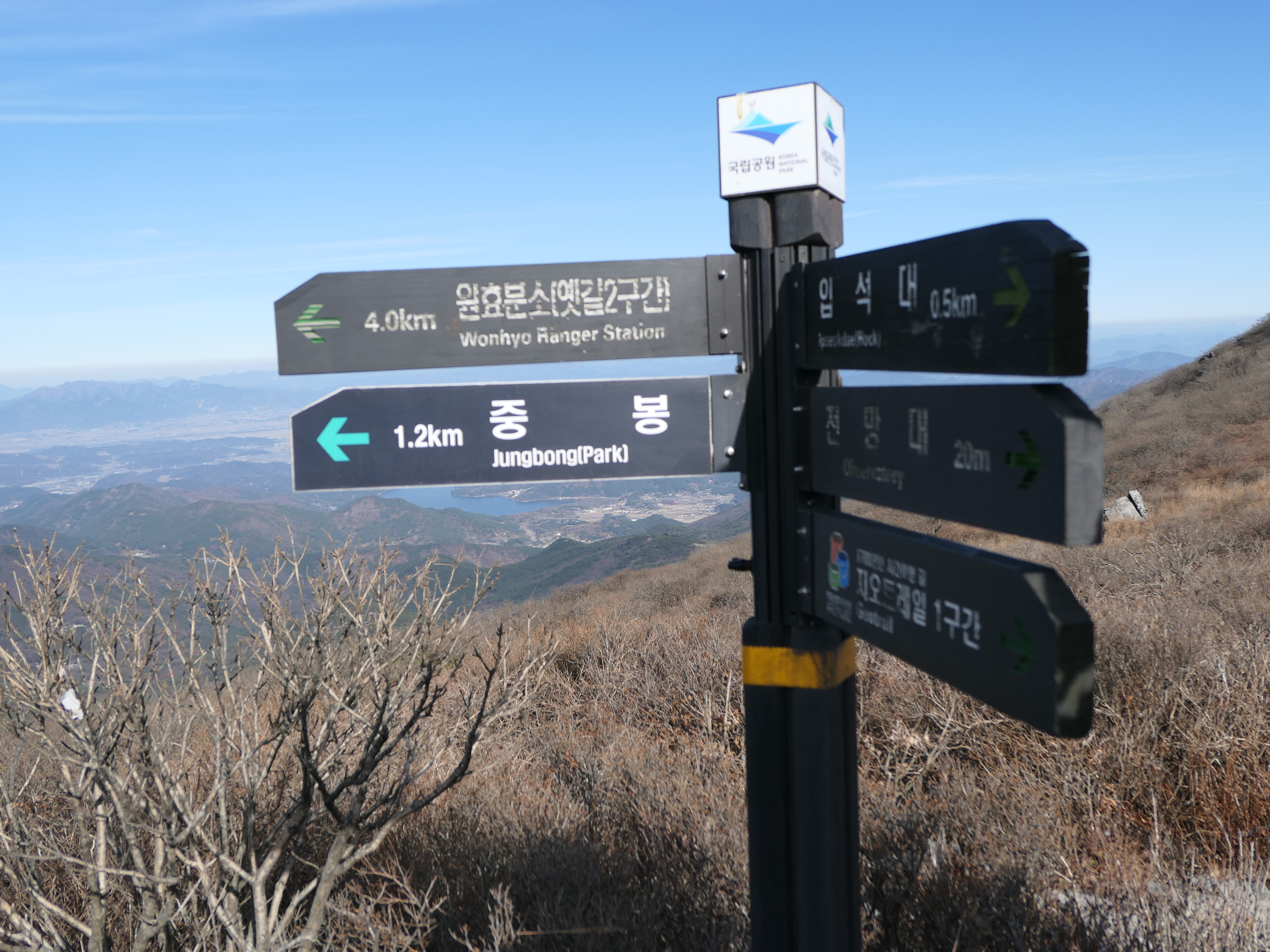 서석대를 내려오면 목교안전쉼터와 임도를 만나는데 갈림길에서 원효분소와 중봉이 V 형태로 갈라지니 주의가 필요하다.