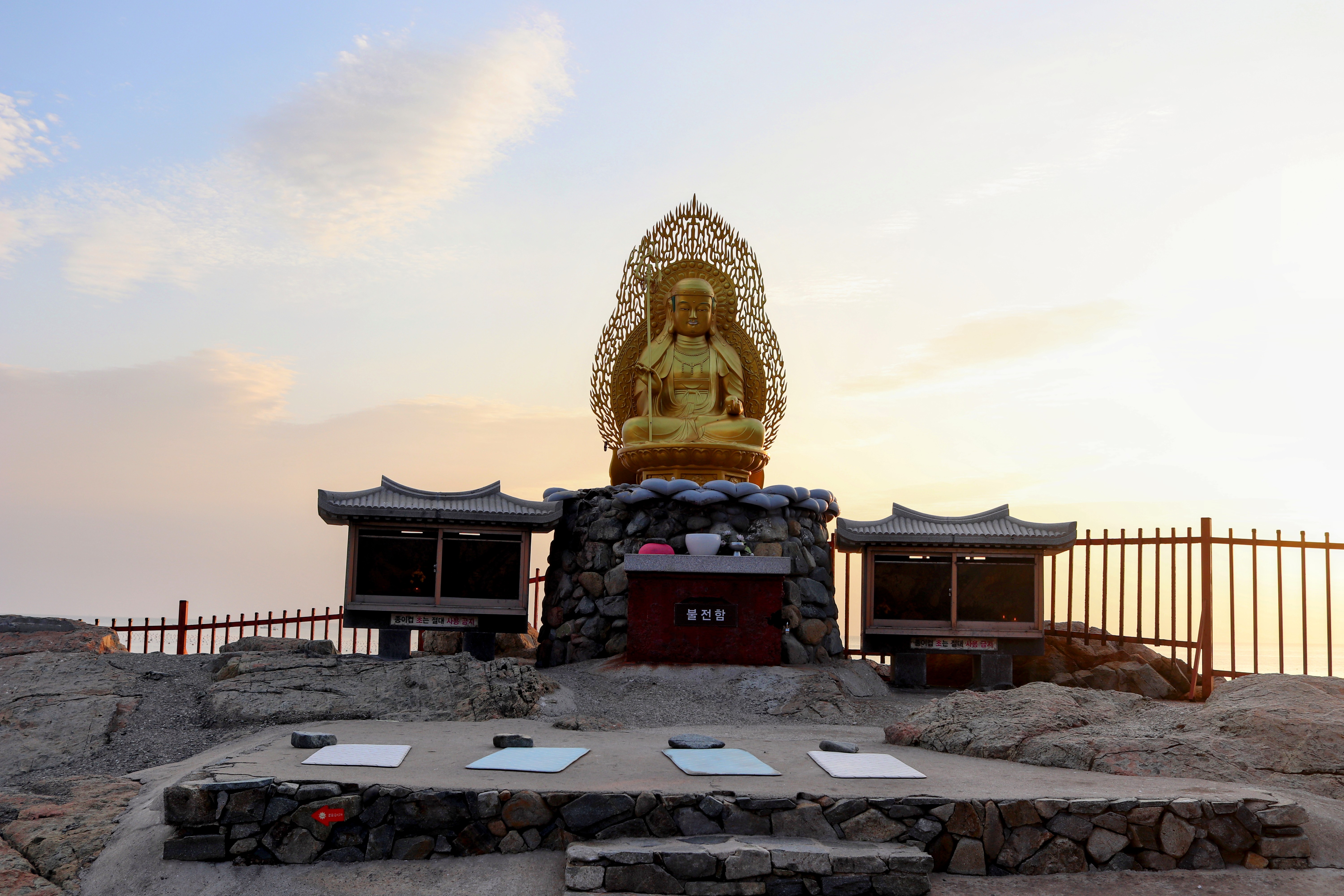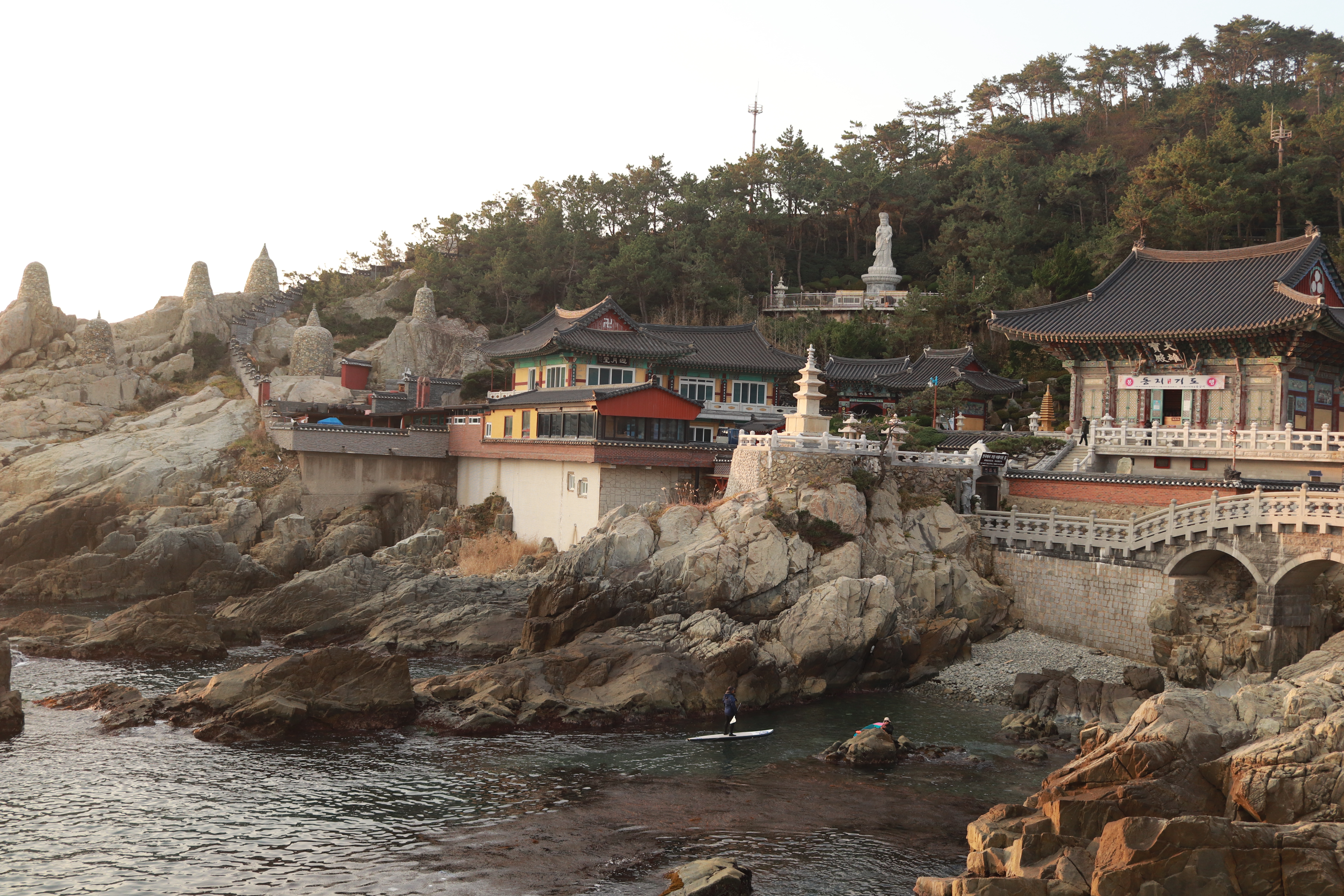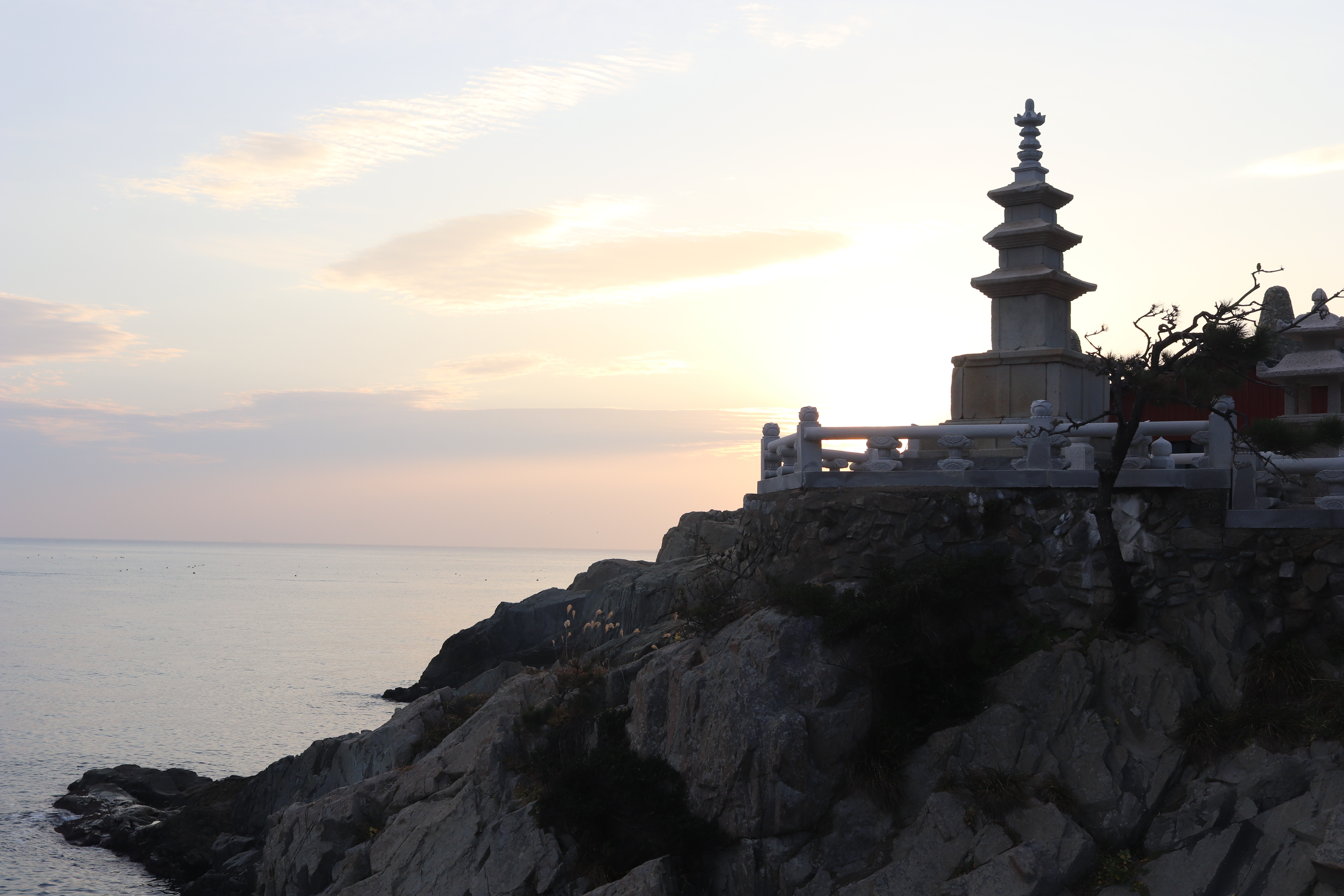 돌아서 본 아름다운 해동용궁사의 모습이 평화롭다. 바다를 내려보는 해수관음상, 바다를 보며 소원을 빌면 이루어진다는 시랑대 해동용궁사, 바다 끝부터 솟아오는 여명이 시랑대의 새벽 아침을 깨우고 있다. 시랑대는 기장 팔경의 하나이기도 하다.