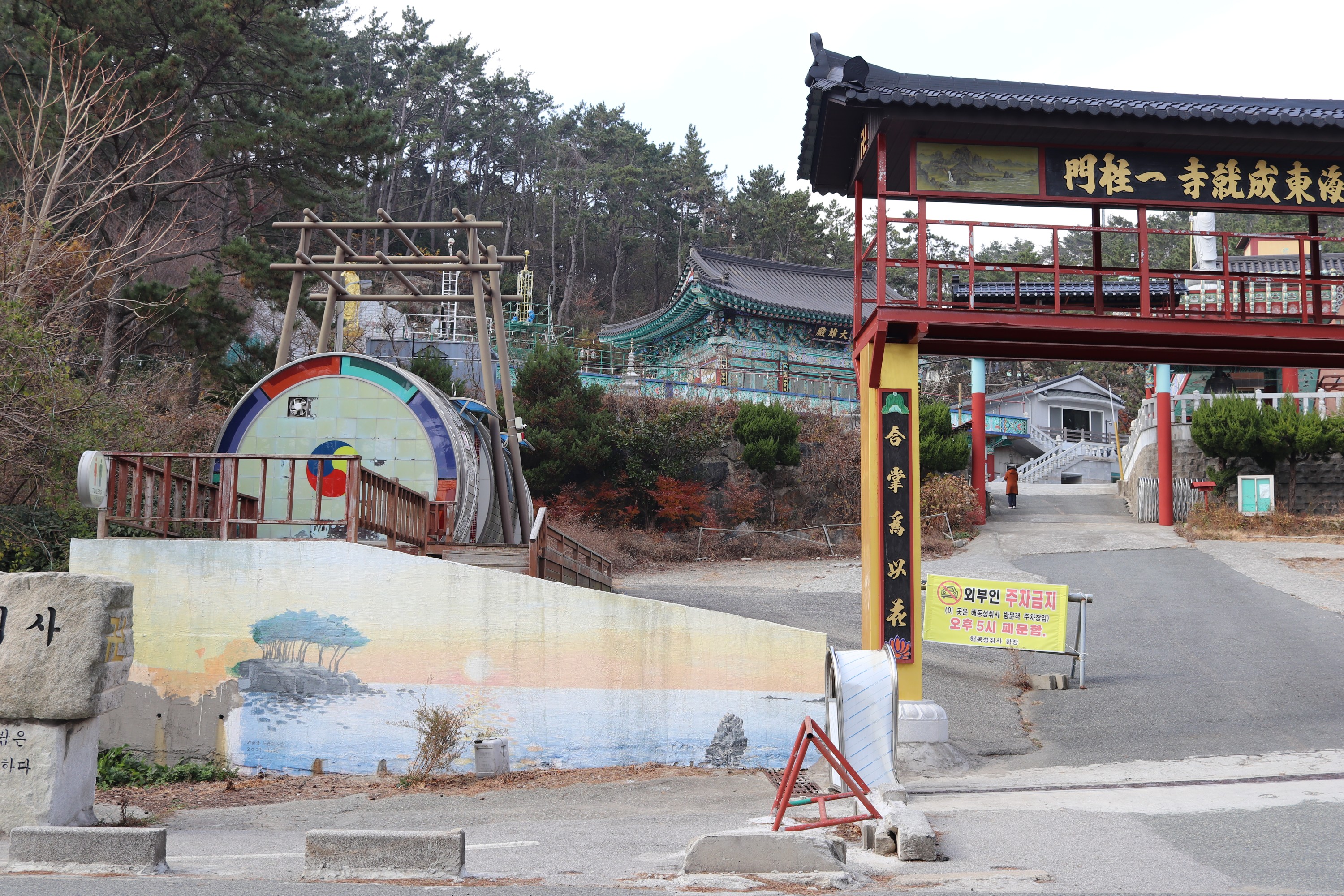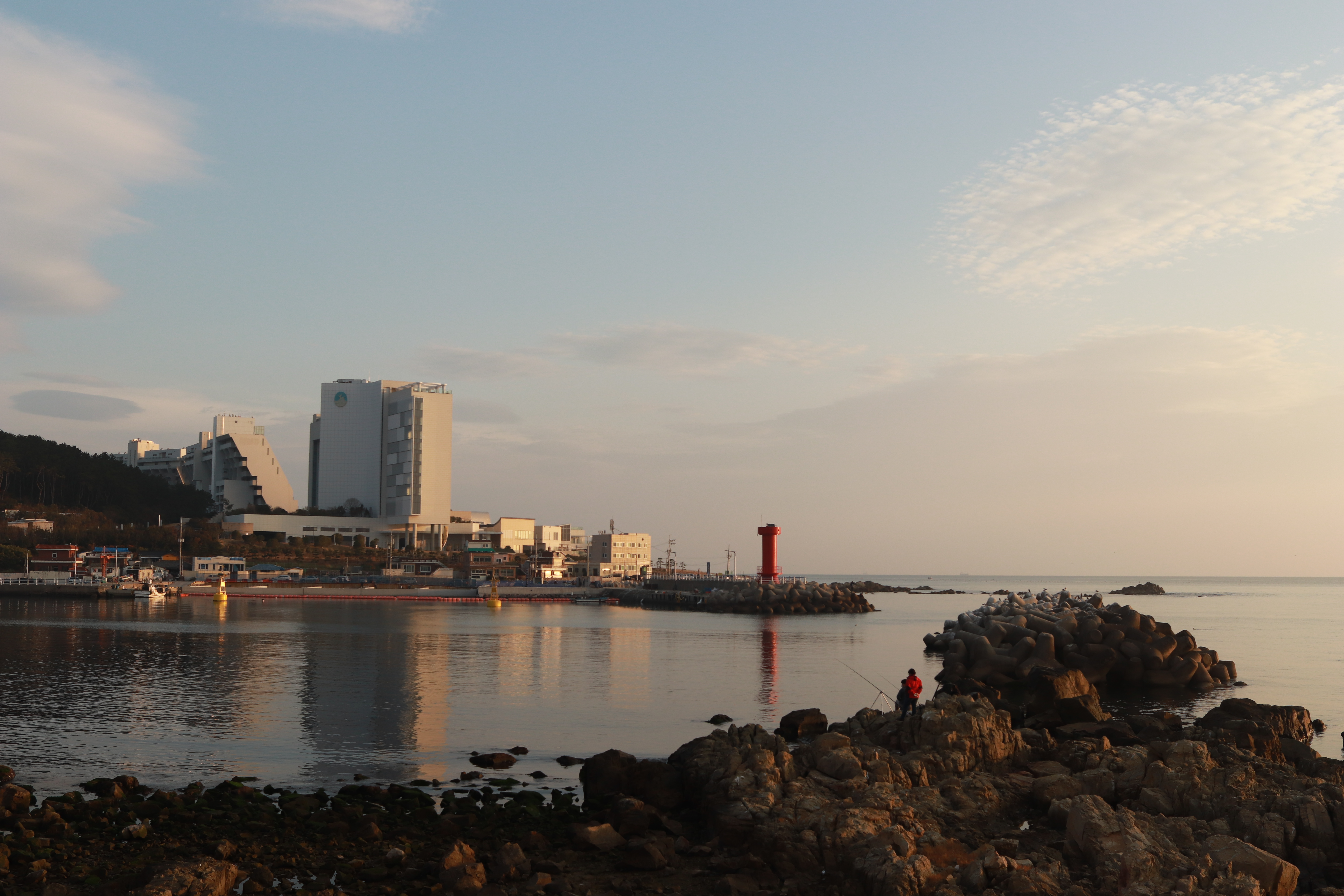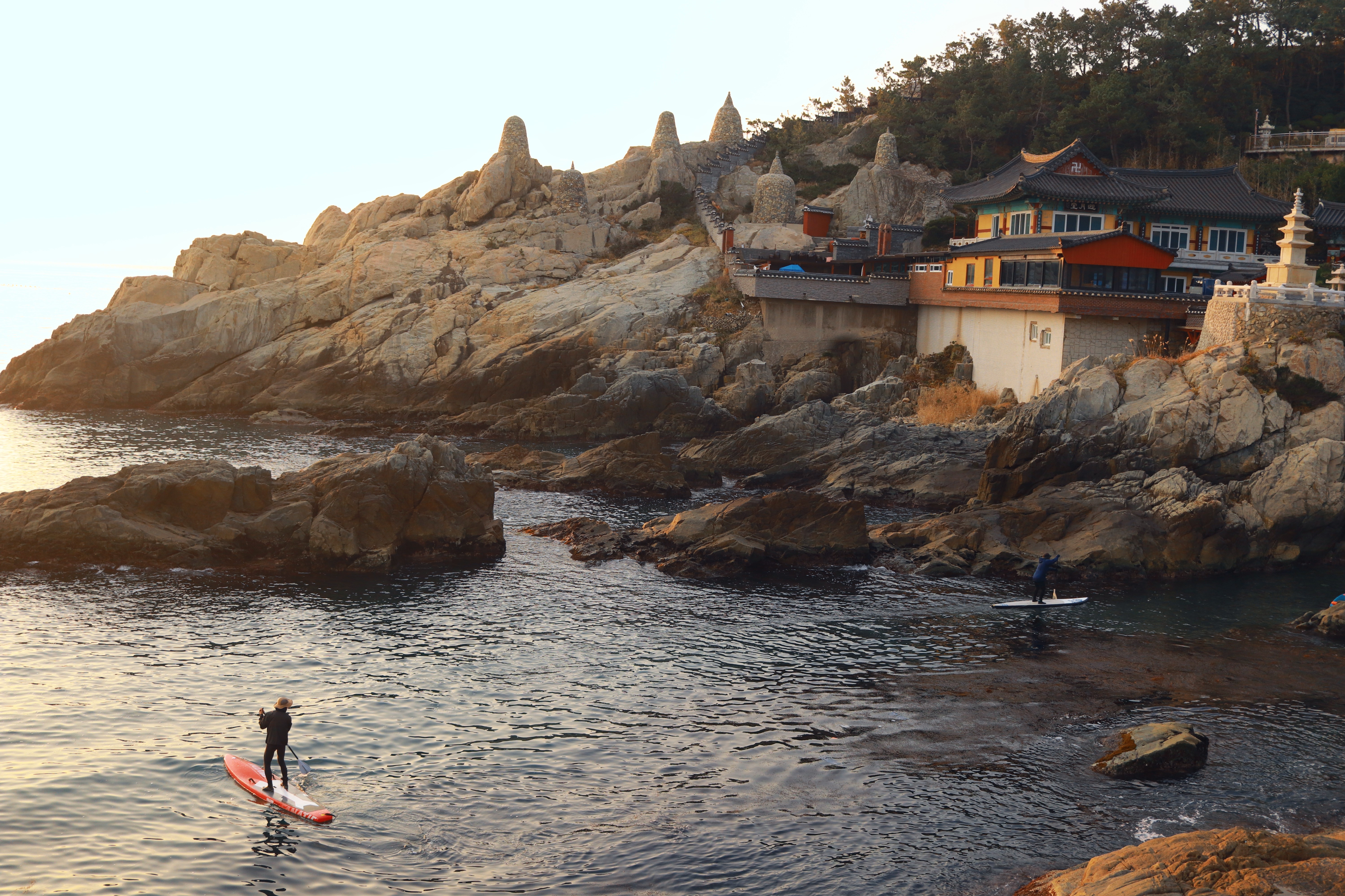 돌아서 본 아름다운 해동용궁사의 모습이 평화롭다. 바다를 내려보는 해수관음상, 바다를 보며 소원을 빌면 이루어진다는 시랑대 해동용궁사, 바다 끝부터 솟아오는 여명이 시랑대의 새벽 아침을 깨우고 있다. 시랑대는 기장 팔경의 하나이기도 하다.