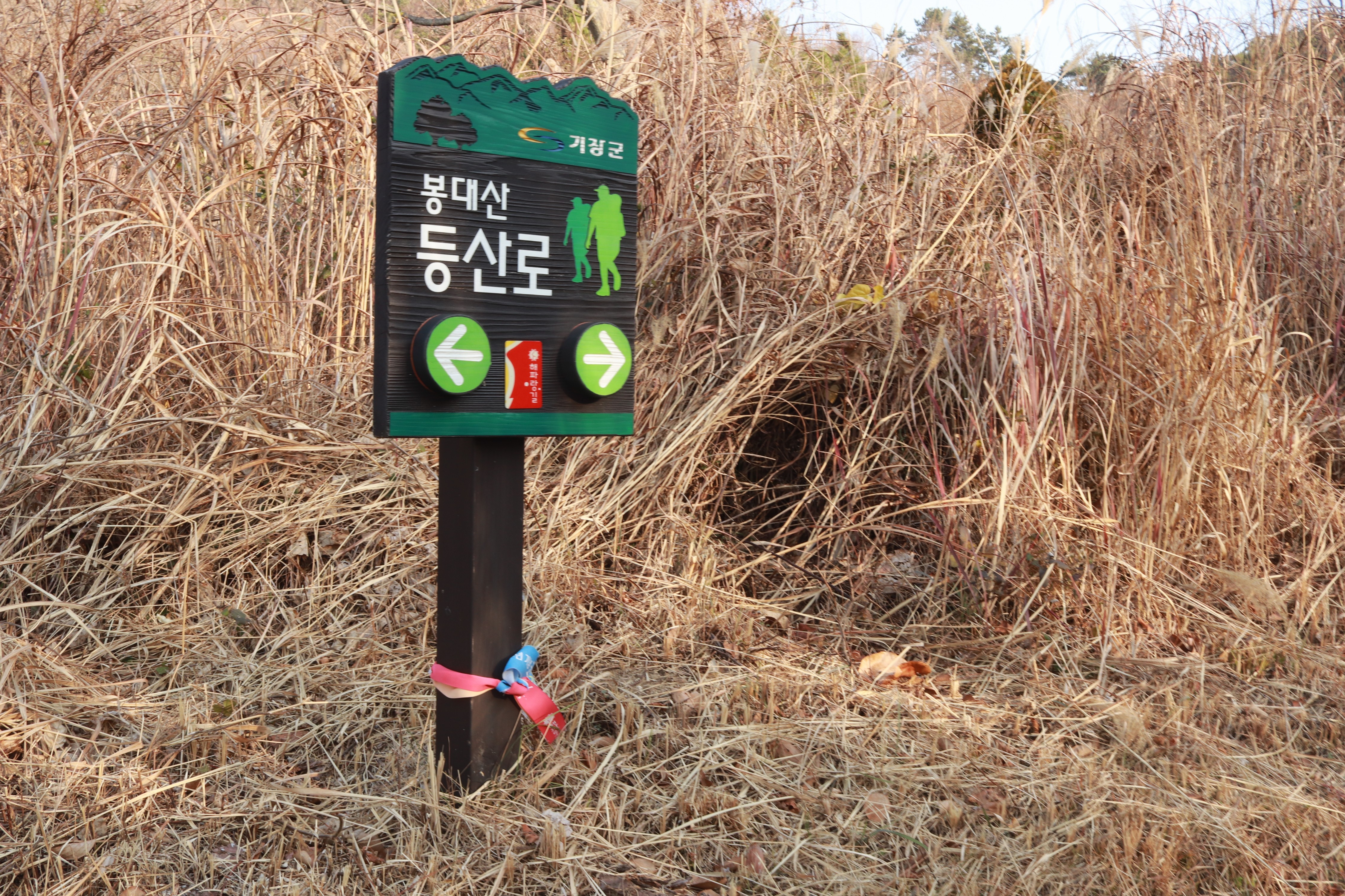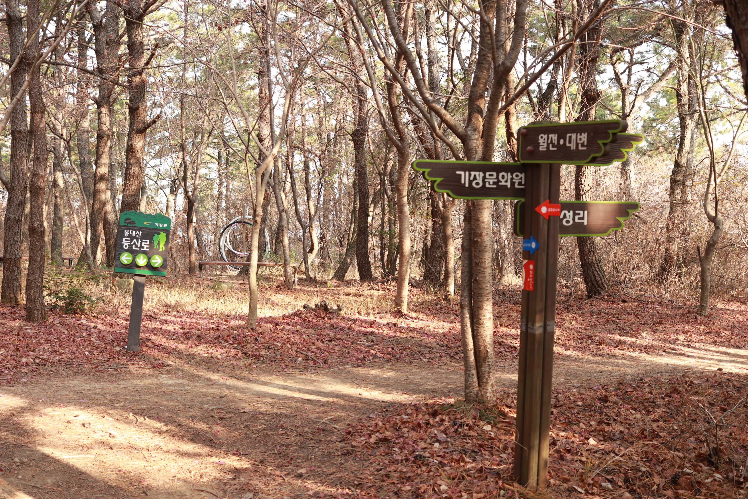 오션뷰를 뒤로 하고 숲 트레킹의 시작은 해발 220m의 정상을 찍고 기장군청 쪽으로 방향을 잡는다. 우측은 죽성리 드라마 세트장으로 빠지는 길이다. 짧지만 된비알을 올라 정상에 도착한다. 정상은 체육시설이 있고 좌측 기장문화원 방향으로 진행