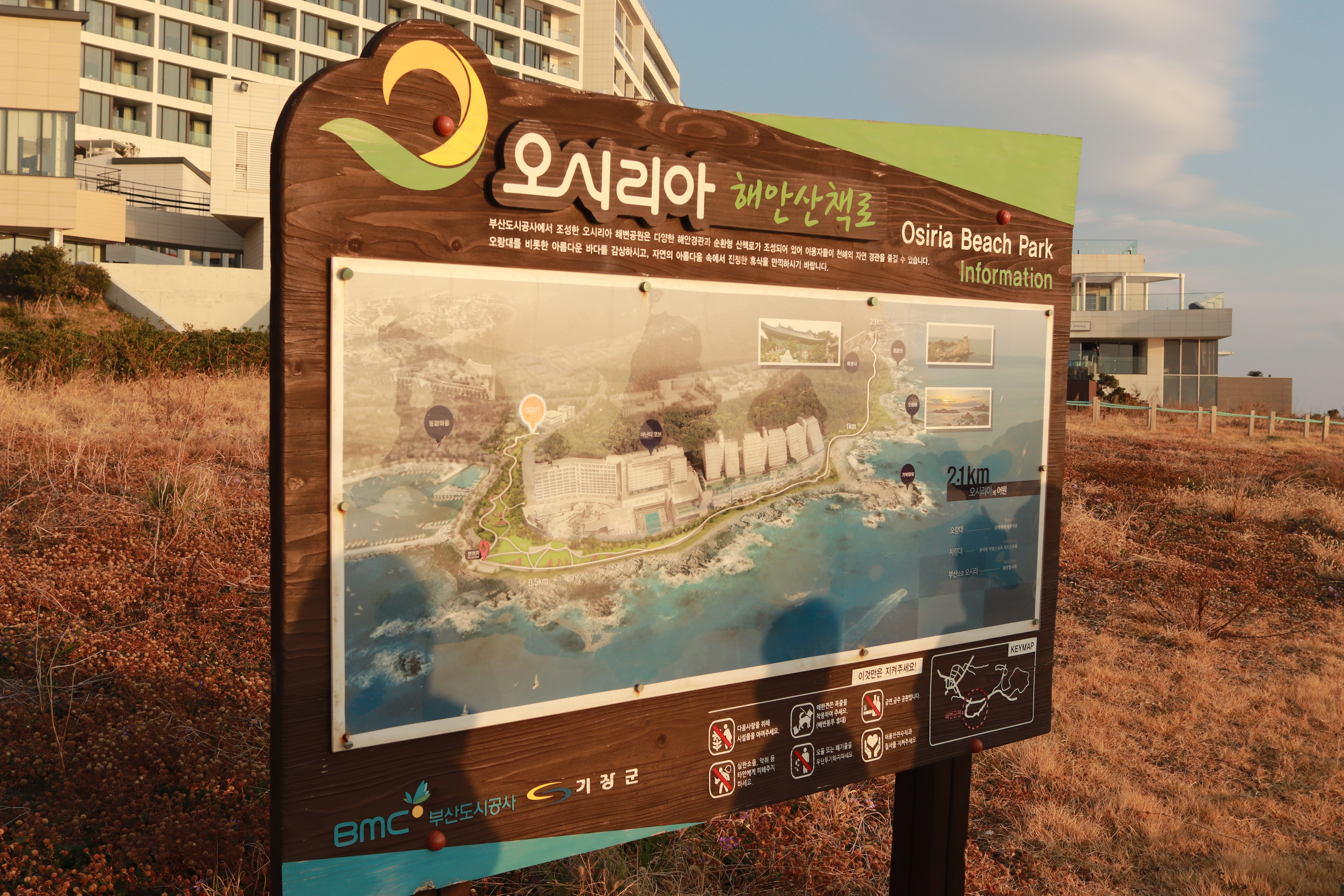 오시리아 관광단지의 해안 산책로에 접어들고 아난티 코브 호텔을 지나게 된다. 오시리아는 이곳 오랑대와 시랑대의 합성어로 2.1km의 부산지역의 아름다운 해안산책길이다. 이른 아침부터 부지런한 사람들로 해안길은 분주하기 시작한다.