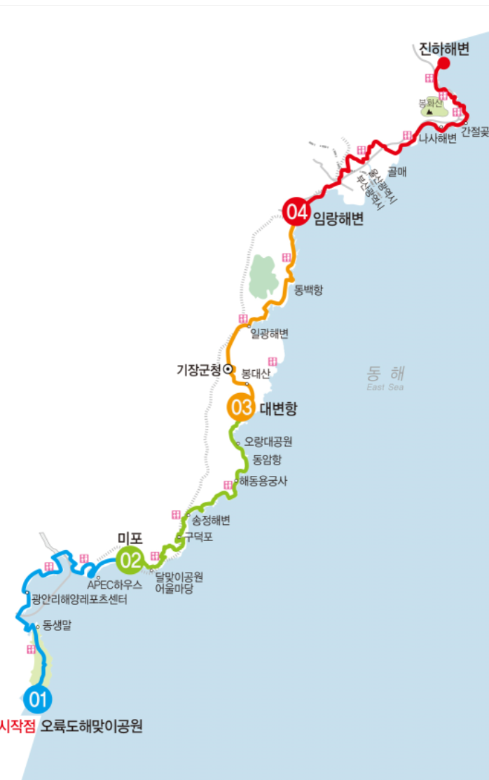 해동용궁사 → 2.72km → 오랑대 용왕단 → 3.24km → 대변항 → 4.2km → 기장군청→ 2.9km 일광해변 → 5.1km 동백항 → 4.3km 임랑해변 총 22.46km 누적거리 47.5km