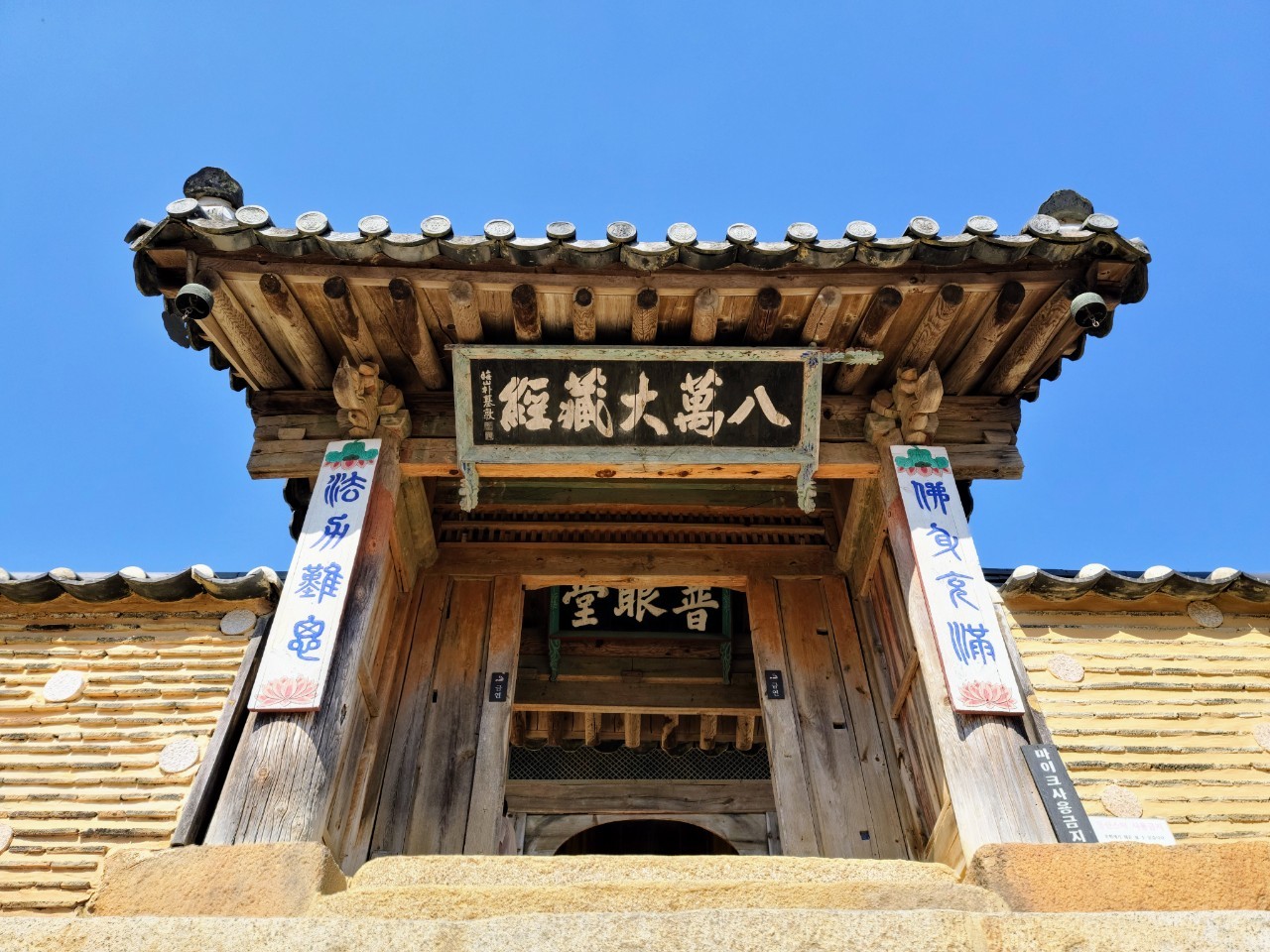 접근이 금지된 곳이라 줌으로 내부를 끌어보니 장경 판이 보인다. 장경판을 쌓으면 높이가 약 3200m, 무게가 285t 게다가 한 글자 각인 후 삼배의 절을 했다 하니 불가사의하기만 하다