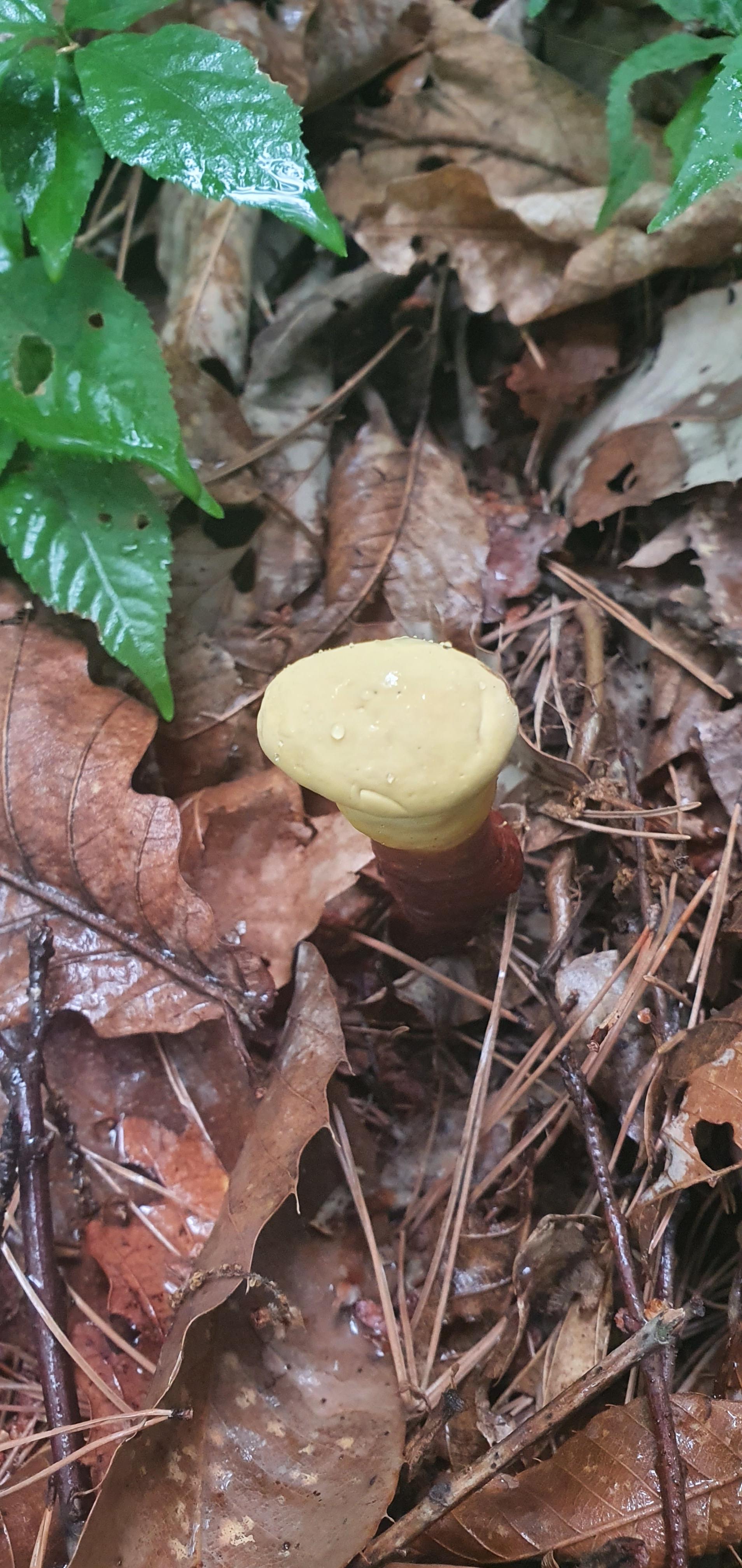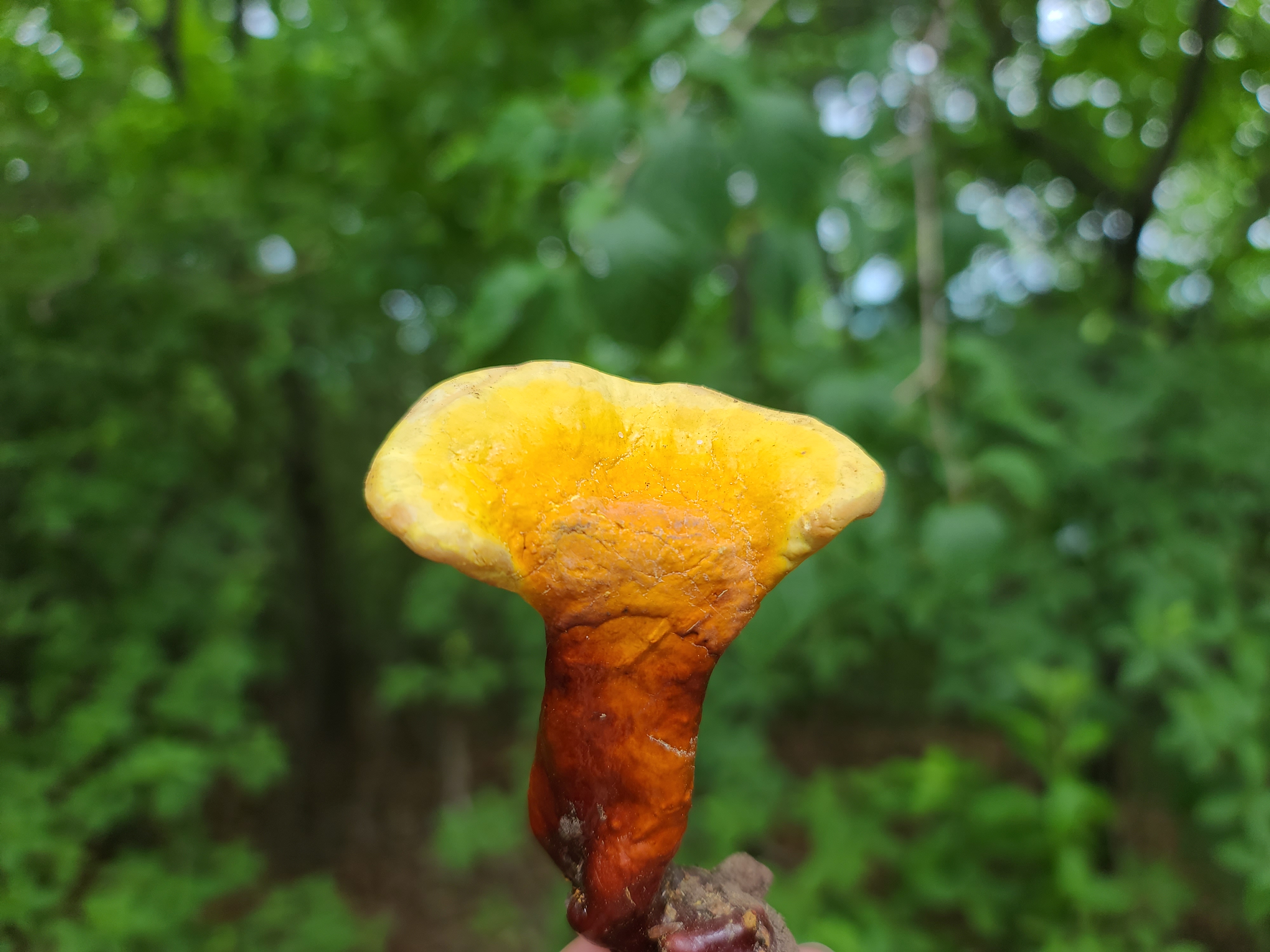 단비를 영접하는 영지버섯. 낙엽 사이를 헤치며 발그레 고개 든다. 싱그럽다