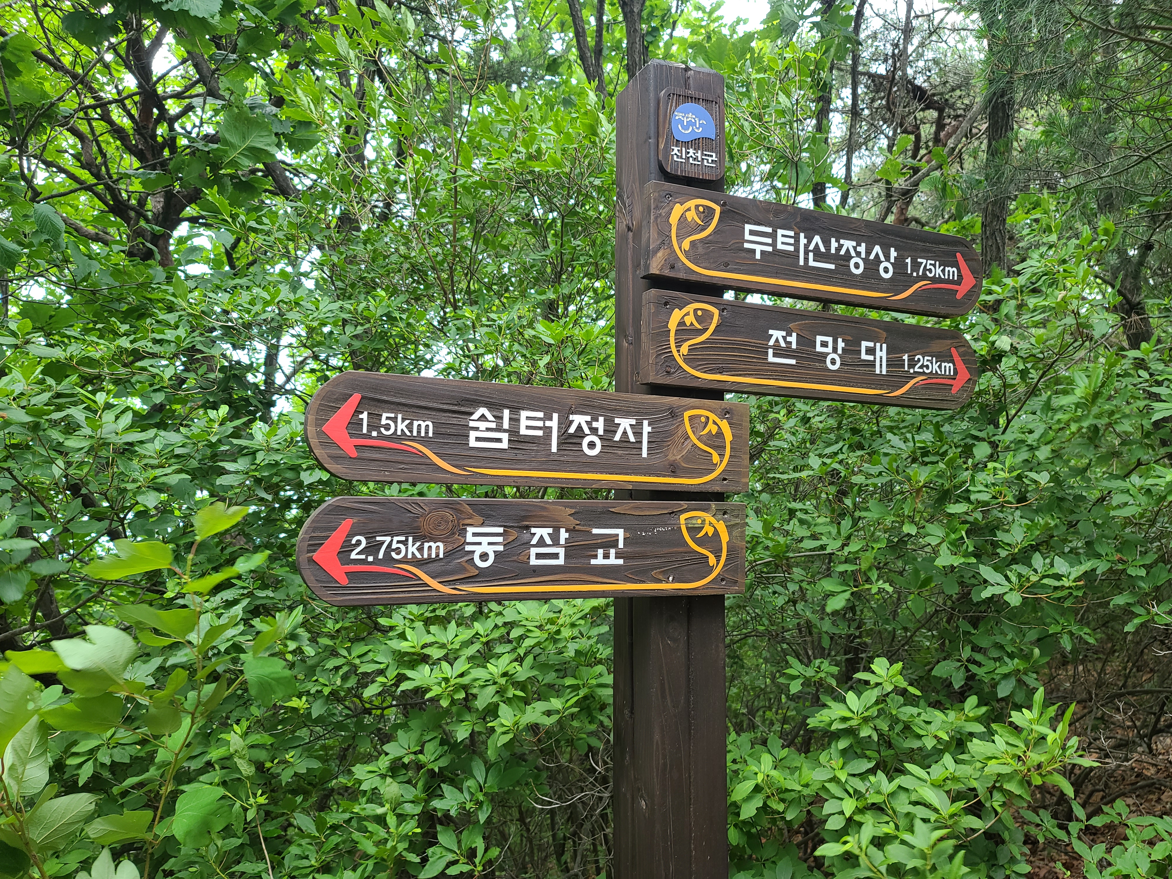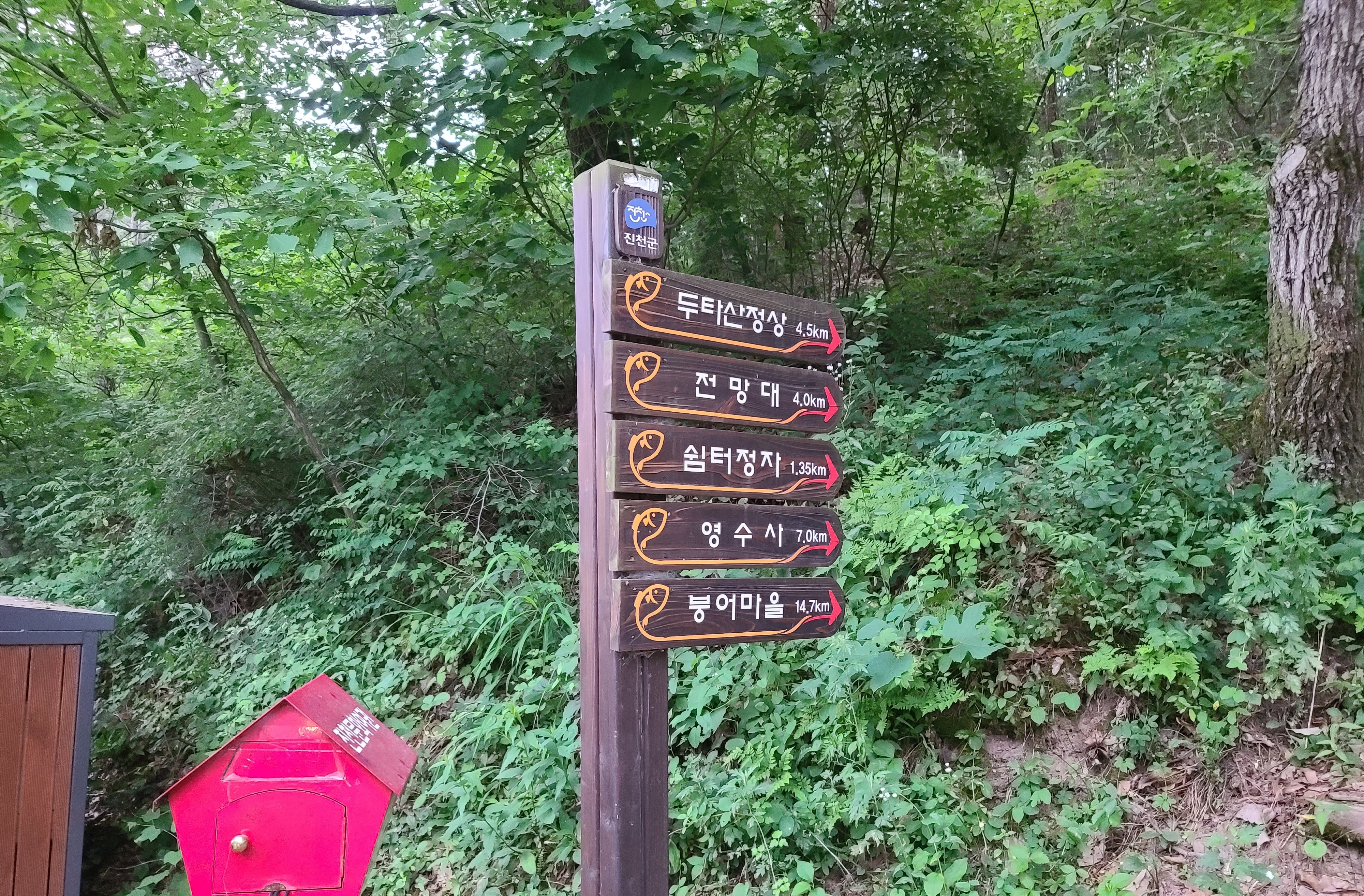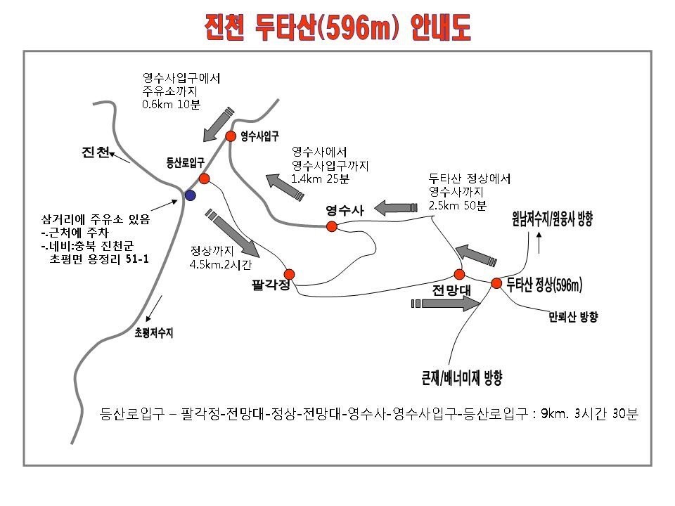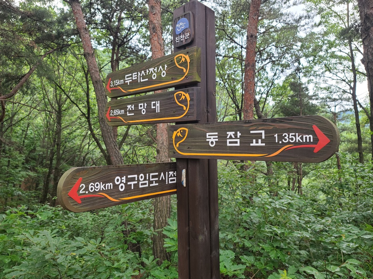 모처럼 시원한 바람을 맞으며 진천의 명산 두타산을 볼 수 있었습니다. 탐방하신다면 경사가 급한 영수사 쪽 보다는 동잠교에서 정상까지 완만히 올라가고 영수사로 들려 사찰을 둘러보고 하산 하심을 권합니다, 차량을 원점 회수 한다면 이곳에서 들머리까지 약 2km 도보로 30분 정도 소요 됩니다