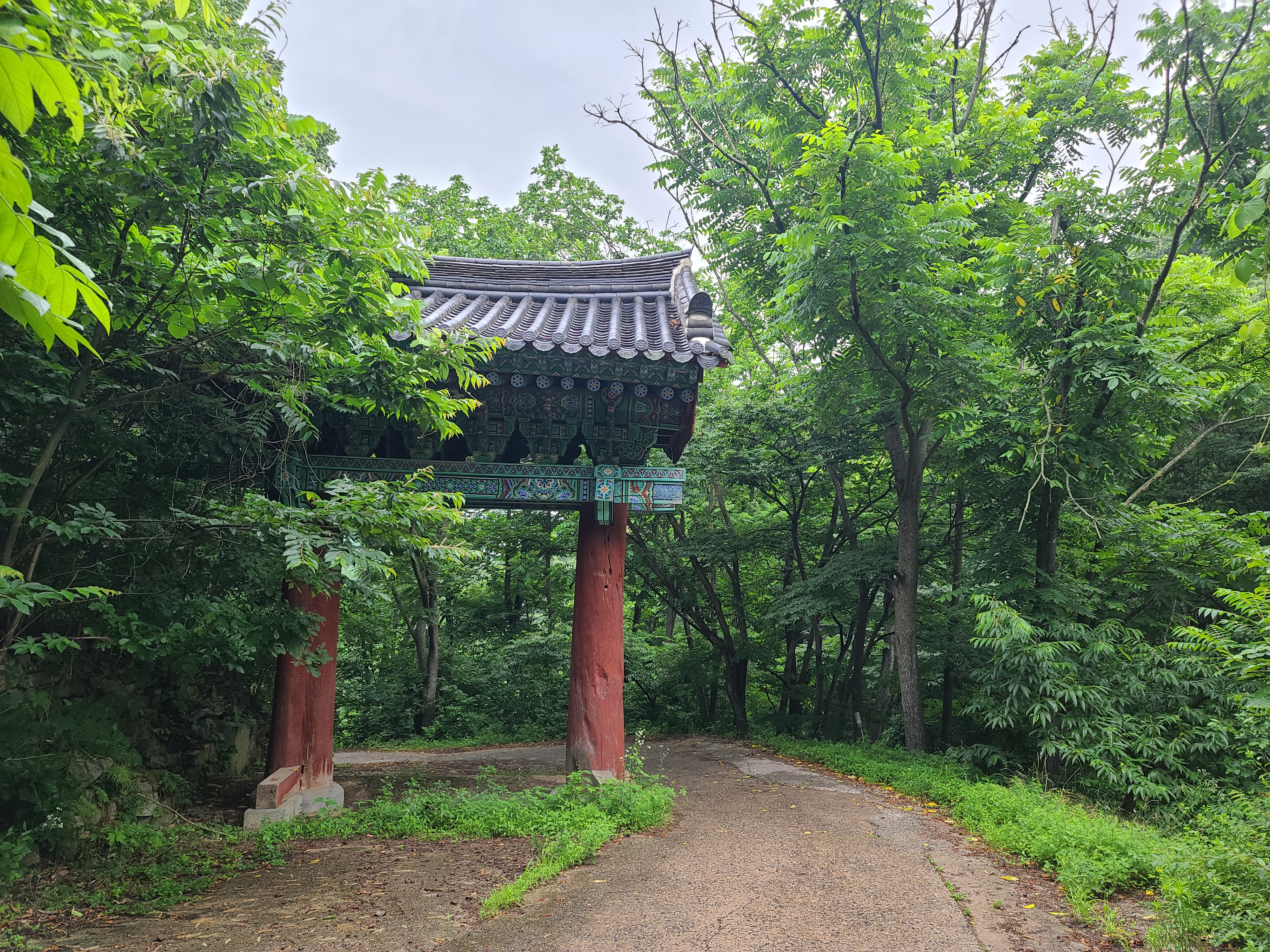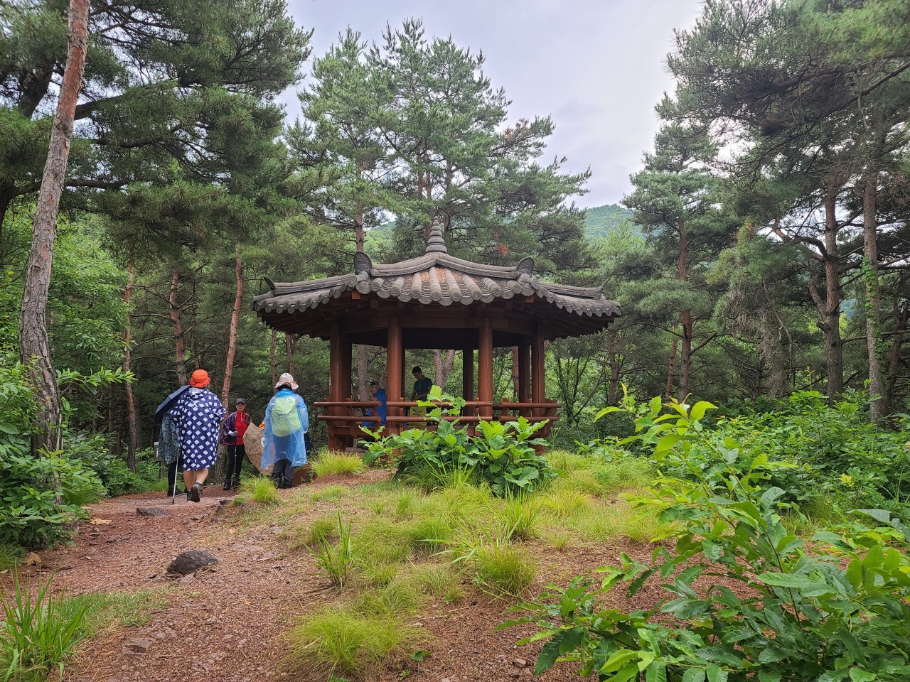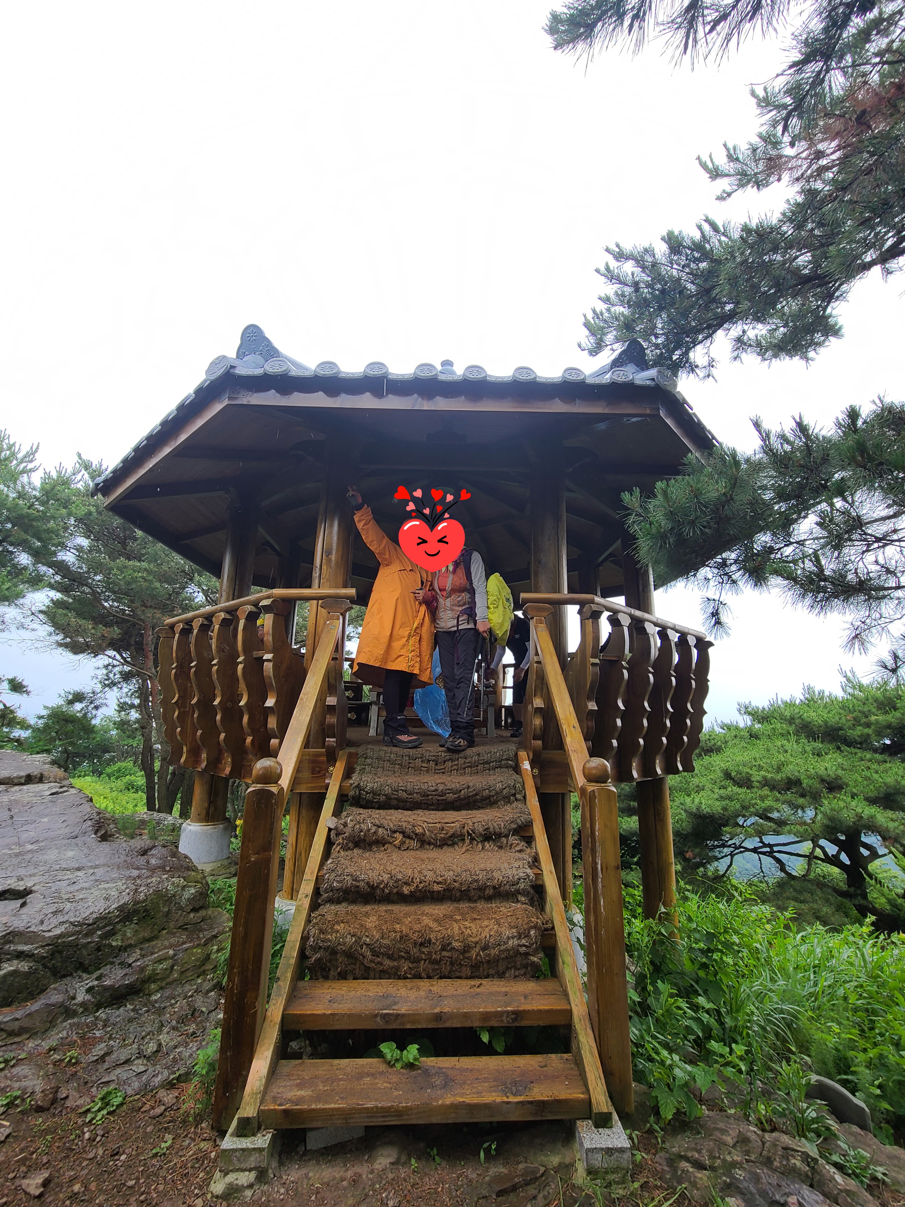 이삼십 분 힘겹게 오르면 첫 쉼터인 팔각정(두타정)에 도착하고 마침 비가 소강상태로 들어가 모두가 우의를 벗고 다시 채비한다