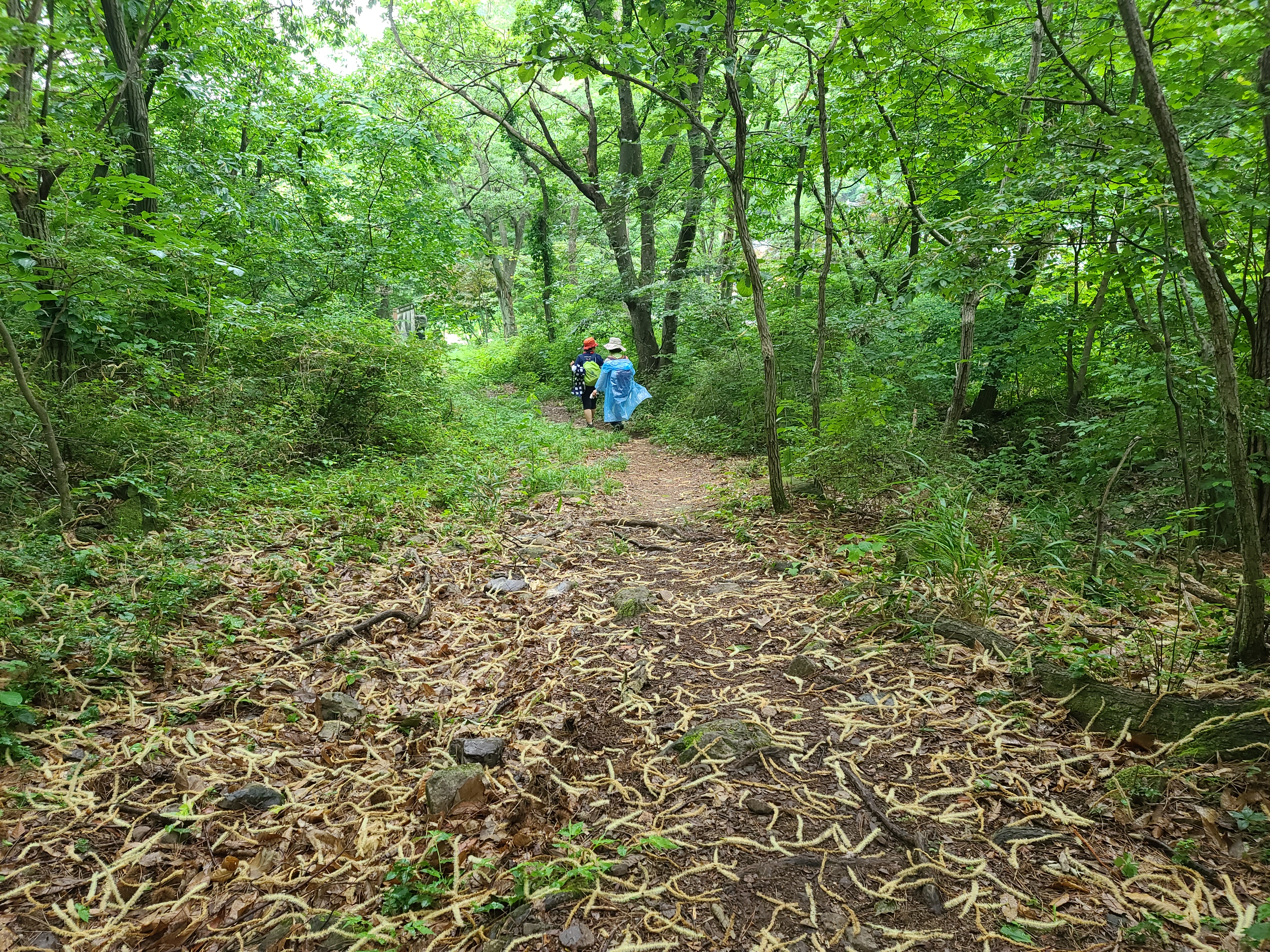 연둣빛 숲길과 바람에 흩어 떨어진 밤나무 꽃길. 흐린 하늘이지만 오늘은 시원한 바람 만으로도 충분히 힐링된다.