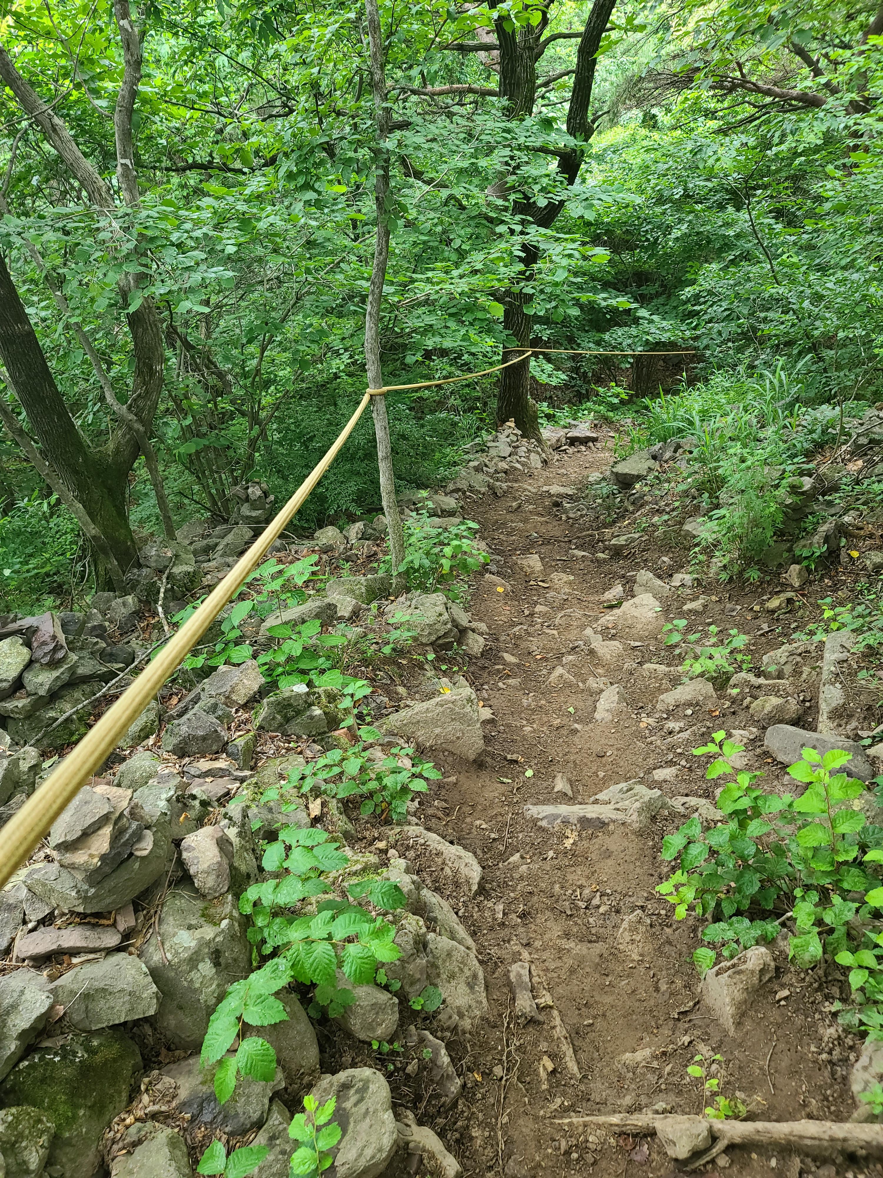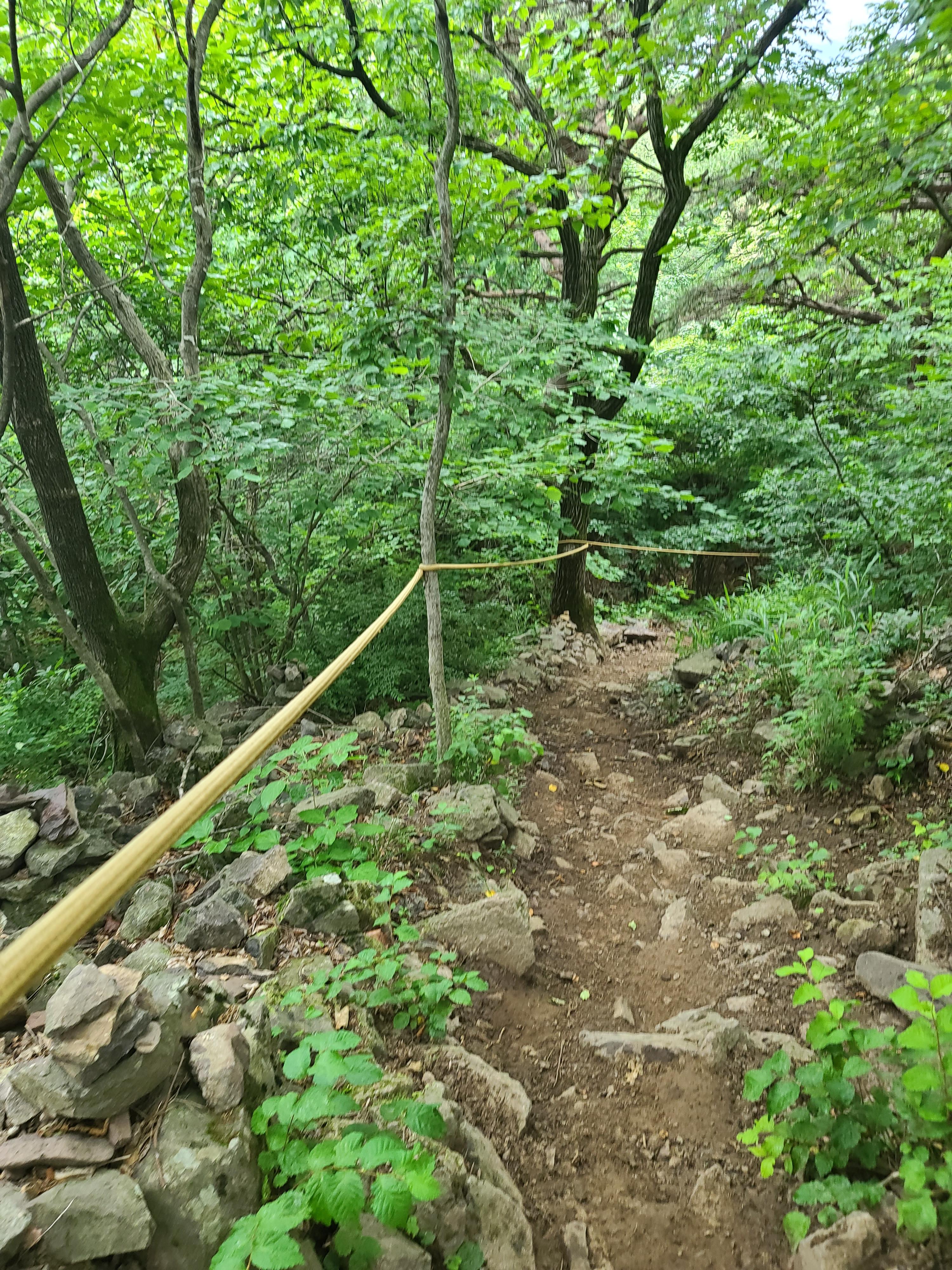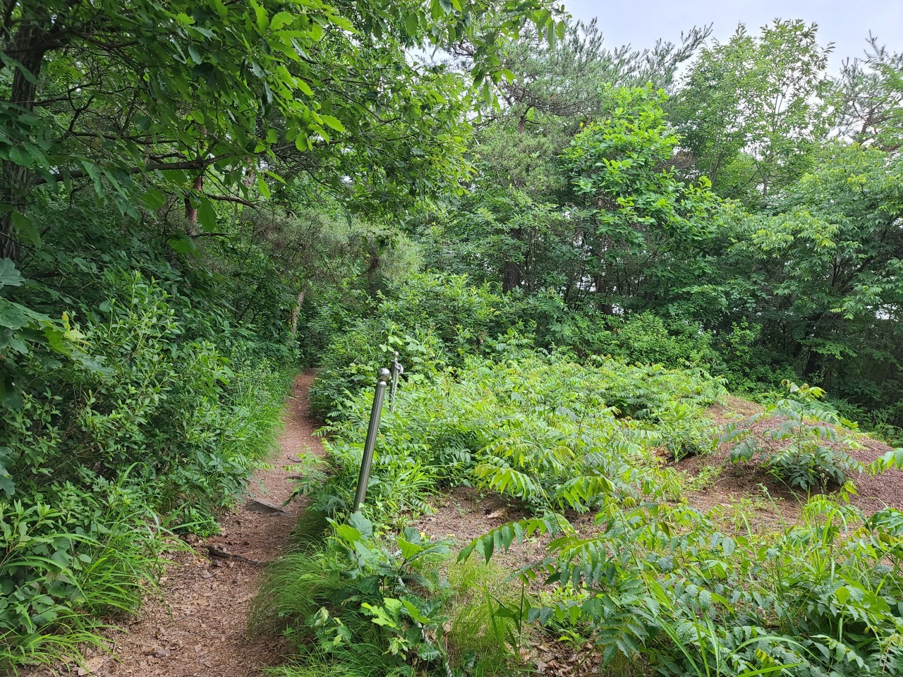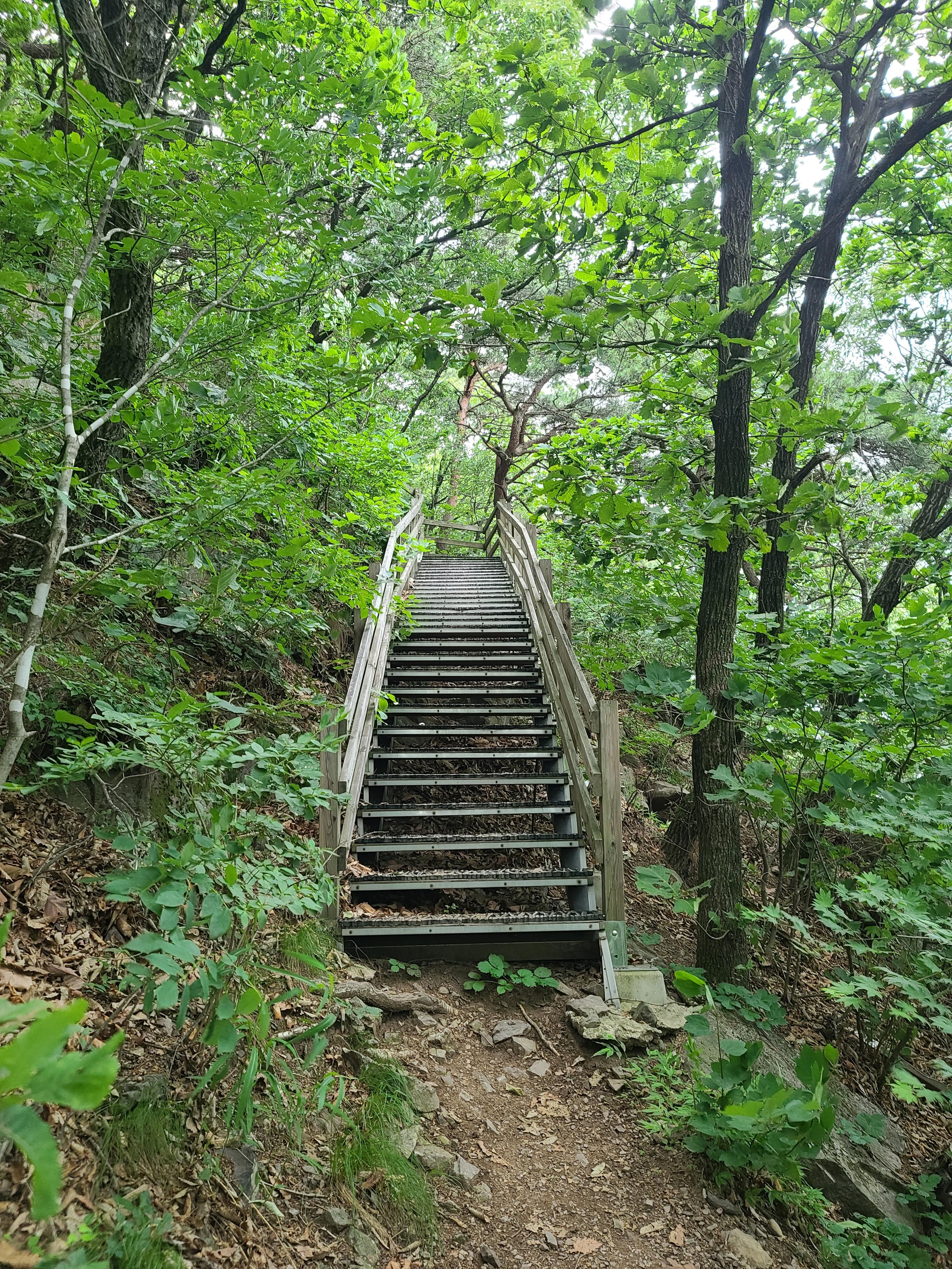 들머리에서 목책 계단을 따라 초반 가파른 계단을 따라 오르나 곧 편안한 길로 접어들며 능선을 향해 천천히 올라간다.