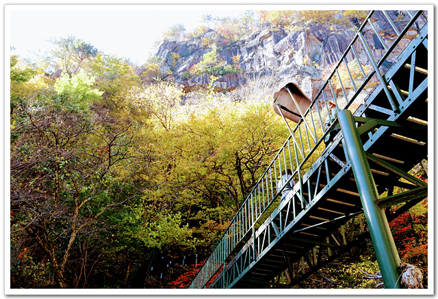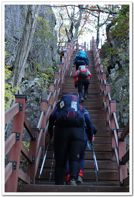 천혜의 풍경에 본능적인 짧은 탄성을 자아냅니다. 계단에서 바라본 베틀봉은 가히 형언할 수 없는 '서프라이즈'입니다. 실이라도 방금 꿰었을 법할 바늘귀 바위와 베틀바위에서는 정말 신선들의 비단옷을 짜던 것일까요?