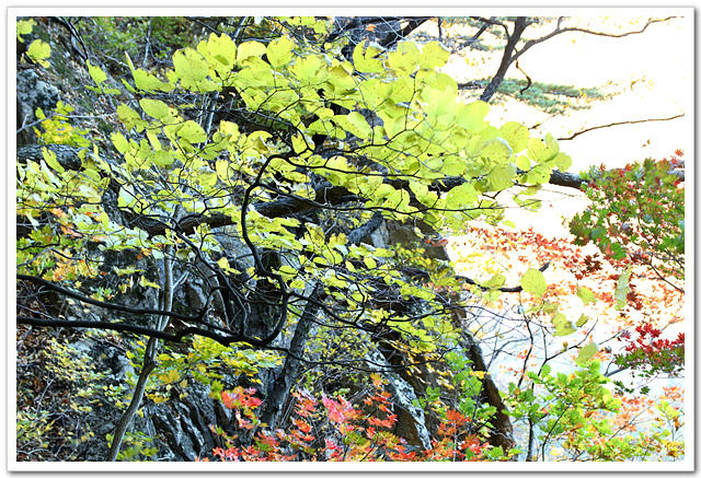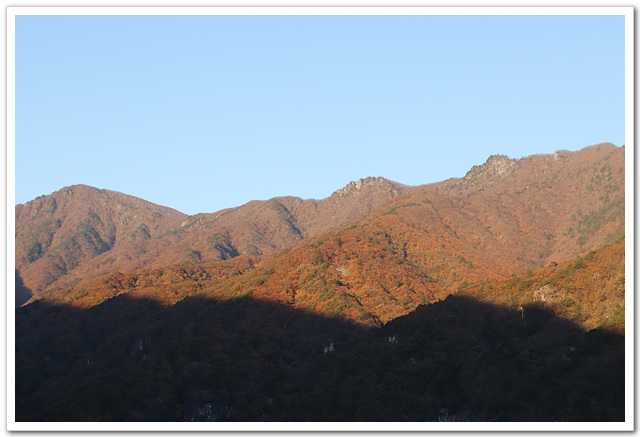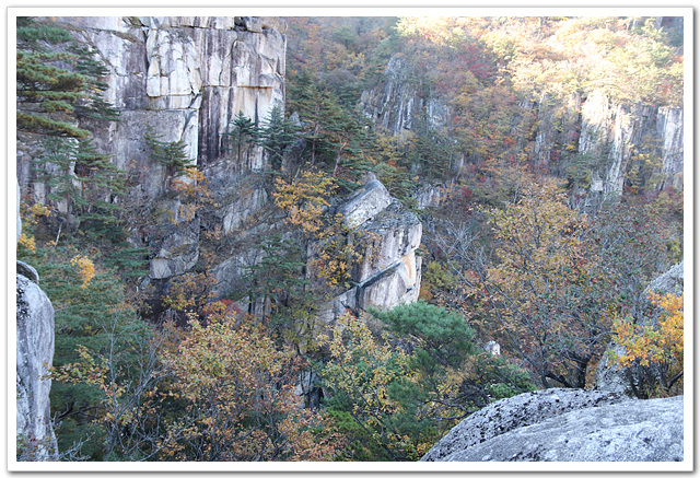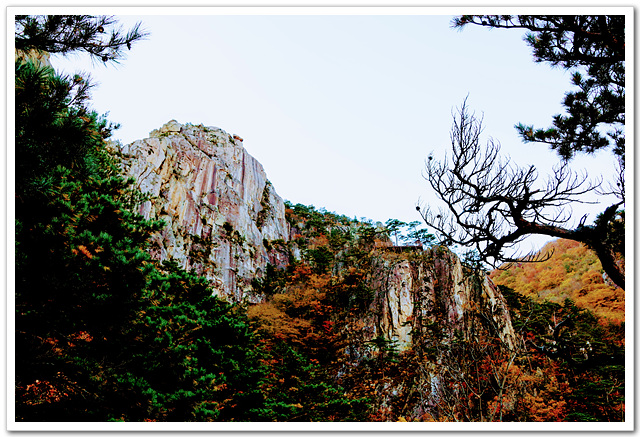 산 아래 무릉계곡이 뱀처럼 굽어 휘어지며, 구불구불 기암괴석은 은빛이 되어 아침햇살에 영롱히 반사됩니다. 동해 쪽 햇빛은 건너 천 길 벼랑을 서서히 덮어 가며 주홍의 따스한 온기가 온산에 퍼져 오는 듯합니다.