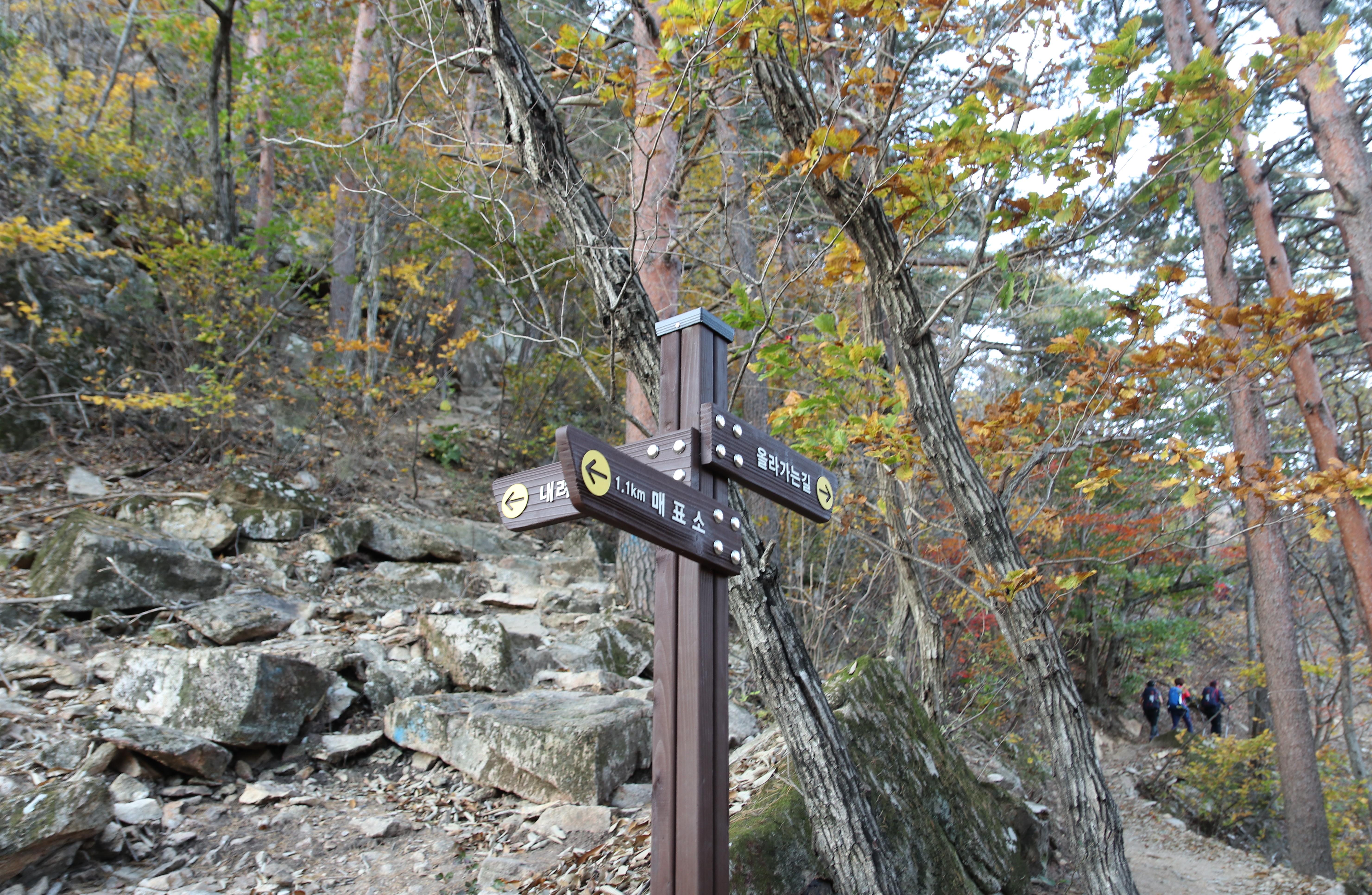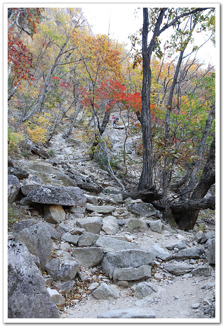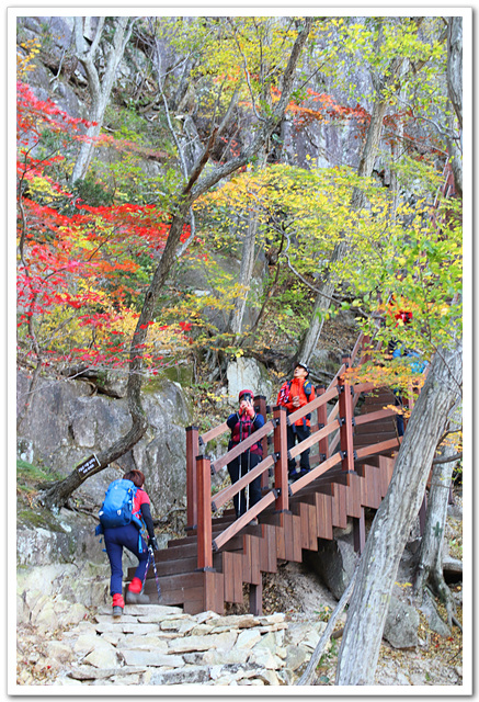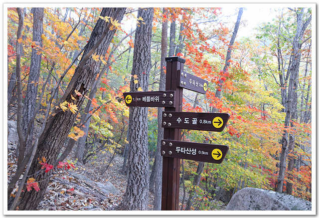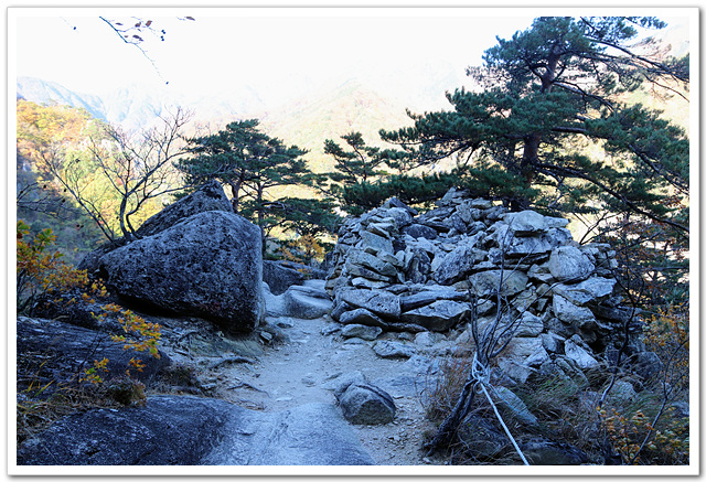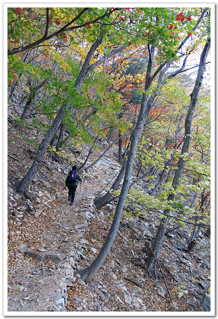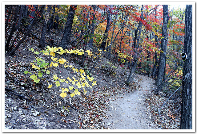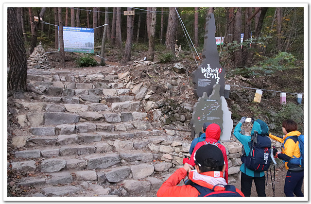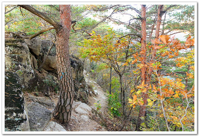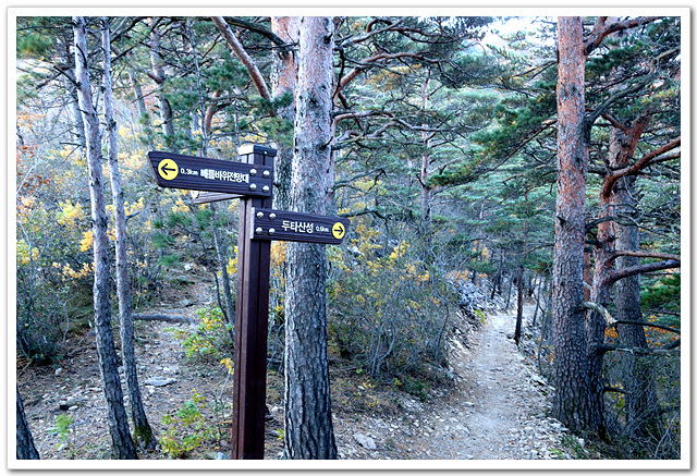 미륵바위를 지나 두타산성이 얼마 남지 않았습니다. 금강송 군락을 지나며 알록달록 단풍이 깃든 길이 힘들지 않은 편안한 낭만의 길입니다 0.9km 지점