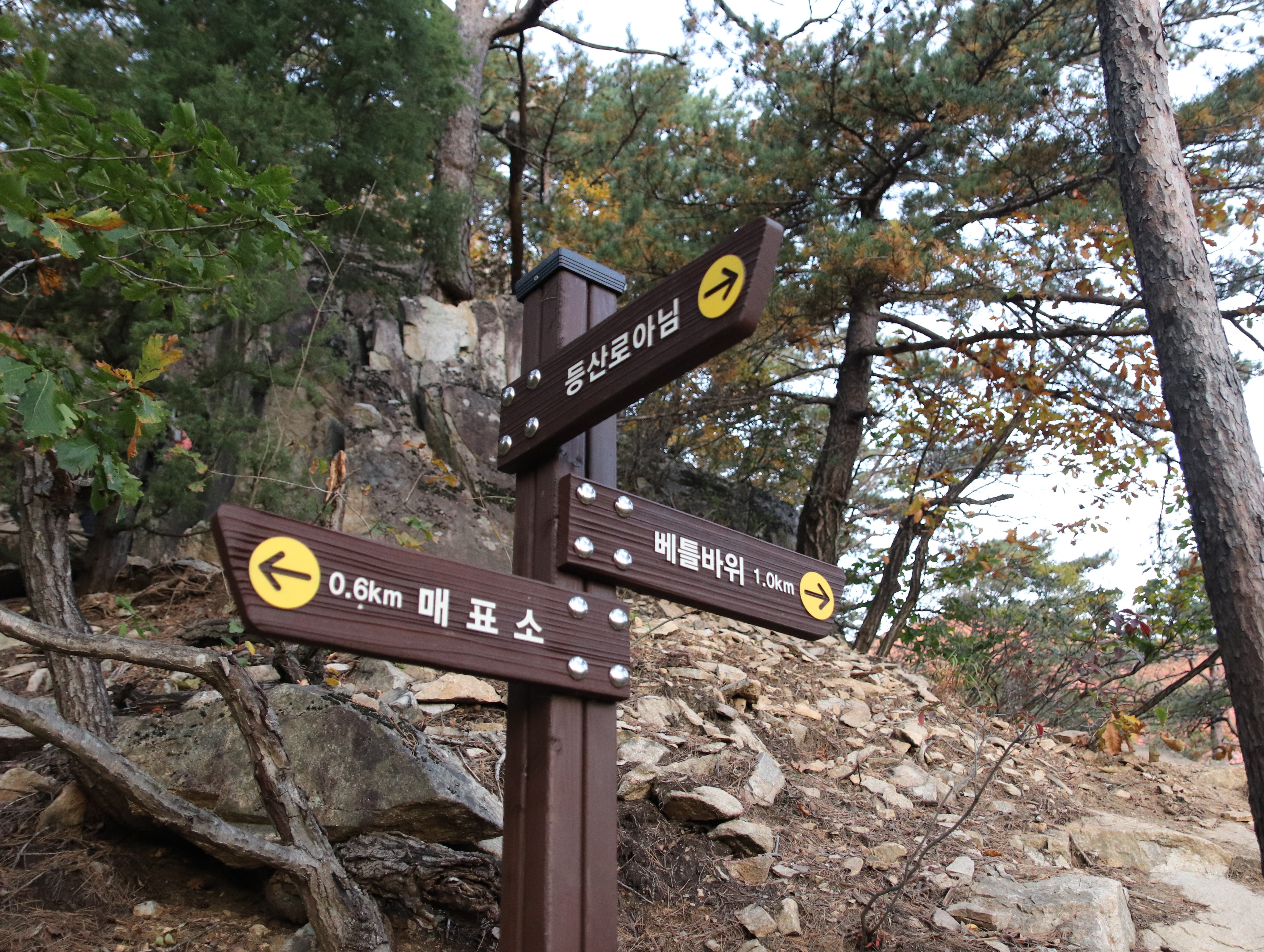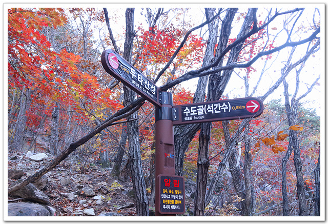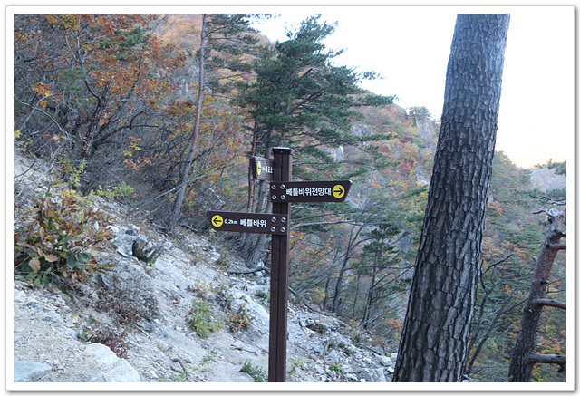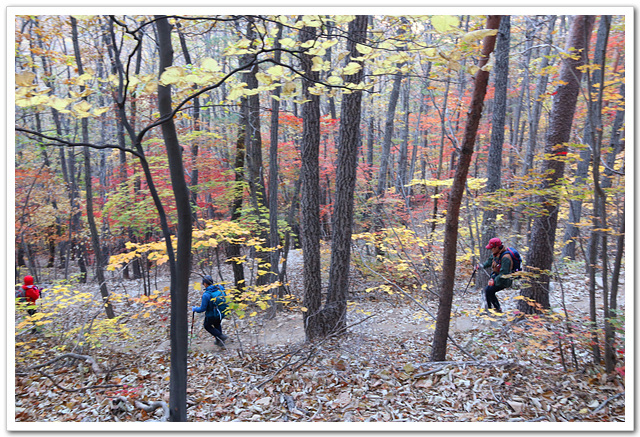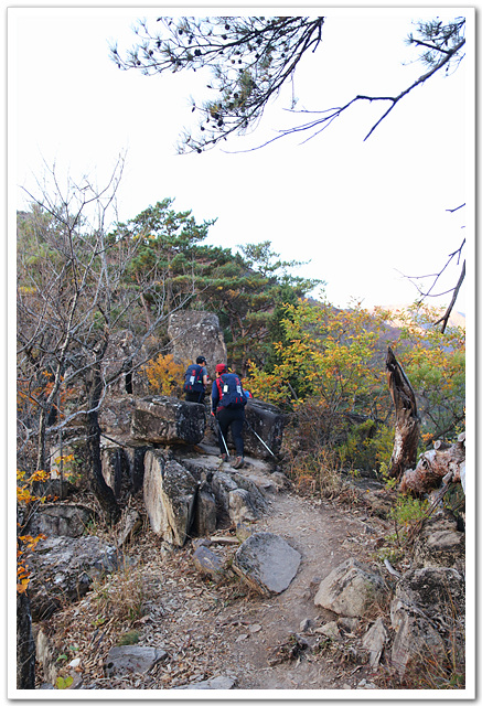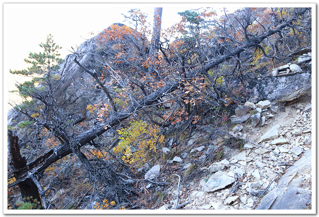 미륵바위를 지나 두타산성이 얼마 남지 않았습니다. 금강송 군락을 지나며 알록달록 단풍이 깃든 길이 힘들지 않은 편안한 낭만의 길입니다 0.9km 지점