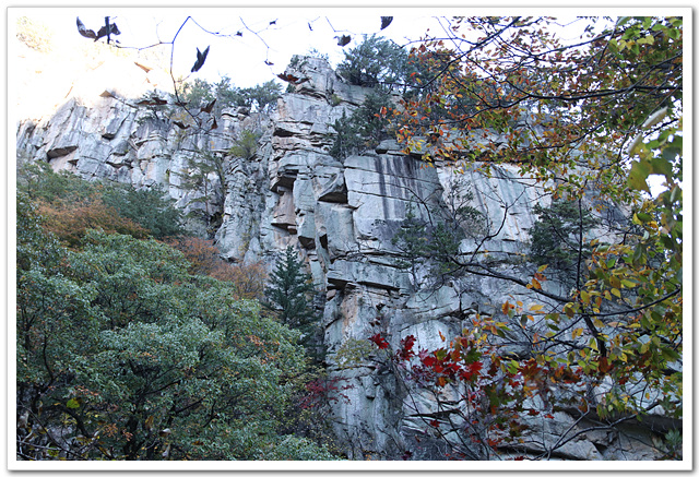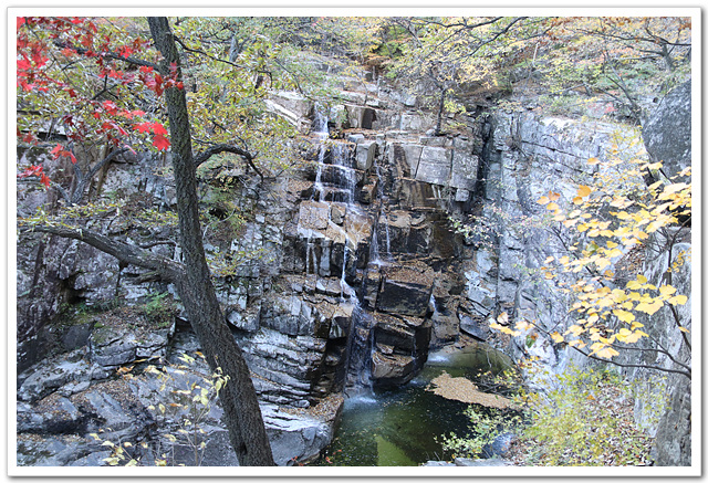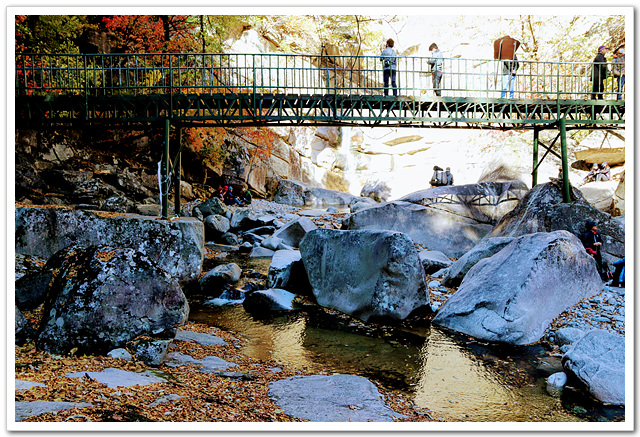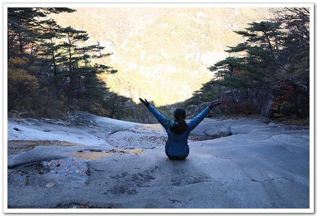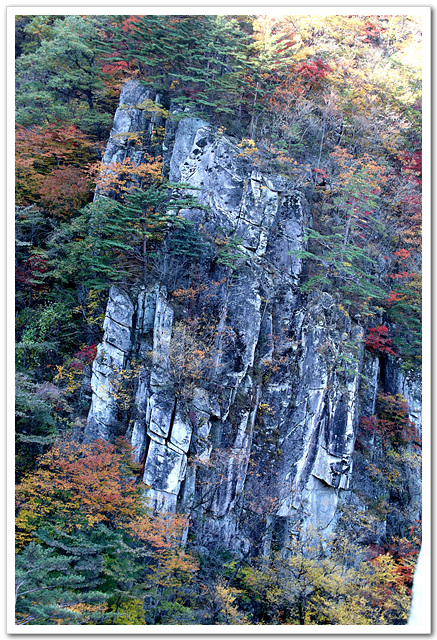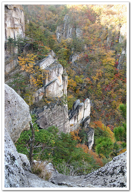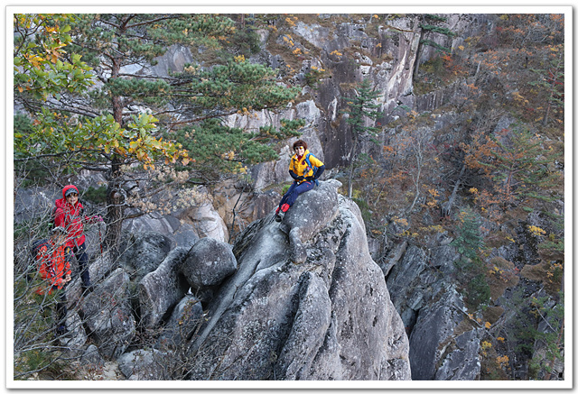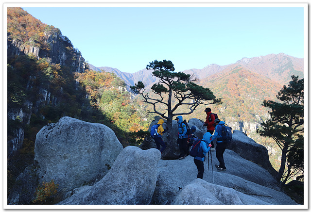 거북바위 모양이 마치 거북과 흡사하여 이름 지었으나 물개의 형상도 간직하고 있는 기암입니다. 뒤로는 12 폭포가 흘러내리고 아래로는 천 길의 벼랑이 아찔하게 보이고 주홍의 단풍과 어울리는 비경에 감탄합니다. 바람이 순간적으로 워낙 강하게 불어 몸이 휘청 거릴 정도라 위험해 보였습니다.