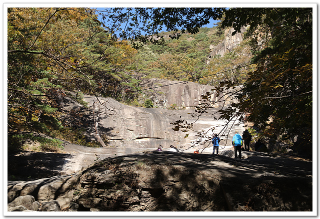 학소대 상류의 동굴에서 흐르는 물줄기가 이곳을 흘러내려 학이 둥지를 틀고 살았다는 '학소대'를 지납니다, 지금은 마른 대슬랩으로 보이지만 비가 많이 오면 물줄기가 흘러 내려 장관을 이룹니다.