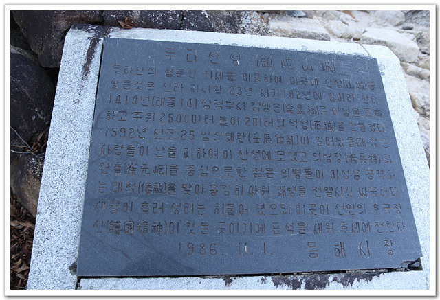 두타산성 임진왜란 시 산성의 축조 배경과 아픈 역사와 왜적을 물리친 승전보를 안내하는 비문이 있습니다.