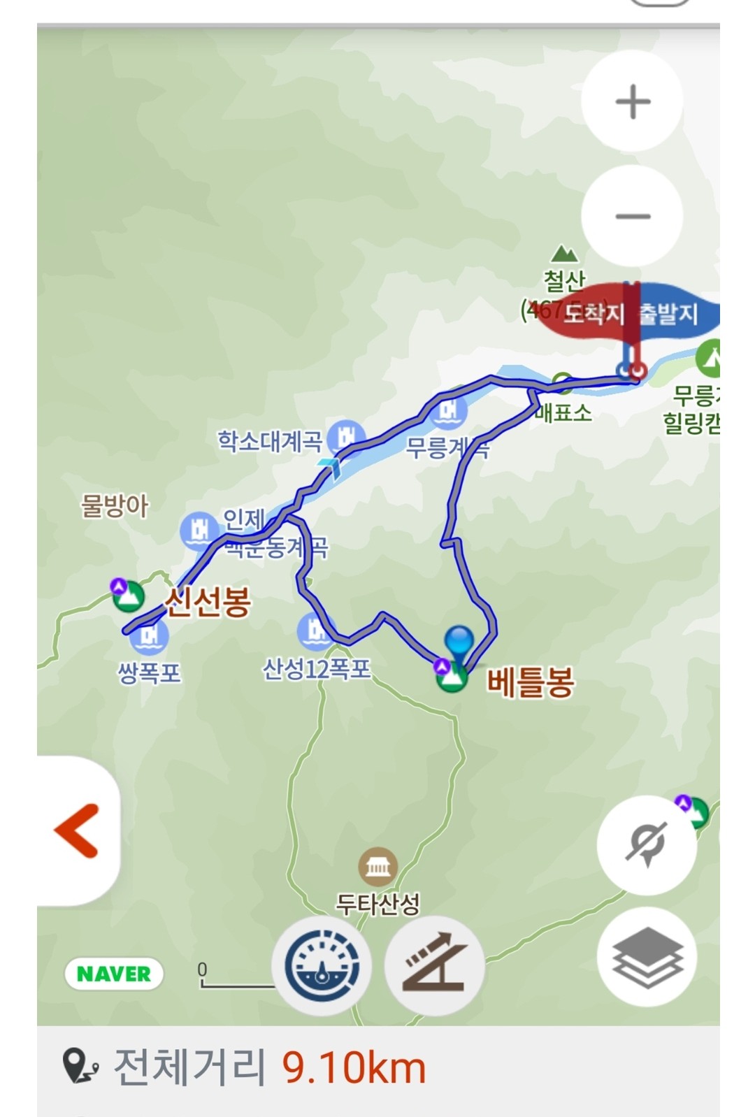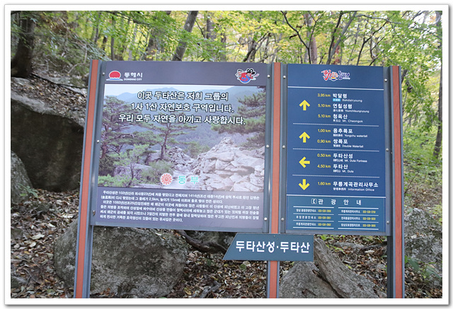 산행코스 : 무릉계곡주차장 - 베틀바위 전망대 - 미륵바위 - 거북바위 - 두타산성 - 쌍폭포 - 용추폭포 - 학소대 - 삼화사 - 무릉계곡 주차장 약 9.1km 4시간 소요
